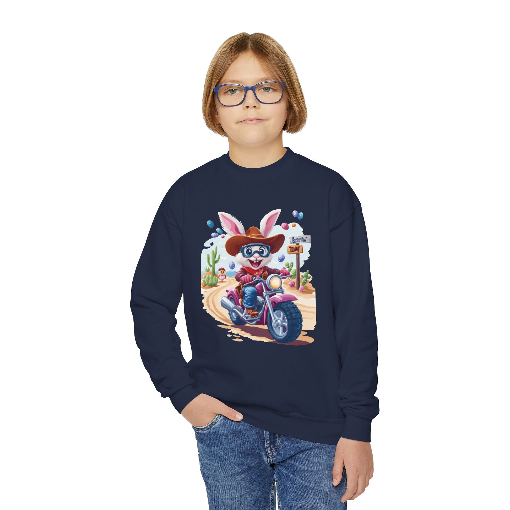 Biker Bunny Youth Sweatshirt - Fun Easter Bunny Riding Motorcycle, Cute Spring Gift for Kids, Playful Holiday Crewneck for Boys & Girls
