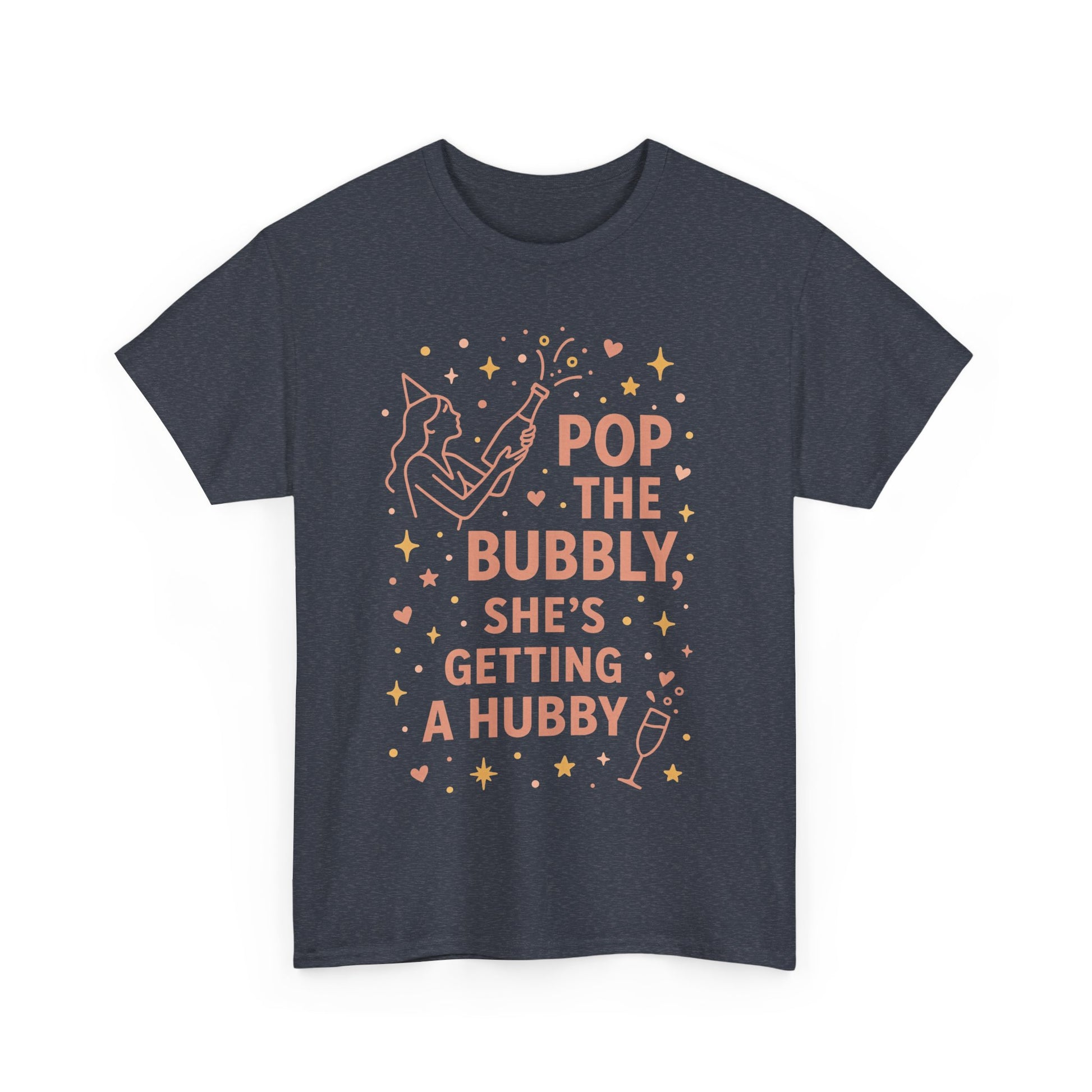 Introducing our stylish Unisex Heavy Cotton Tee, perfect for celebrating love and friendship! This fun and lighthearted shirt features a catchy design that reads, "Pop the Bubbly, She's Getting a Hubby," making it an ideal choice for bridal parties, bachelorette celebrations, or even cozy get-togethers with friends. The relaxed fit and soft fabric ensure that you stay comfortable while making a statement. Perfect for any casual event, this tee is a must-have for brides-to-be and their loved ones. Wear it to parties, gatherings, or just around the house while toasting to new adventures! Product features - Shoulder tape for added stability and durability. - Seamless design for reduced fabric waste. - Ribbed collar retains its shape and elasticity. - Crafted from strong and smooth cotton fibers. - Ethically produced and certified for safety and quality. Care instructions - Non-chlorine: bleach as needed - Do not iron - Do not dryclean - Machine wash: cold (max 30C or 90F) - Tumble dry: low heat