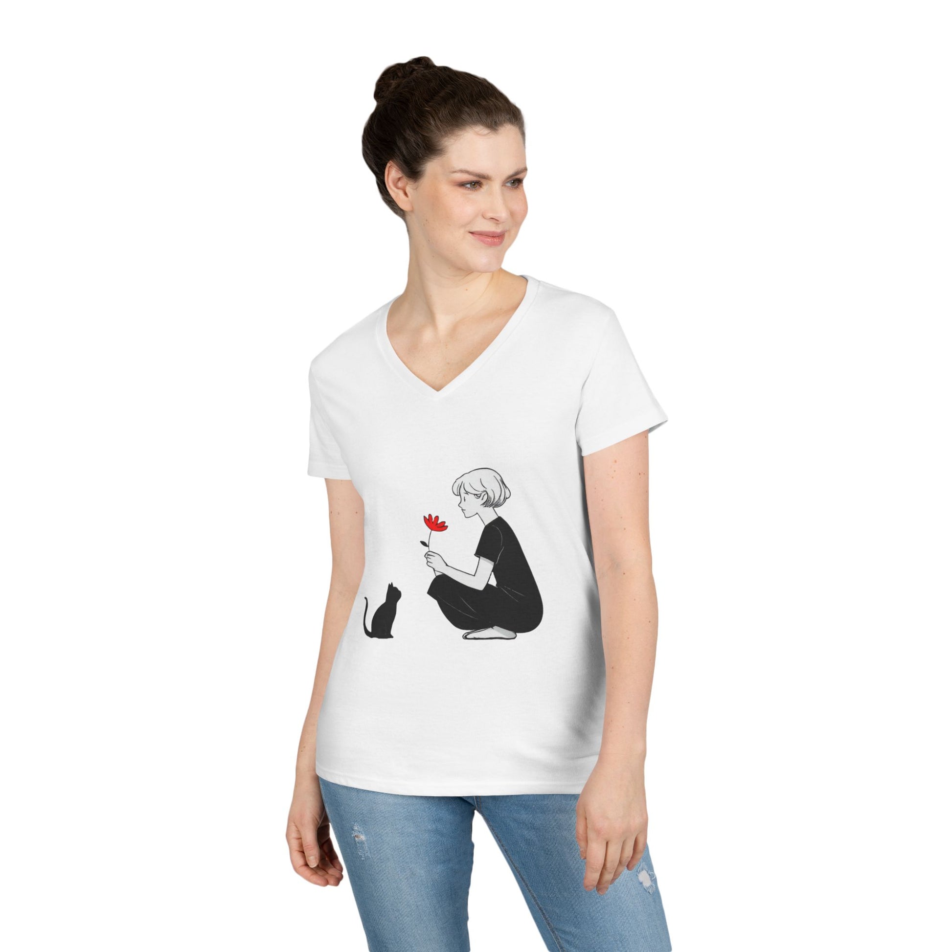 Discover the perfect blend of style and comfort with this Ladies' V-Neck T-Shirt. It exudes a relaxed yet chic vibe, ideal for casual outings or cozy days at home. This t-shirt features a beautiful design that speaks to cat lovers and those who appreciate whimsical art. Perfect for everyday wear, it adds a touch of personality to any outfit. Whether you're celebrating a birthday, looking for a thoughtful gift during the holidays, or simply treating yourself, this t-shirt is a great choice. It's a wonderful addition to anyone's wardrobe, especially for those who adore relaxed fashion with a unique twist. Product features - Ribbed knit collar keeps its shape - Shoulder tape for extra durability - Double needle sleeve and hem for longevity - Made from soft, breathable 100% cotton - Semi-fitted for a flattering silhouette Care instructions - Machine wash: cold (max 30C or 90F) - Do not bleach - Do not tumble dry - Iron, steam or dry: low heat - Do not dryclean