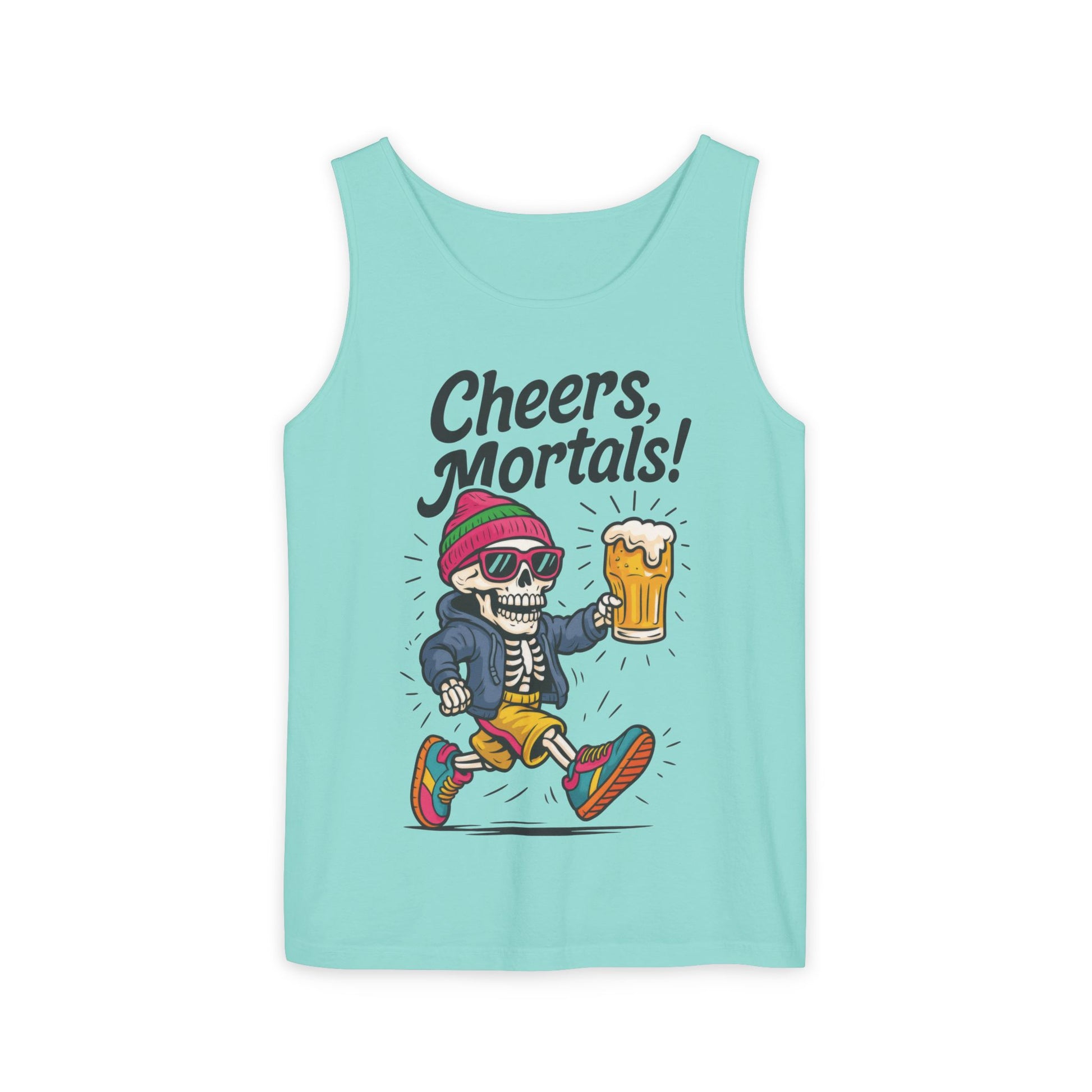 Cheers Mortals! Mens Tank Top, Funny Skeleton Beer Graphic Tee, Drinking Humor Shirt, Party Gift for Him, Halloween Tank, Beer Lovers Gift