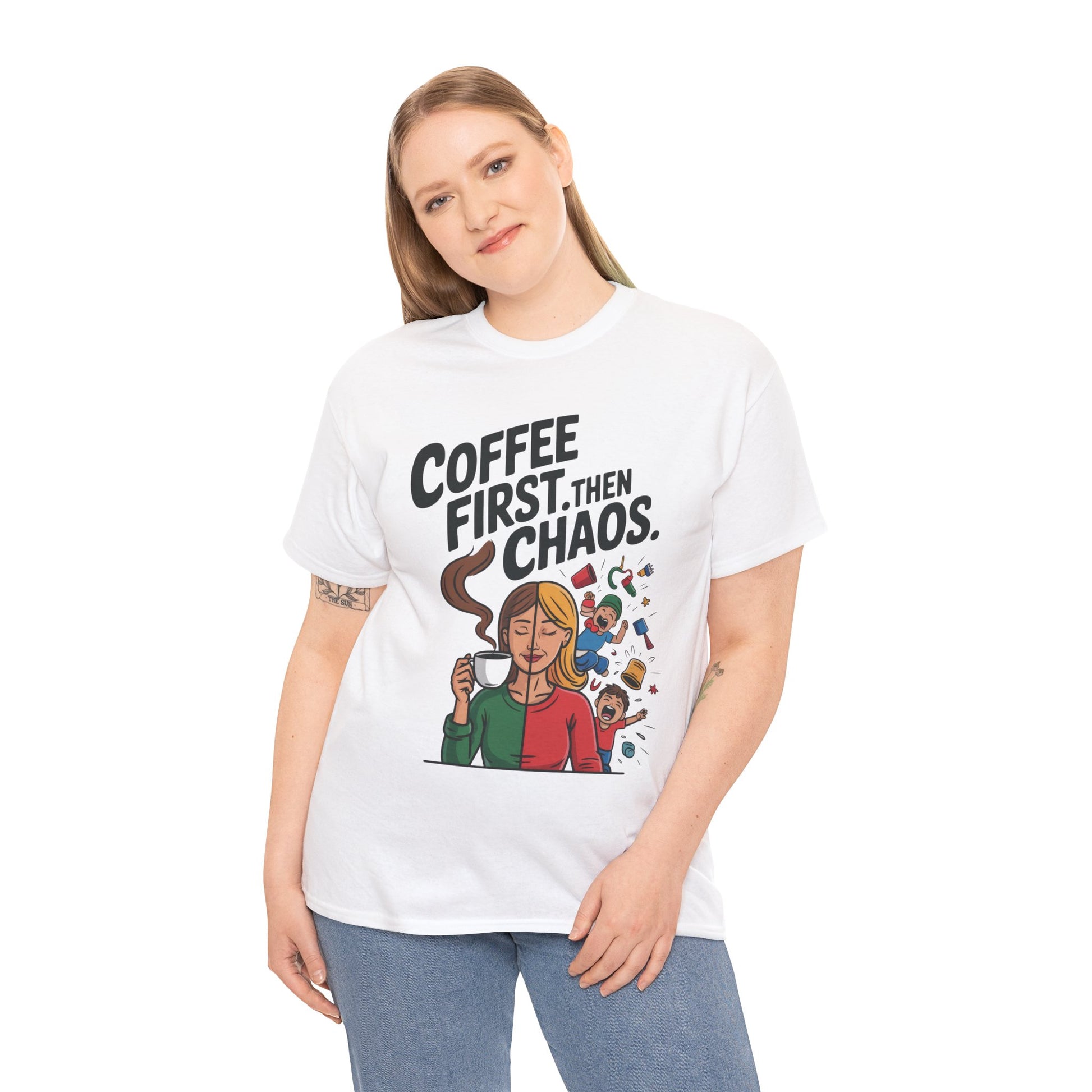 Introducing the perfect unisex heavy cotton tee that brings a splash of fun to your everyday wardrobe! This shirt features a playful design that says, "Coffee First. Then Chaos," making it an ideal choice for coffee lovers and anyone who embraces the cheerful chaos of daily life. Crafted from soft, breathable fabric, it offers year-round comfort and can easily transition from casual outings to semi-formal gatherings. It's perfect for gifts on occasions like birthdays, Christmas, or even just to show appreciation for friends and family who thrive on caffeine. The classic fit and timeless crew neckline ensure that you’ll look good while staying cozy, making it a must-have addition to any wardrobe! Product features - Shoulder tape for added stability - Seamless body for a sleek look - Elastic ribbed knit collar holds its shape - High-quality fabric for vibrant prints - Ethically made with 100% US cotton Care instructions - Non-chlorine: bleach as needed - Do not iron - Do not dryclean - Machine wash: cold (max 30C or 90F) - Tumble dry: low heat