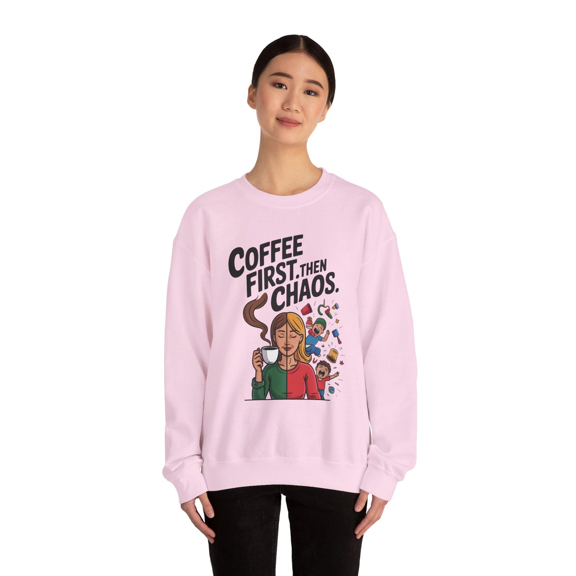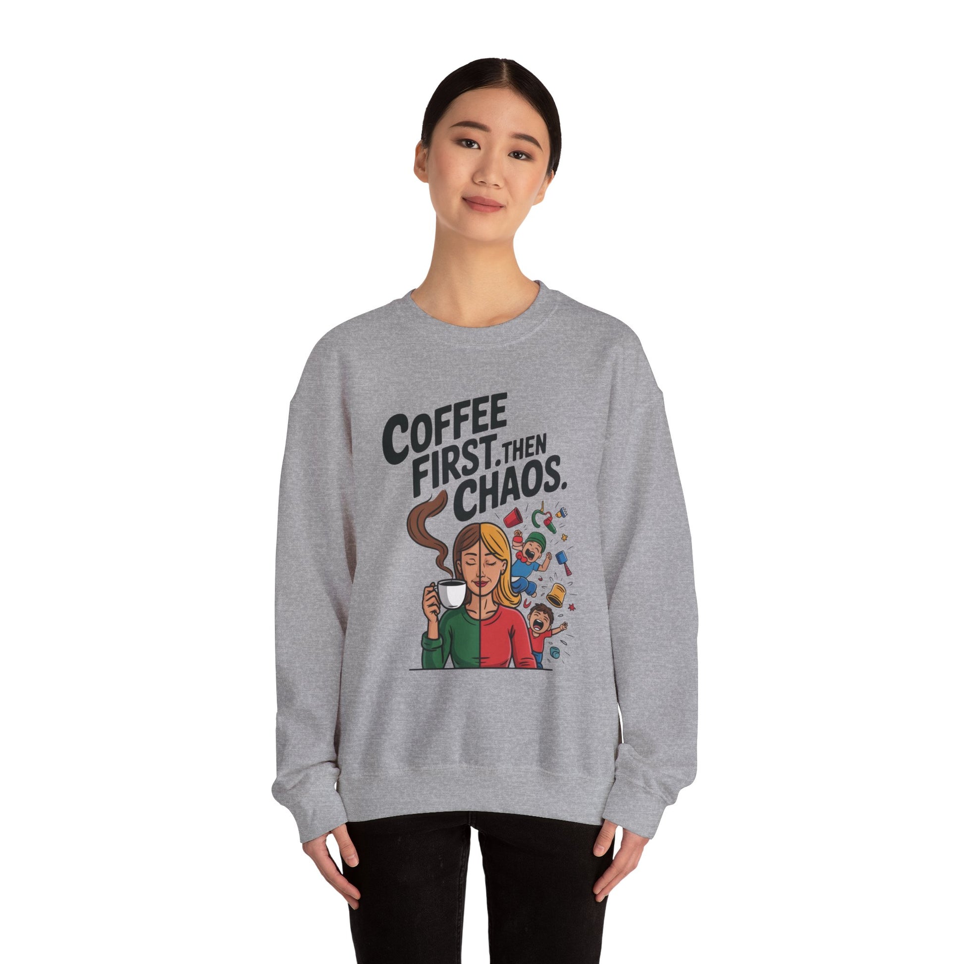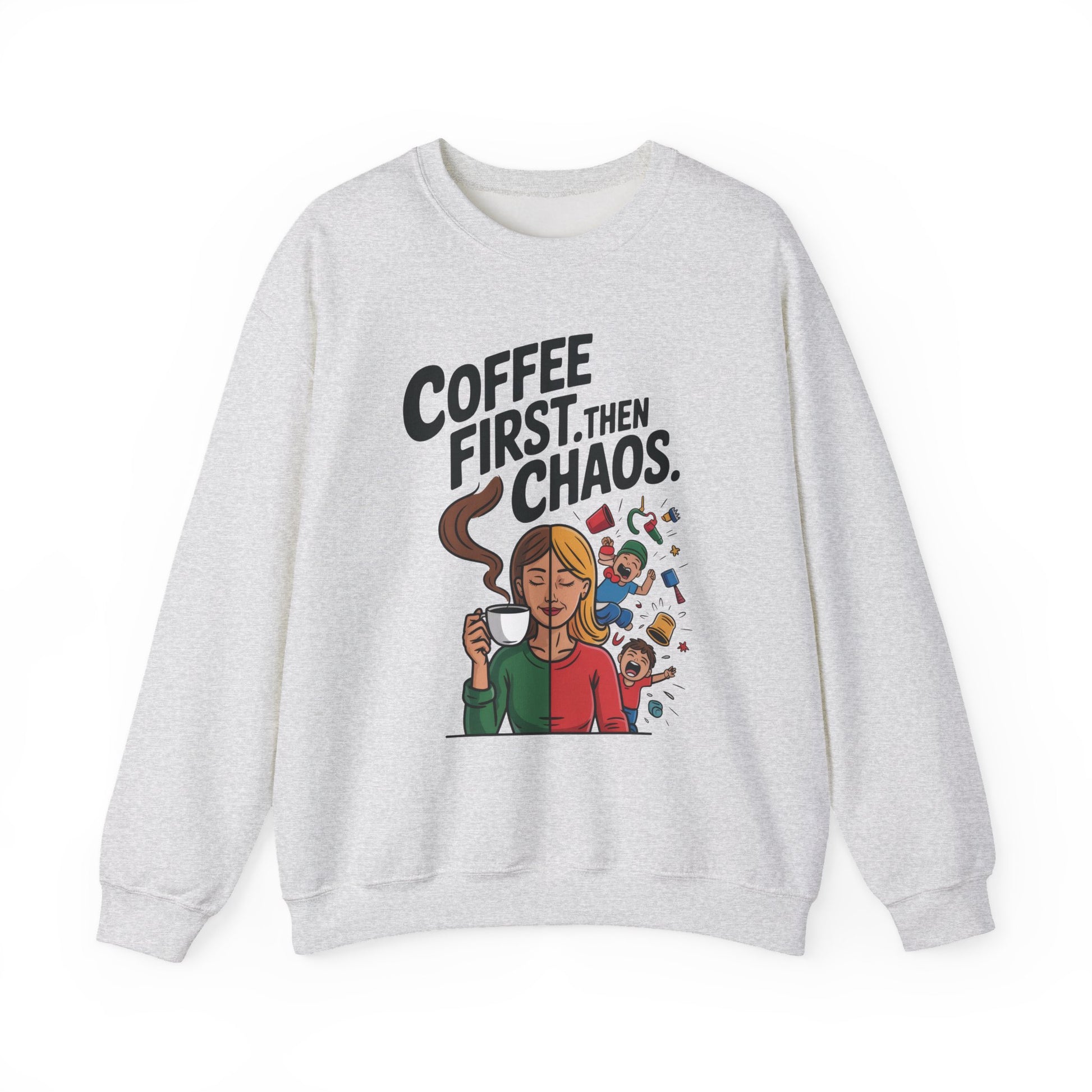 Introducing our cozy Unisex Heavy Blend™ Crewneck Sweatshirt, perfect for those who love a blend of comfort and style! Featuring a fun and quirky graphic design that reads “Coffee First. Then Chaos.”, this sweatshirt brings a light-hearted vibe to your wardrobe. It’s ideal for coffee lovers and busy individuals navigating the daily hustle and bustle. Whether you're lounging at home, grabbing a coffee, or out with friends, this piece effortlessly melds into your casual life. This sweatshirt is perfect for celebrating National Coffee Day, as well as a great gift for birthdays, holidays, or just because! Its classic fit and soft fabric ensure all-day comfort, making it a must-have for anyone who appreciates a good cup of coffee and a dash of humor in their fashion. Stay warm and stylish while embracing the chaos of life with this wonderfully designed sweatshirt! Product features - Knit in one piece to reduce fabric waste. - Elastic ribbed knit collar retains shape. - Available embroidery placement on chest for personalization. - Durable construction with double-needle stitching. - Ethically made with 100% US-grown cotton. Care instructions - Machine wash: cold (max 30C or 90F) - Non-chlorine: bleach as needed - Tumble dry: low heat - Do not iron - Do not dryclean
