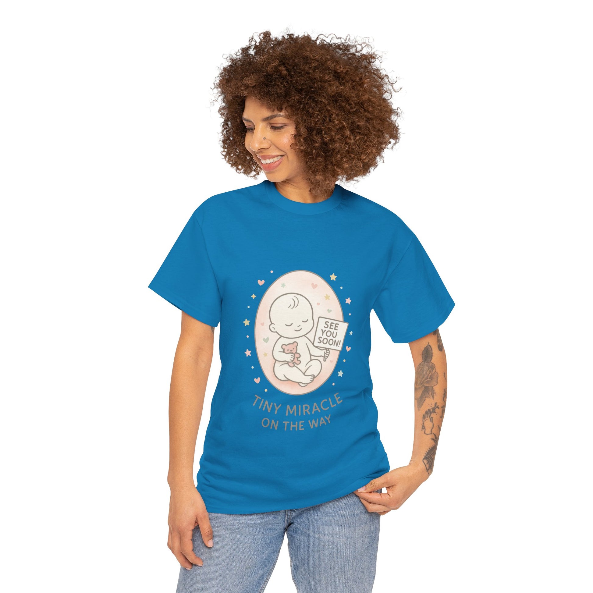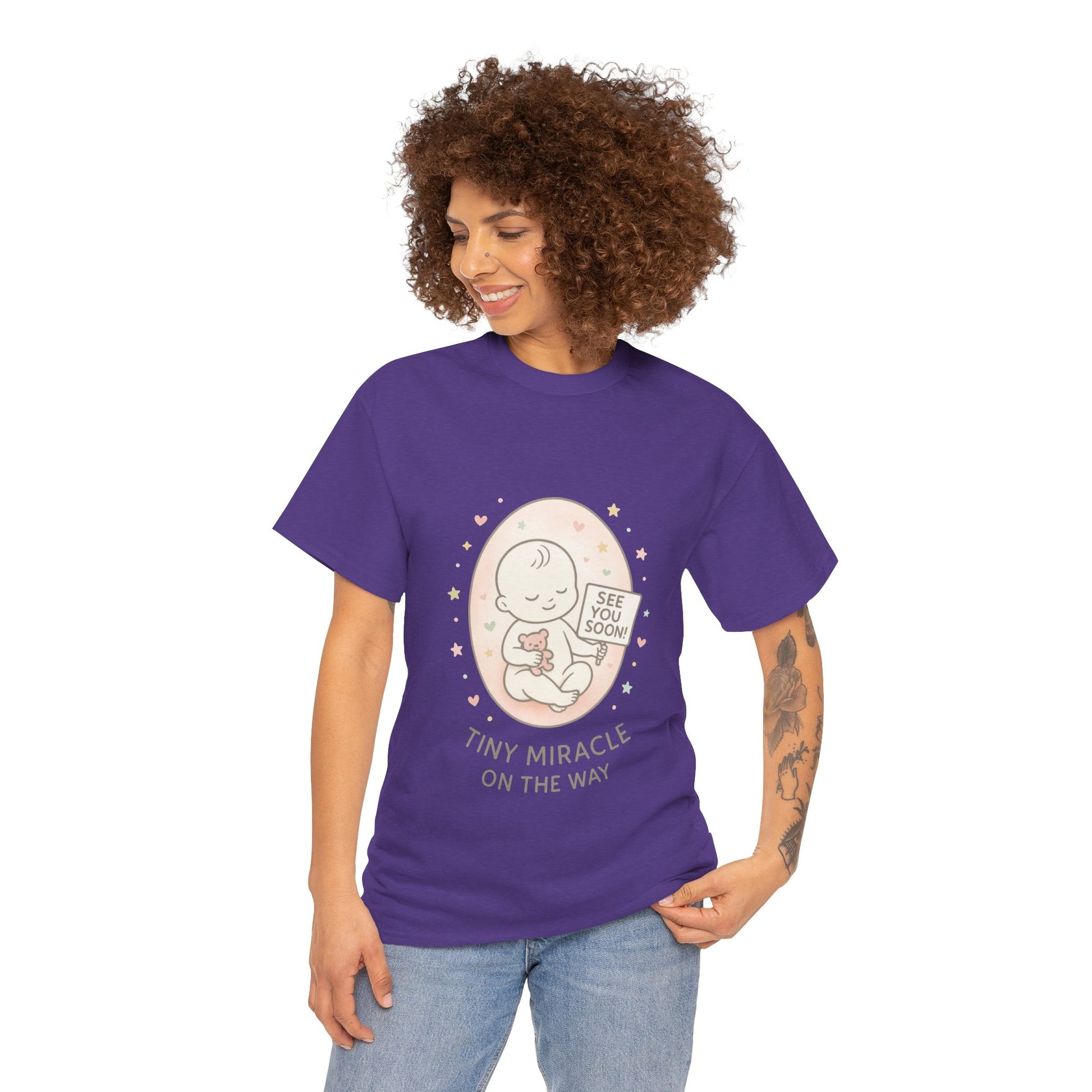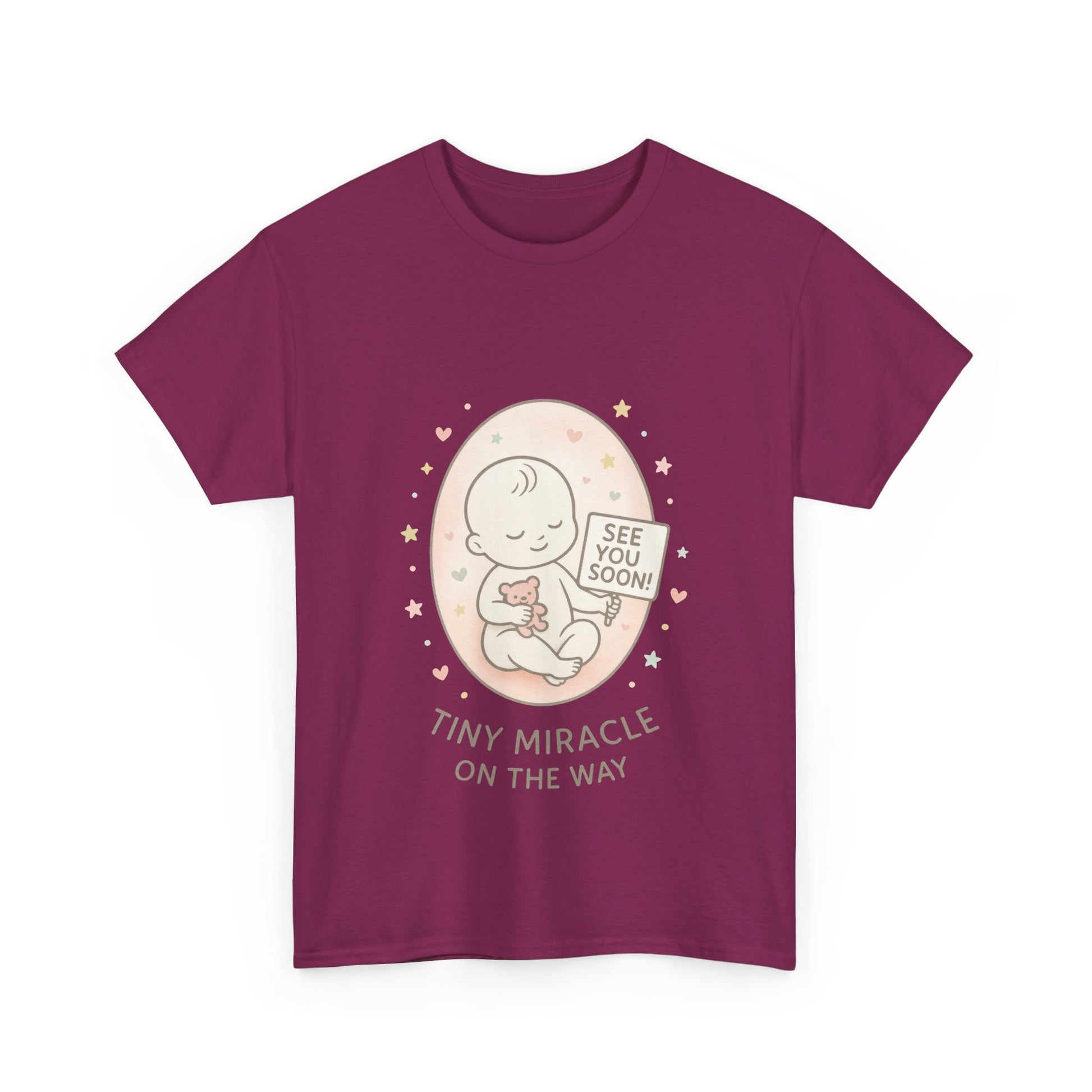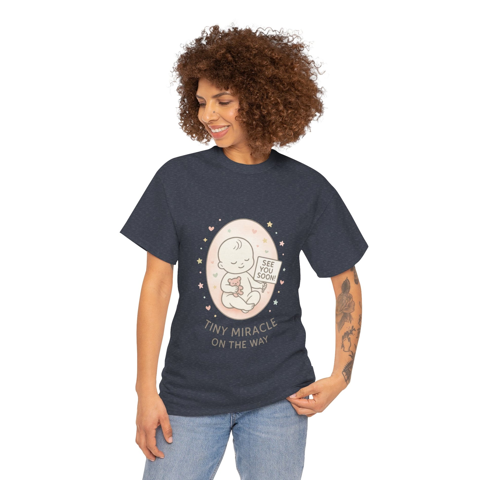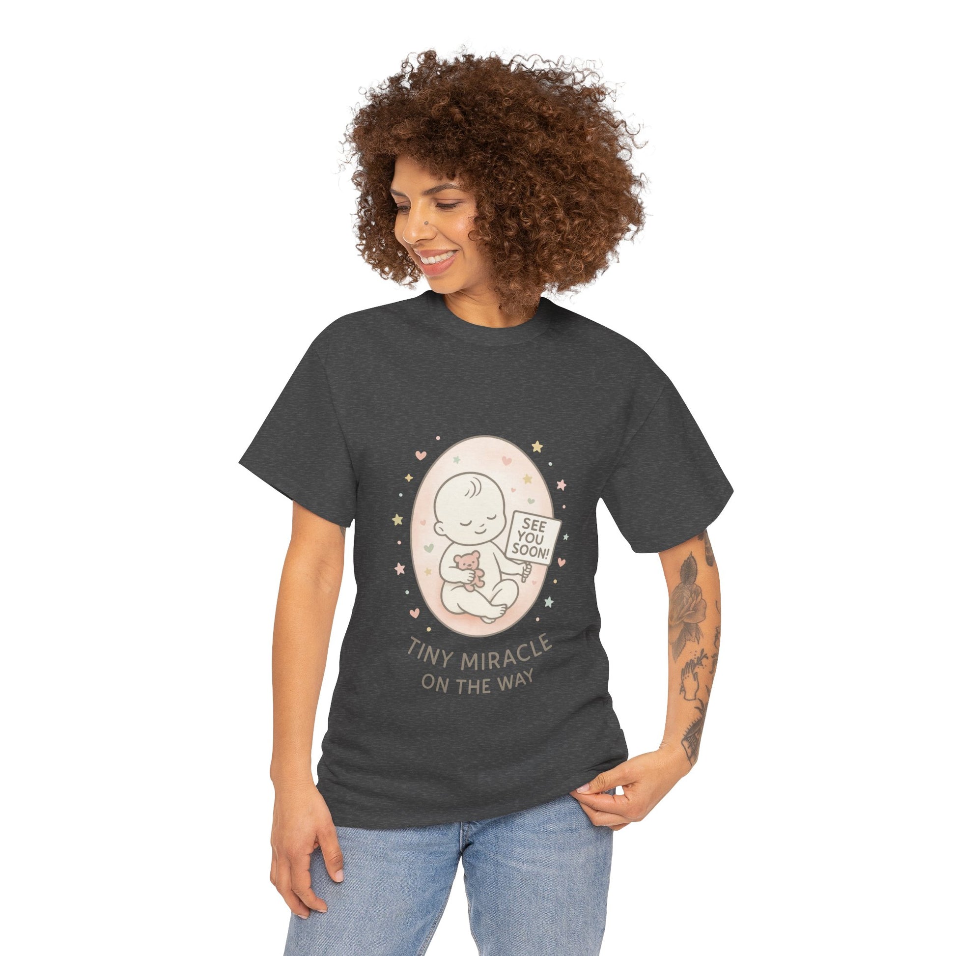 Introducing the perfect Unisex Heavy Cotton Tee for celebrating life's special moments! This shirt radiates warmth and joy, making it ideal for expectant parents as they await their tiny miracle. Whether you're hosting a baby shower, revealing pregnancy to loved ones, or simply enjoying a casual day out, this tee brings a delightful touch to any occasion. Comfortable and stylish, it effortlessly fits into everyday life, allowing you to express your excitement and anticipation while keeping it chic and relaxed. Perfect for birthdays, baby announcements, or just to indulge in your personal style! Product features - Shoulder tape for enhanced durability and stability. - Seamless design for a sleek and attractive look. - Elastic ribbed collar retains its shape wash after wash. - Crafted from strong, smooth fabric ideal for printing. - Ethically made with 100% US cotton, ensuring softness and sustainability. Care instructions - Non-chlorine: bleach as needed - Do not iron - Do not dryclean - Machine wash: cold (max 30C or 90F) - Tumble dry: low heat