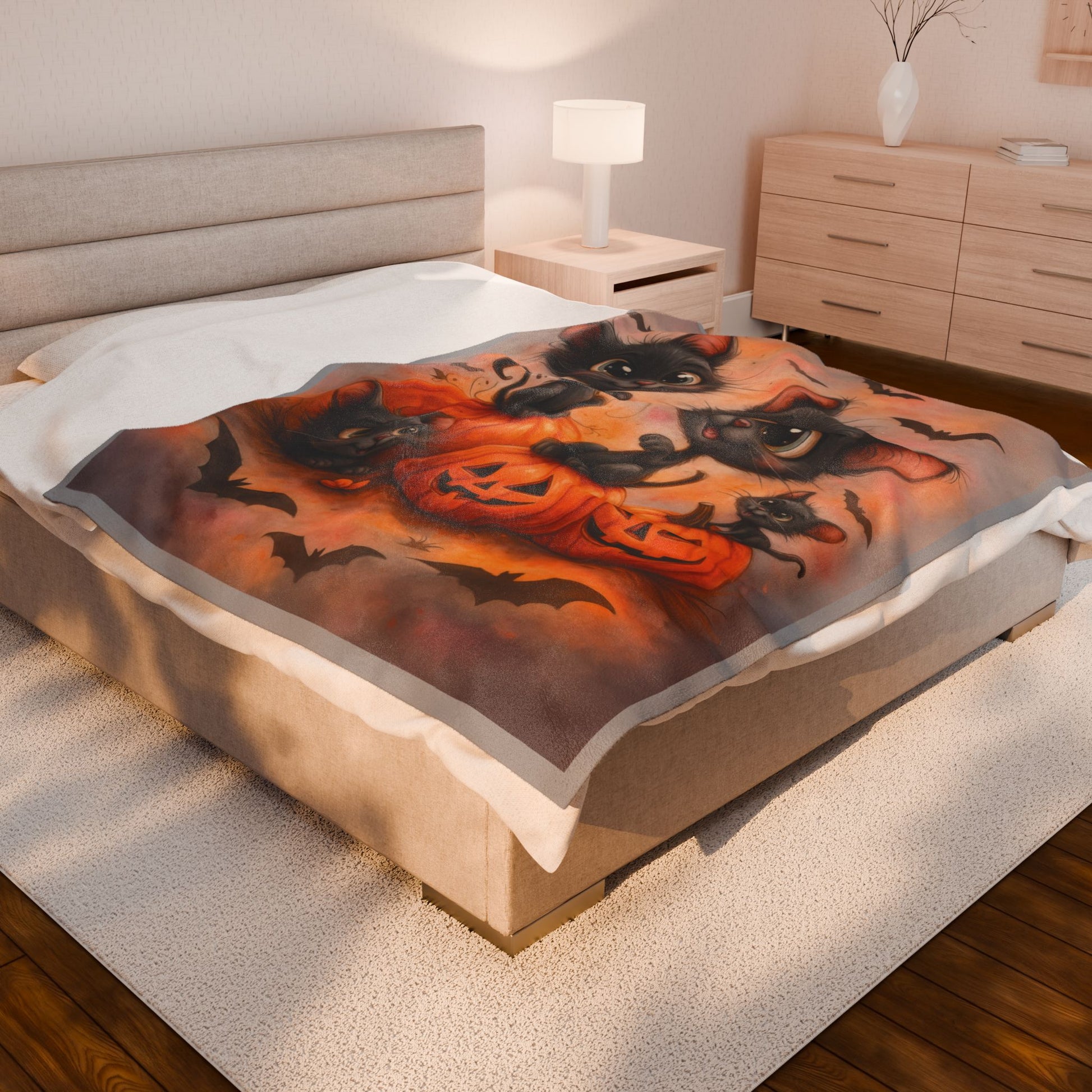 Cute Black Cats and Pumpkins Halloween Velveteen Plush Blanket, Cozy Fall Throw, Soft Cat Lover Gift, Kawaii Halloween Decor