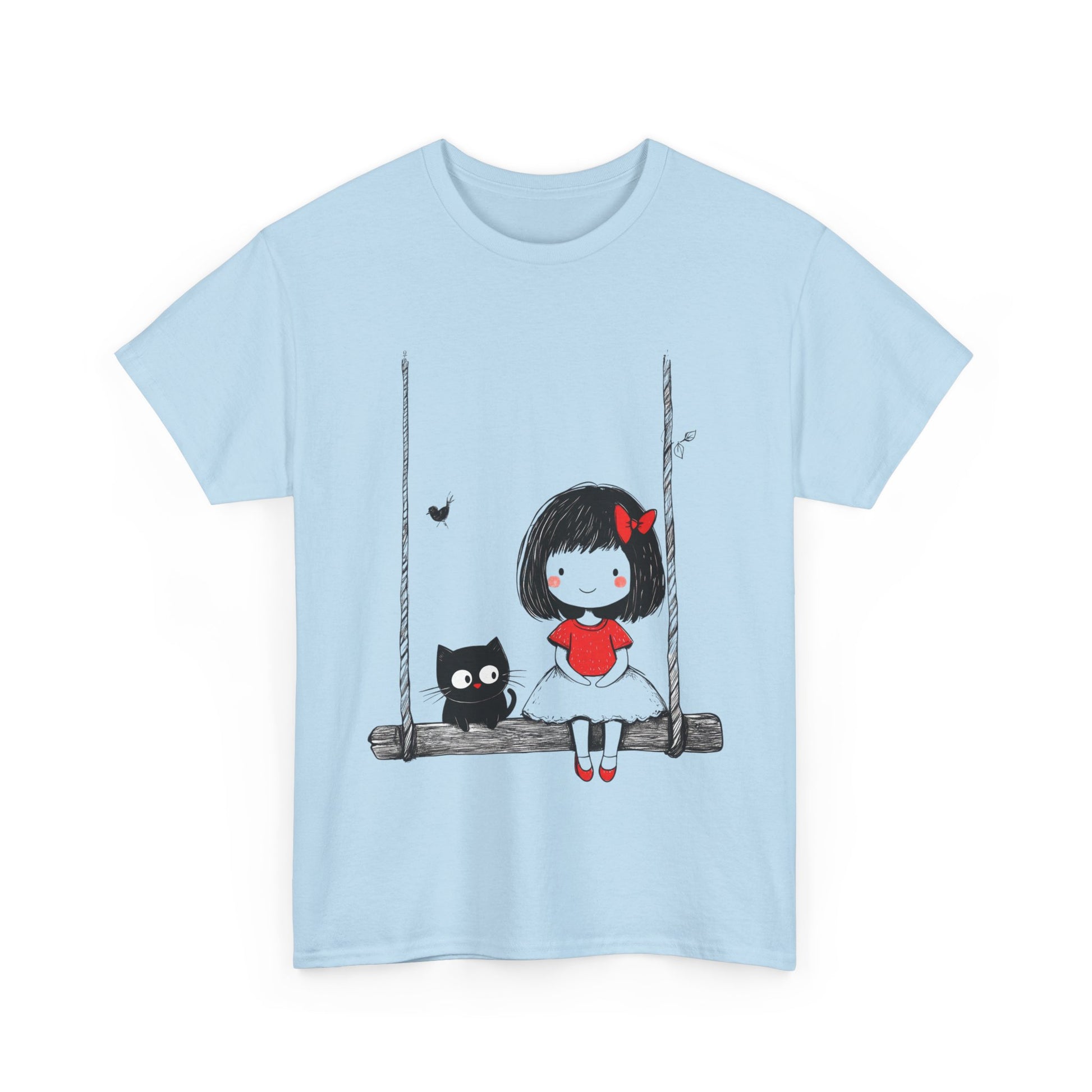 Introducing our charming Unisex Heavy Cotton Tee, perfect for bringing a bit of whimsy to your everyday attire. Featuring a delightful illustration of a girl on a swing alongside her feline friend, this tee radiates a fun and playful vibe. Whether you’re lounging at home, enjoying a casual outing with friends, or dressing down for a laid-back day at the office, this shirt fits seamlessly into any wardrobe. Ideal for animal lovers, art enthusiasts, or anyone who appreciates unique designs, it makes a thoughtful gift for birthdays, celebrations, or just because! Celebrate everyday moments with this cheerful tee during holidays or casual gatherings. Product features - Shoulder tape for durability and comfort - Seamless design reduces fabric waste - Elastic ribbed knit collar retains shape - High-quality, smooth fabric perfect for printing - Ethically made with 100% US cotton Care instructions - Non-chlorine: bleach as needed - Do not iron - Do not dryclean - Machine wash: cold (max 30C or 90F) - Tumble dry: low heat