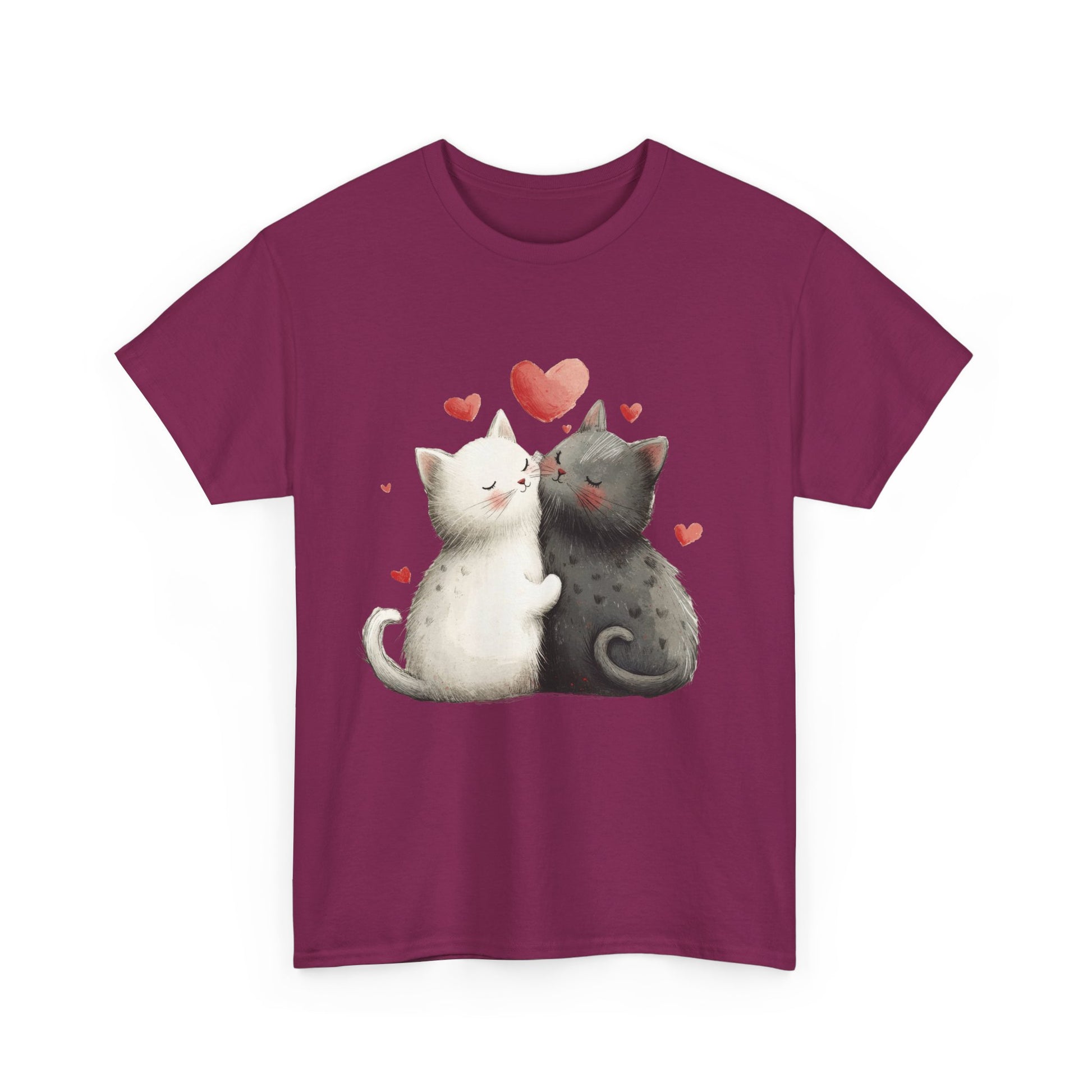 Celebrate love and connection with this adorable **Unisex Heavy Cotton Tee** featuring two sweet cats sharing a kiss surrounded by hearts. This delightful shirt adds a playful touch to your wardrobe, perfect for casual outings, date nights, or cozy days at home. Whether you're a cat lover or looking for a gift for a friend, this tee brings warmth and positivity to any occasion. It’s great for Valentine's Day, anniversaries, or just to show appreciation for the ones you love. Enjoy comfort and style with this charming design that fits effortlessly into your everyday life. Product features - Shoulder tape for stability and comfort. - Seamless design reduces fabric waste. - Elastic ribbed knit collar retains shape. - Made from durable, smooth cotton fabric. - Classic fit ensures a relaxed and stylish look. Care instructions - Non-chlorine: bleach as needed - Do not iron - Do not dryclean - Machine wash: cold (max 30C or 90F) - Tumble dry: low heat