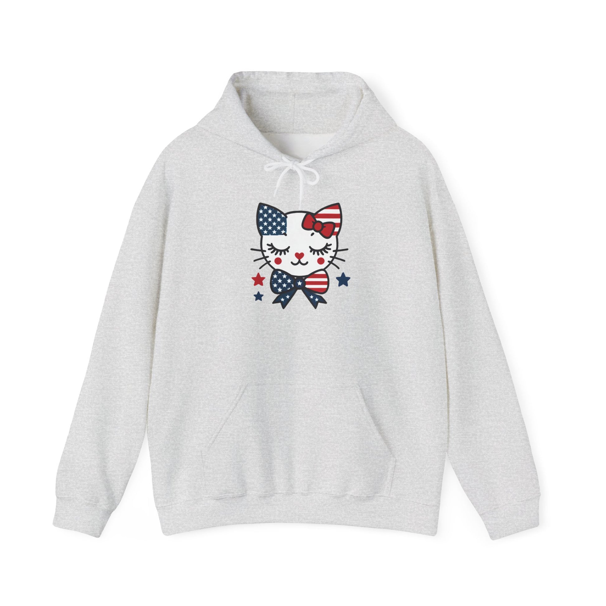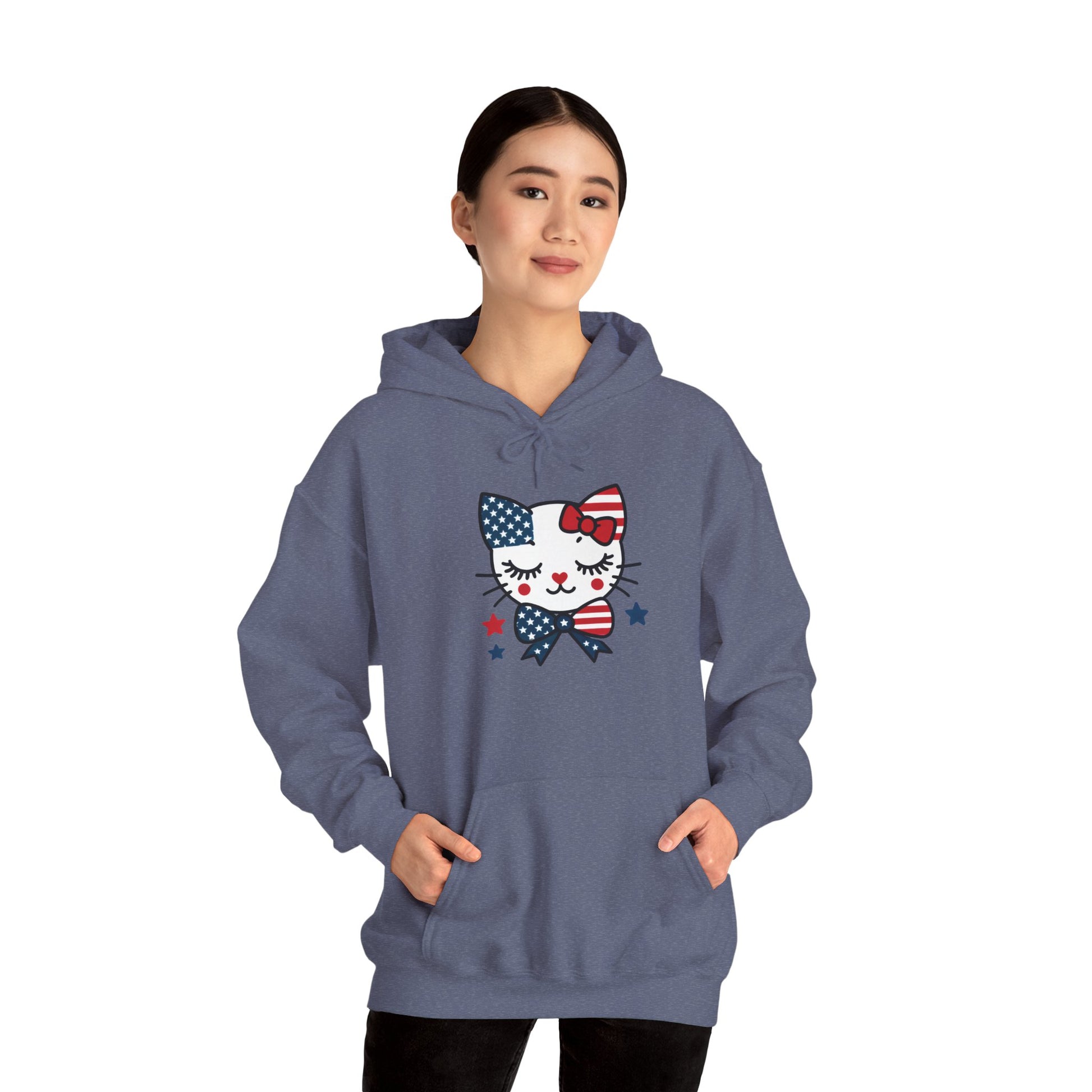 Introducing the perfect unisex heavy blend hoodie, designed to bring warmth and style to your daily wardrobe. This cozy piece is perfect for lounging at home, casual outings, or even a fun day out with friends. It features an adorable design that gives off a cheerful and playful vibe, making it an ideal addition for anyone who loves unique fashion. Perfect for cat lovers, this hoodie is a delightful gift for birthdays, holidays, or just because! Celebrate special occasions like Independence Day with its charming patriotic touch, or simply enjoy it during the cooler months for that warm, comfortable feel. Whether you're a fan of quirky designs or looking for a new favorite hoodie, this is an essential item for all ages. Product features - Spacious kangaroo pouch pockets for warmth and convenience. - Adjustable drawstring hood for a personalized fit. - Knitted seamlessly to reduce fabric waste and enhance appearance. - Crafted from a durable 50% cotton and 50% polyester blend for ultimate comfort and resilience. - Available with DTF prints or embroidery for a unique touch. Care instructions - Tumble dry: medium - Iron, steam or dry: low heat - Do not dryclean - Machine wash: cold (max 30C or 90F) - Non-chlorine: bleach as needed