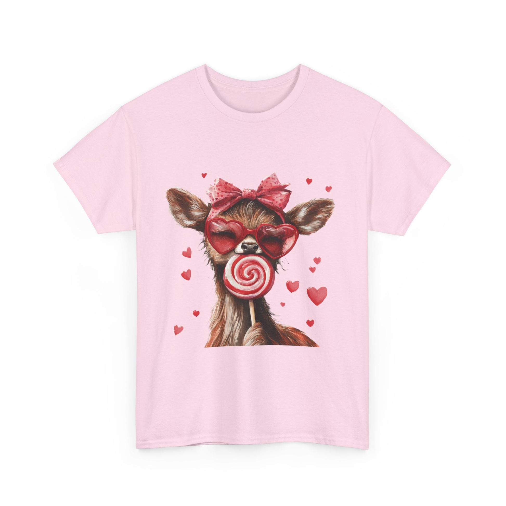Cute Deer with Heart Glasses and Lollipop, Valentine's Day Heavy Cotton Tee, Fun Animal Love Shirt Gift for Her, Animal Lovers Shirt