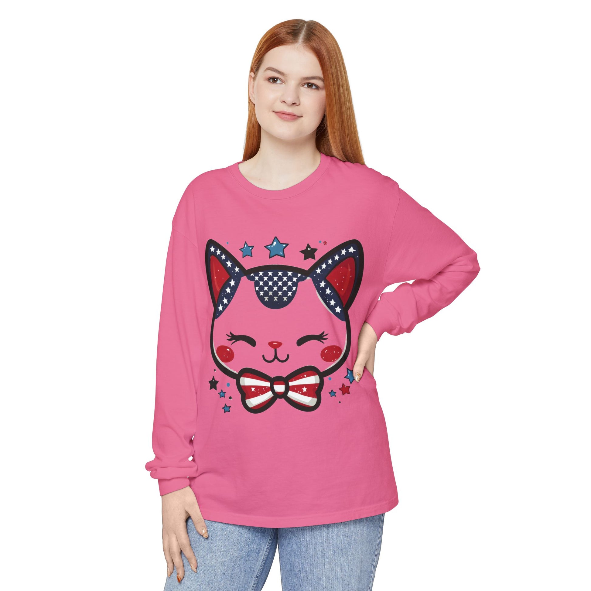 Embrace a delightful blend of comfort and style with this unisex garment-dyed long sleeve T-shirt. Designed for cat lovers and those who enjoy playful aesthetics, this shirt radiates a cheerful vibe, making it perfect for casual outings or cozy nights in. The soft color and unique design add a fun touch to any wardrobe. It’s ideal for gifting during holidays like the Fourth of July, fun celebrations, or anytime you want to spread joy. Whether you're lounging at home or out with friends, this T-shirt will surely become a favorite in your collection. Product features - Durable double needle sleeve and bottom hems for long-lasting wear. - Ribbed-knit cuffs retain shape and offer comfort. - Neck and shoulder tape prevents stretching and stabilizes the fit. - Garment-dyed fabric provides a soft texture and unique color. - Made from 100% ring-spun cotton for a smooth and strong finish. Care instructions - Machine wash: cold (max 30C or 90F) - Do not bleach - Tumble dry: low heat - Iron, steam or dry: low heat - Do not dryclean