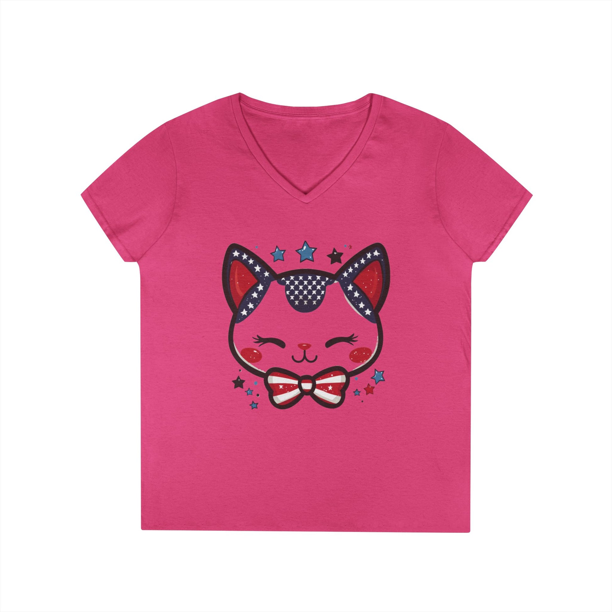 Cute Patriotic V-Neck T-Shirt, Women's Graphic Tee, Perfect for Cat Lovers, Perfect for Holidays and Fourth of July Celebrations