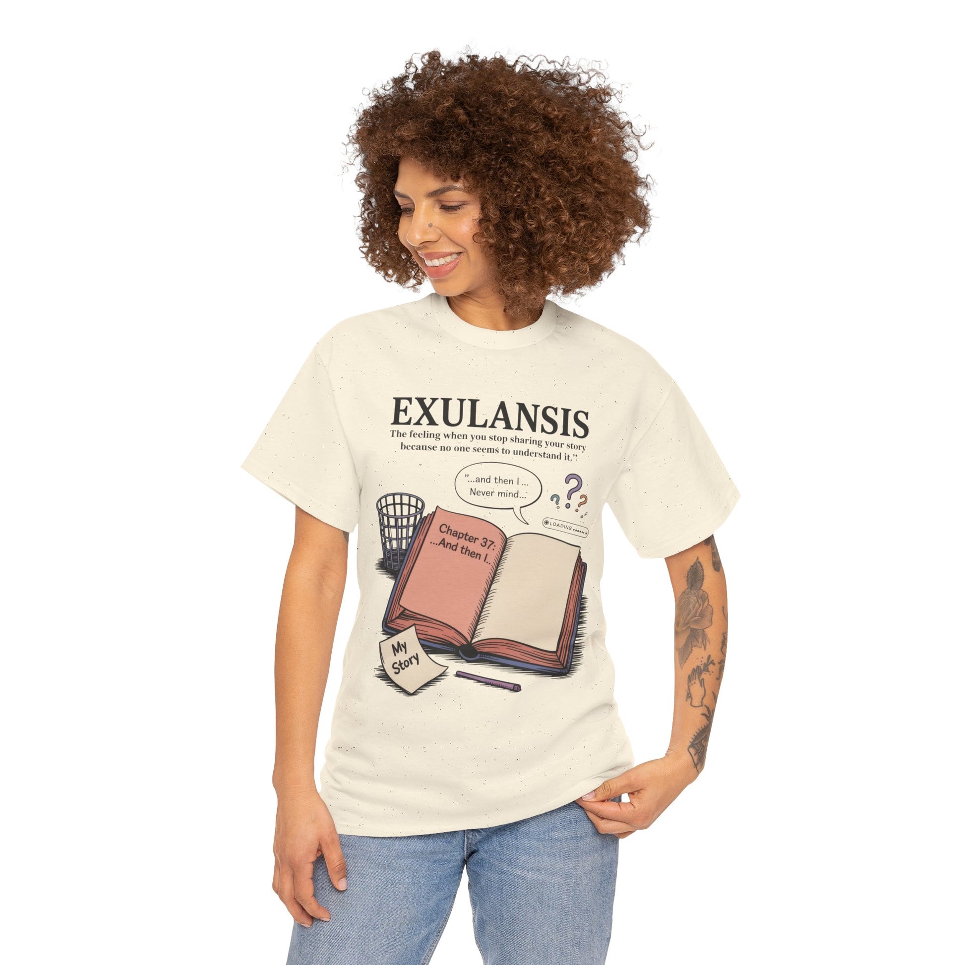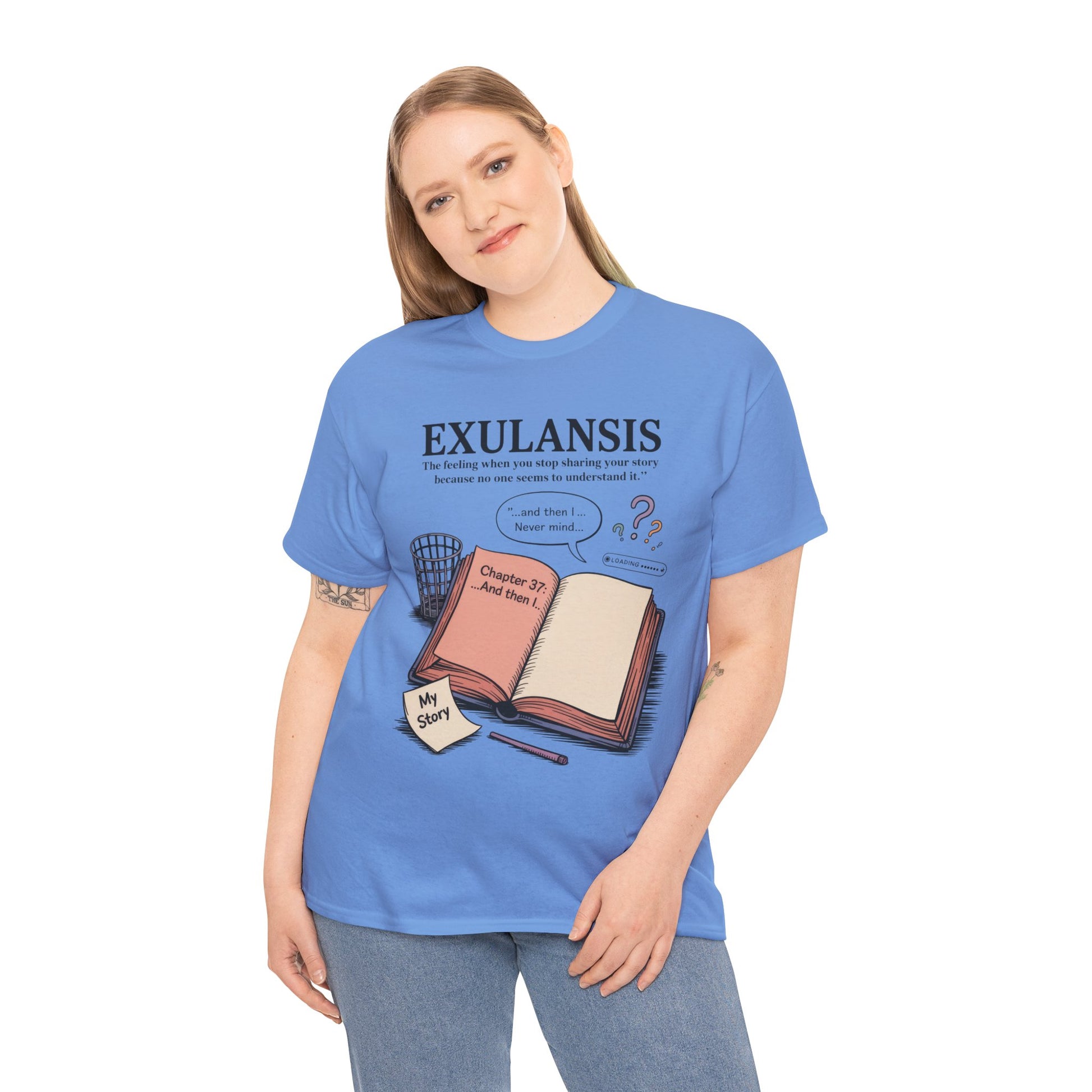 Introducing our unisex heavy cotton tee, perfect for those who love to share stories and express themselves. The playful design captures the essence of exulansis, the feeling of being understood through storytelling. Whether you're lounging at home, hitting a casual outing, or attending a relaxed gathering, this tee adds a touch of creativity to any outfit. It's great for writers, book lovers, or anyone who enjoys a good tale. Ideal for occasions like birthdays, literary events, or simply celebrating one’s personal narrative. Embrace comfort and style with a shirt that not only looks good but feels good too. This tee makes for a thoughtful gift for friends or family who appreciate art and expression, making it a perfect choice for holidays like Christmas, or as a unique present for literary events and writer workshops. Product features - Twill tape stabilizes shoulder seams to prevent stretching. - Seamless tubular knit reduces fabric waste and enhances appearance. - Ribbed knit collar retains shape for lasting comfort. - Crafted from strong, smooth fabric suitable for vibrant prints. - Ethically made with 100% US cotton for sustainability. Care instructions - Non-chlorine: bleach as needed - Do not iron - Do not dryclean - Machine wash: cold (max 30C or 90F) - Tumble dry: low heat