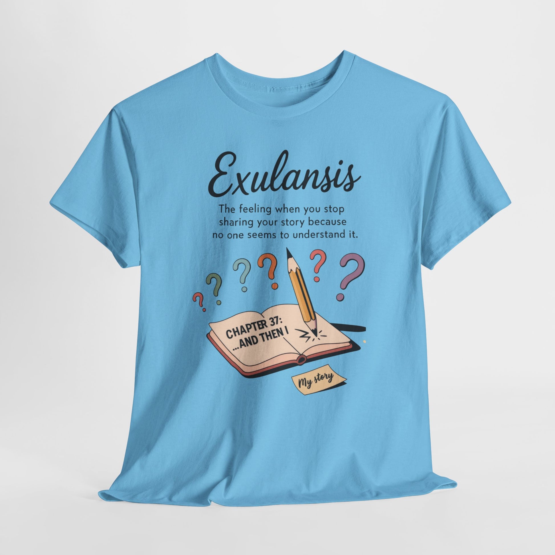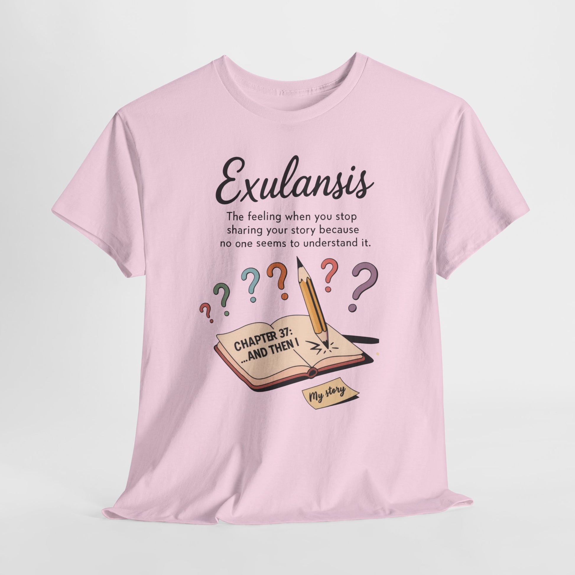 Introducing our unisex heavy cotton tee, perfect for those who love to share stories and express themselves. The playful design captures the essence of exulansis, the feeling of being understood through storytelling. Whether you're lounging at home, hitting a casual outing, or attending a relaxed gathering, this tee adds a touch of creativity to any outfit. It's great for writers, book lovers, or anyone who enjoys a good tale. Ideal for occasions like birthdays, literary events, or simply celebrating one’s personal narrative. Embrace comfort and style with a shirt that not only looks good but feels good too. This tee makes for a thoughtful gift for friends or family who appreciate art and expression, making it a perfect choice for holidays like Christmas, or as a unique present for literary events and writer workshops. Product features - Twill tape stabilizes shoulder seams to prevent stretching. - Seamless tubular knit reduces fabric waste and enhances appearance. - Ribbed knit collar retains shape for lasting comfort. - Crafted from strong, smooth fabric suitable for vibrant prints. - Ethically made with 100% US cotton for sustainability. Care instructions - Non-chlorine: bleach as needed - Do not iron - Do not dryclean - Machine wash: cold (max 30C or 90F) - Tumble dry: low heat