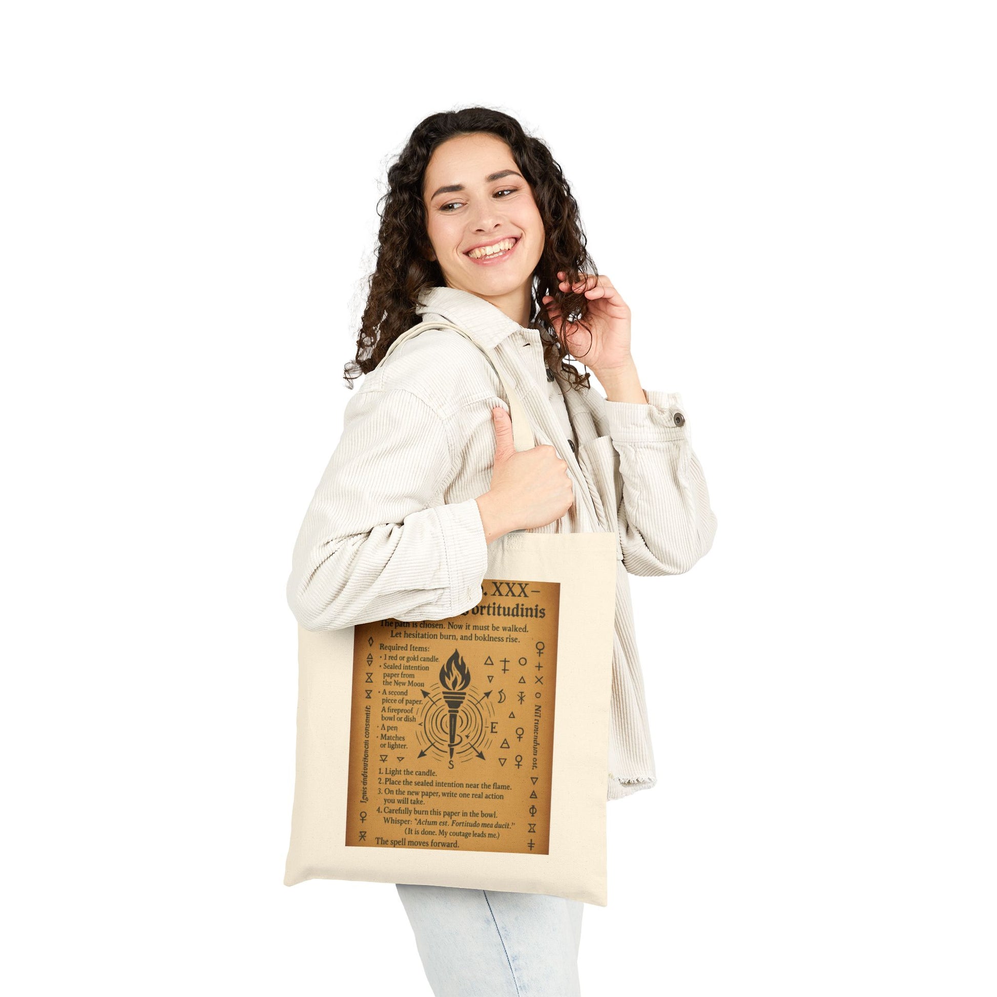 Description: First Quarter is the phase of tension and decision — where your intention meets challenge and you must act with courage. This mystical design features spellbook-style visuals and instructions to help you move forward with clarity and strength. It's the third stage of the Moon Phase Ritual Series and bridges the gap between growth and refinement. ✨ Moon Phase Ritual Series ➤ Start with: 🌑 New Moon ➤ Then: 🌒 Waxing Crescent → 🌓 First Quarter → 🌔 Waxing Gibbous ➤ Followed by: 🌕 Full Moon → 🌖 Waning Gibbous → 🌗 Last Quarter ➤ Now: 🌘 Waning Crescent (Stillness & Renewal) Perfect for lunar ritual practitioners, witches, or spiritual seekers, this design is available on t-shirts and tote bags. Disclaimer: This product is intended for decorative, artistic, and spiritual inspiration only. It does not claim to diagnose, cure, treat, or prevent any disease or condition. No guarantee of outcome is implied. Use at your own discretion. For entertainment purposes only. 15" x 16" Width, in 15.00 Length, in 16.00 Handle length, in 20.00 Introducing a stylish and versatile cotton canvas tote bag that's perfect for everyday use. This bag blends functionality with unique design, making it a must-have accessory. Its sturdy construction provides a reliable option for your shopping trips, beach outings, or daily errands. With ample space and flat corners, the tote easily holds your essentials while maintaining a neat appearance. Whether you're gifting it for holidays, using it during springtime festivals, or simply taking it to the office, this tote bag suits any occasion. It's a fantastic choice for eco-conscious shoppers, students, and anyone looking to add a touch of flair to their lifestyle. Available in natural and black colors, it complements any outfit with both style and practicality. Product features - Made from 100% cotton canvas for durability. - Flat corners for a sleek design with no extra space. - Reinforced carrying handles for added strength. - Heavy fabric (12 oz/yd²) ensures long-lasting use. - Available in natural and black for versatile styling. Care instructions - Do not iron directly over the printed area - print may stick to the iron. - Spot clean - Do not bleach - Line dry