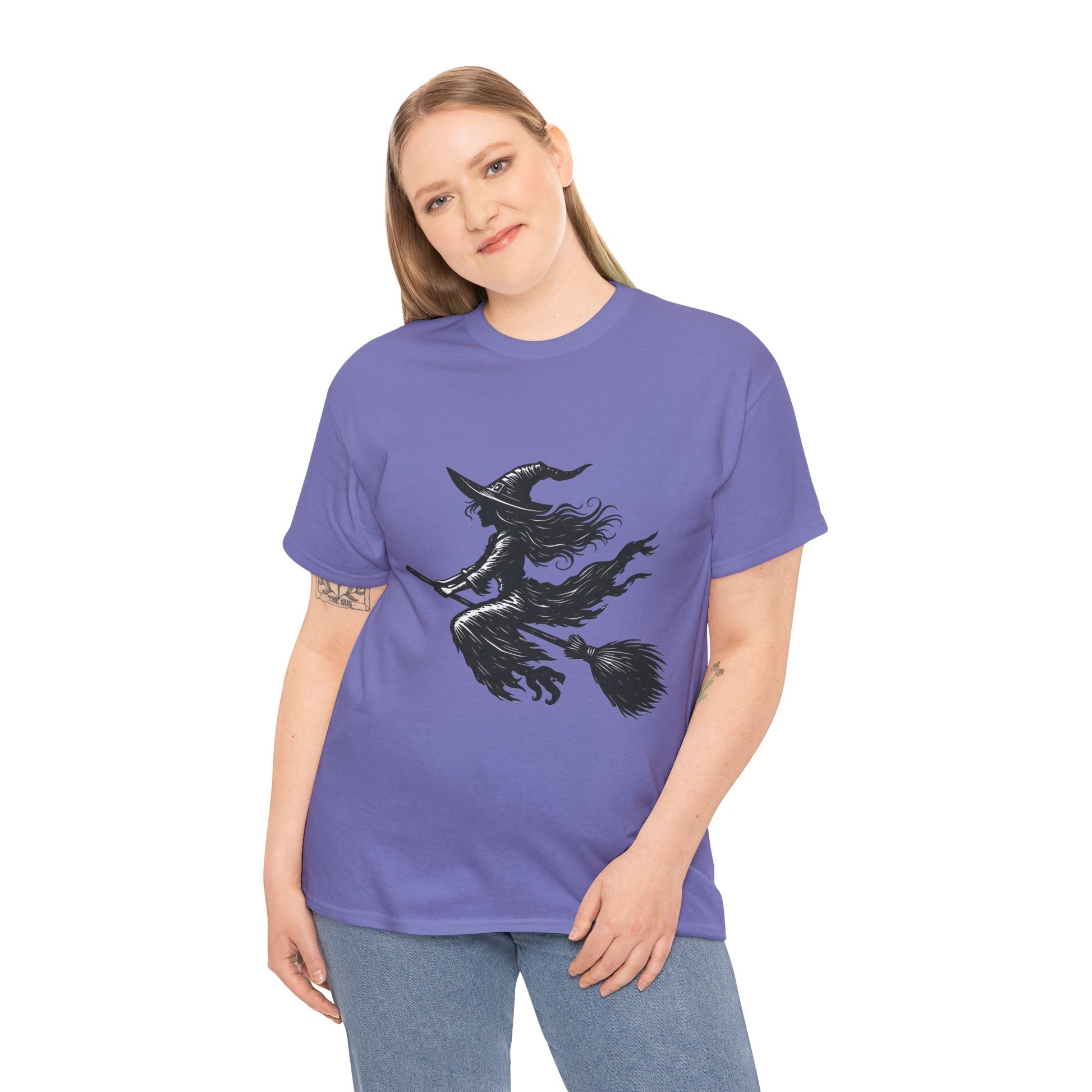 Flying Witch Silhouette Halloween T-Shirt for Women, Vintage Witch on Broom Tee, Spooky Gothic Fall Shirt, Minimal Black Witch Top