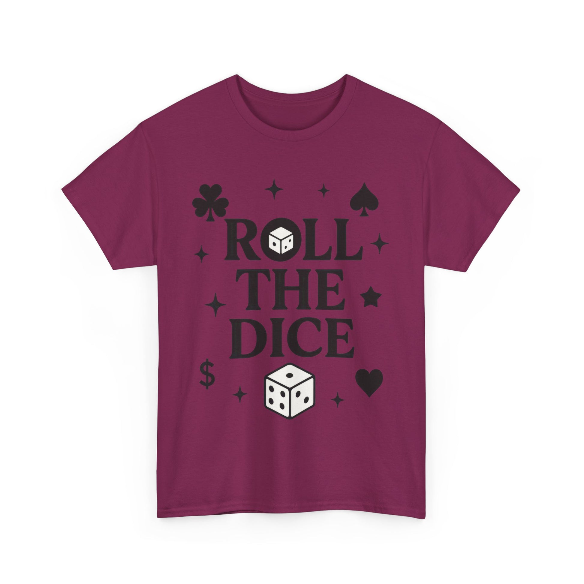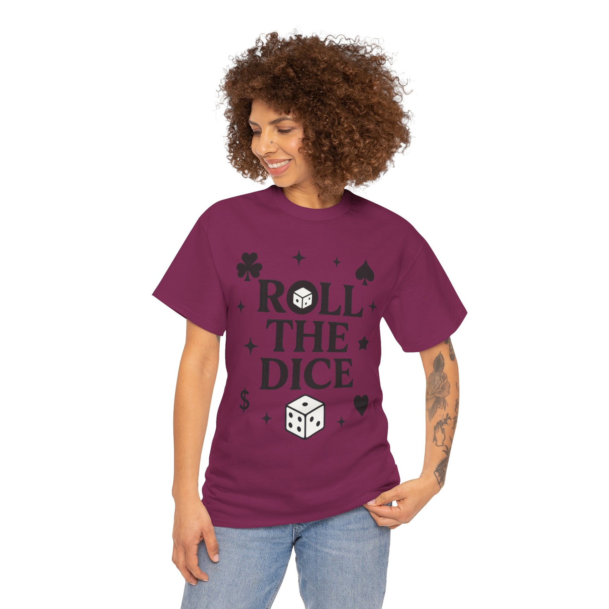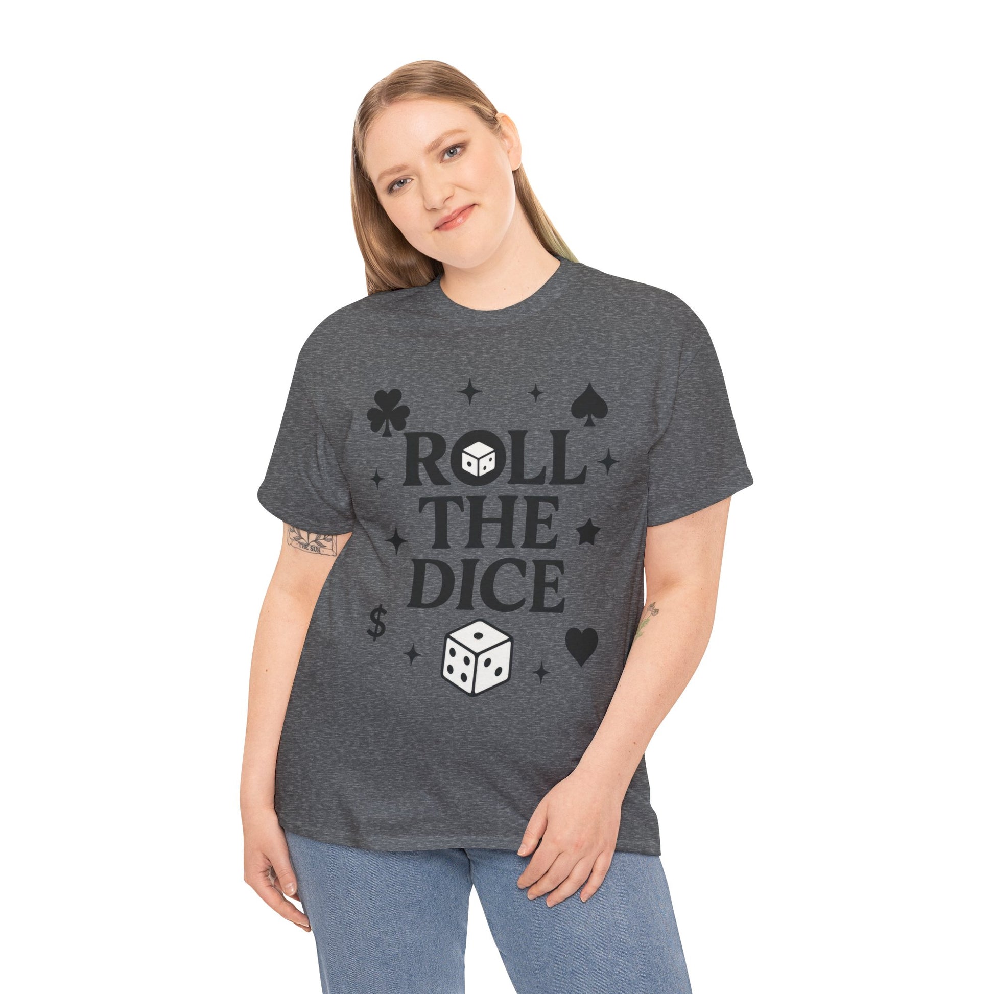Embrace your love for chance with our vibrant Unisex Heavy Cotton Tee. This shirt radiates a playful vibe, perfect for casual outings or game nights with friends. The bold 'Roll The Dice' design captures the thrill of taking chances, making it a fun choice for those who enjoy a risk-taking lifestyle. Ideal for adults, this tee speaks to gamers, thrill-seekers, or anyone who embraces the excitement of spontaneity. It's a great gift for birthdays or holidays, so grab one for your favorite risk-taker! Product features - Shoulder tape for stability and to prevent stretching - Seamless design reduces fabric waste and enhances appearance - Ribbed collar retains shape while providing comfort - Durable, smooth fabric ideal for printing with a natural aesthetic - Classic fit for relaxed wear suitable for casual or semi-formal occasions Care instructions - Non-chlorine: bleach as needed - Do not iron - Do not dryclean - Machine wash: cold (max 30C or 90F) - Tumble dry: low heat