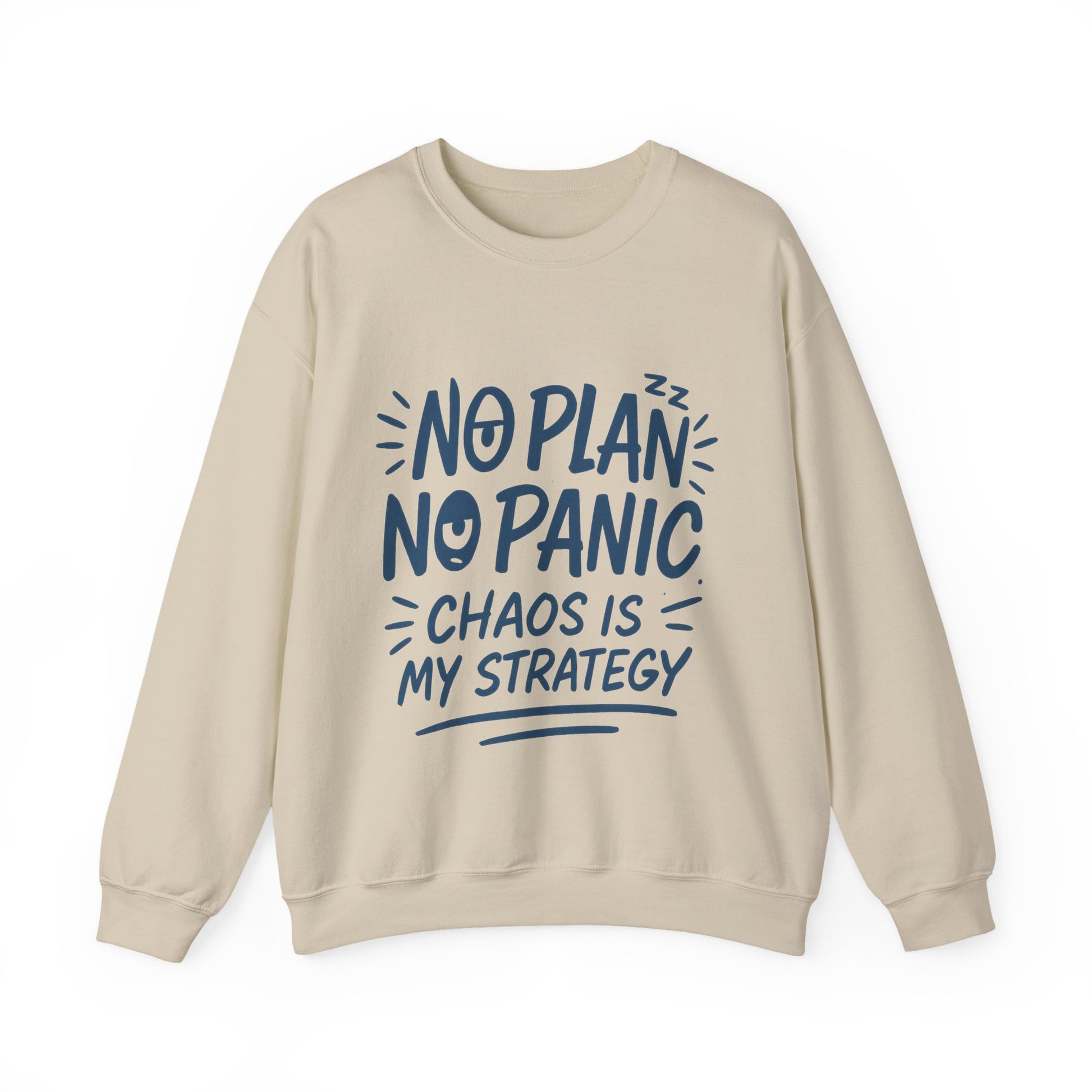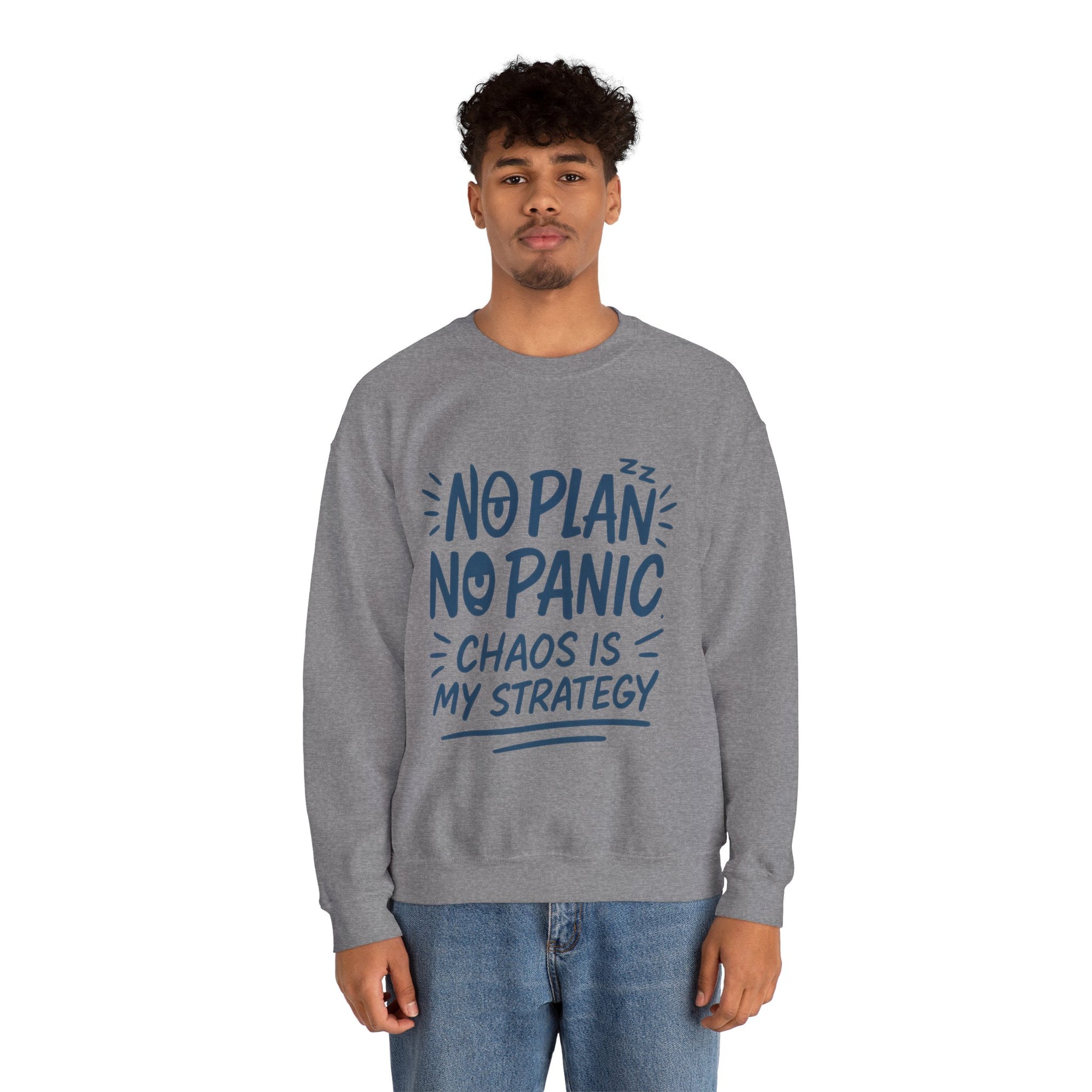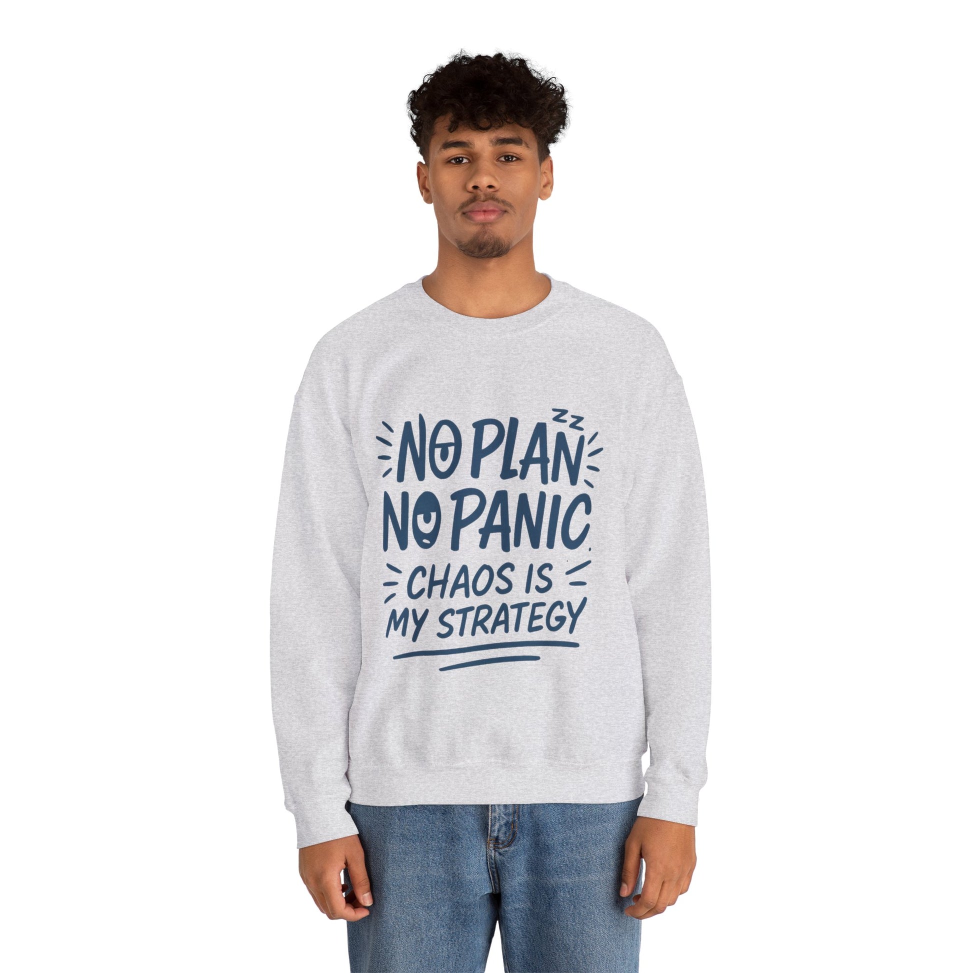 Funny Chaos Strategy Mens Sweatshirt, No Plan No Panic Quote, Cozy Relaxed Fit Pullover, Humorous Gift for Him, Unisex Style