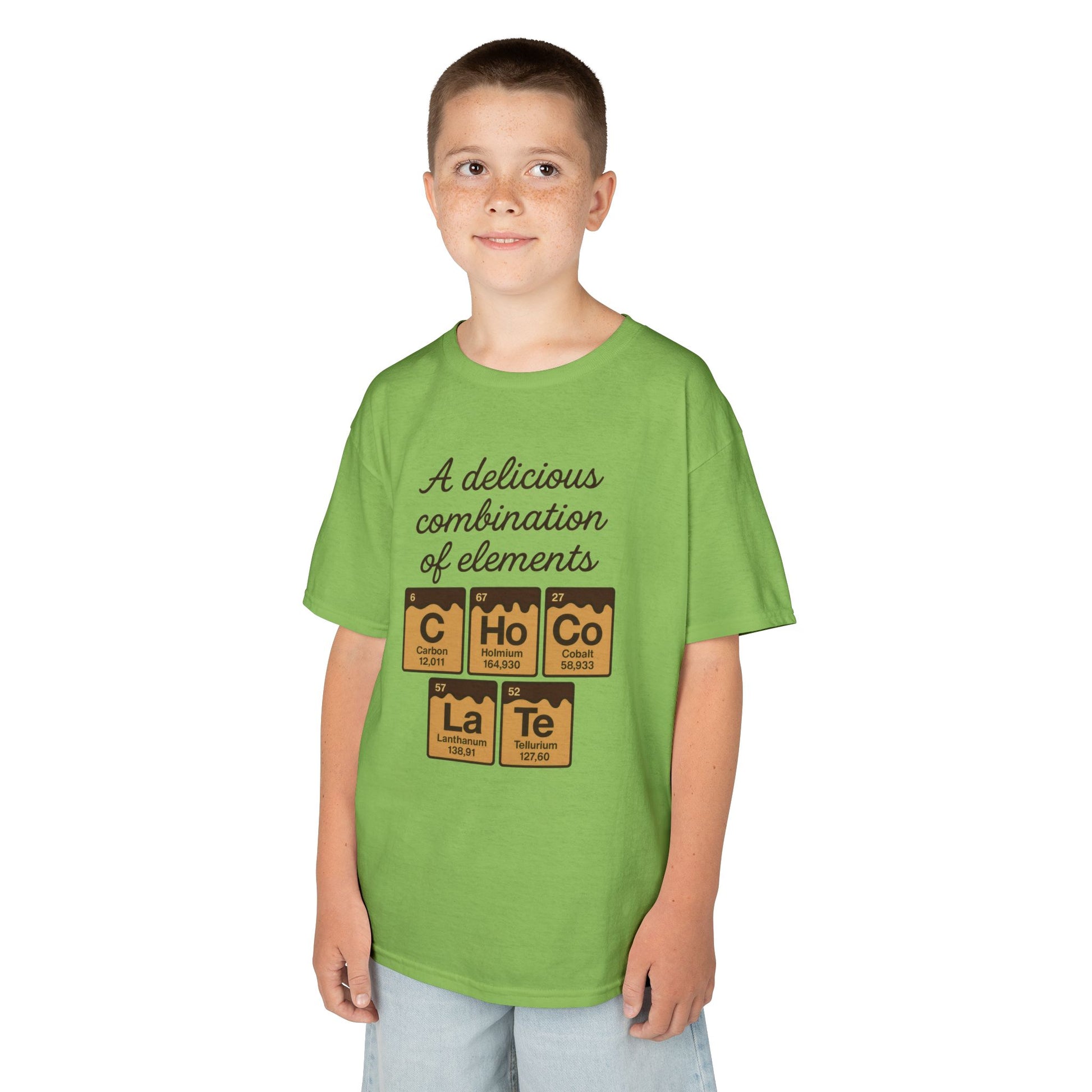 Introducing our Kids Heavy Cotton™ Tee, a delightful and comfortable addition to any child's wardrobe! This tee features a fun, eye-catching design that celebrates the sweet science of chocolate, making it perfect for little ones who love to learn and play. With its classic fit and soft US cotton fabric, this shirt provides a cozy feel for all-day wear. Ideal for casual outings, school events, or playdates, it radiates a cheerful vibe that kids adore. It's a great choice for gifting on holidays like birthdays and special occasions such as back-to-school celebrations. Parents will appreciate its durability and style, making it a favorite for both kids and guardians alike! Product features - Seamless design reduces fabric waste and enhances aesthetics. - Elastic ribbed knit collar maintains its shape over time. - Shoulder tape stabilizes seams, preventing stretching during wear. - Printed inner neck labels provide a smooth, scratch-free experience. - Ethically sourced US cotton ensures maximum comfort and sustainability. Care instructions - Machine wash: warm (max 40C or 105F) - Non-chlorine: bleach as needed - Tumble dry: medium heat - Iron, steam or dry: low heat - Do not dry clean