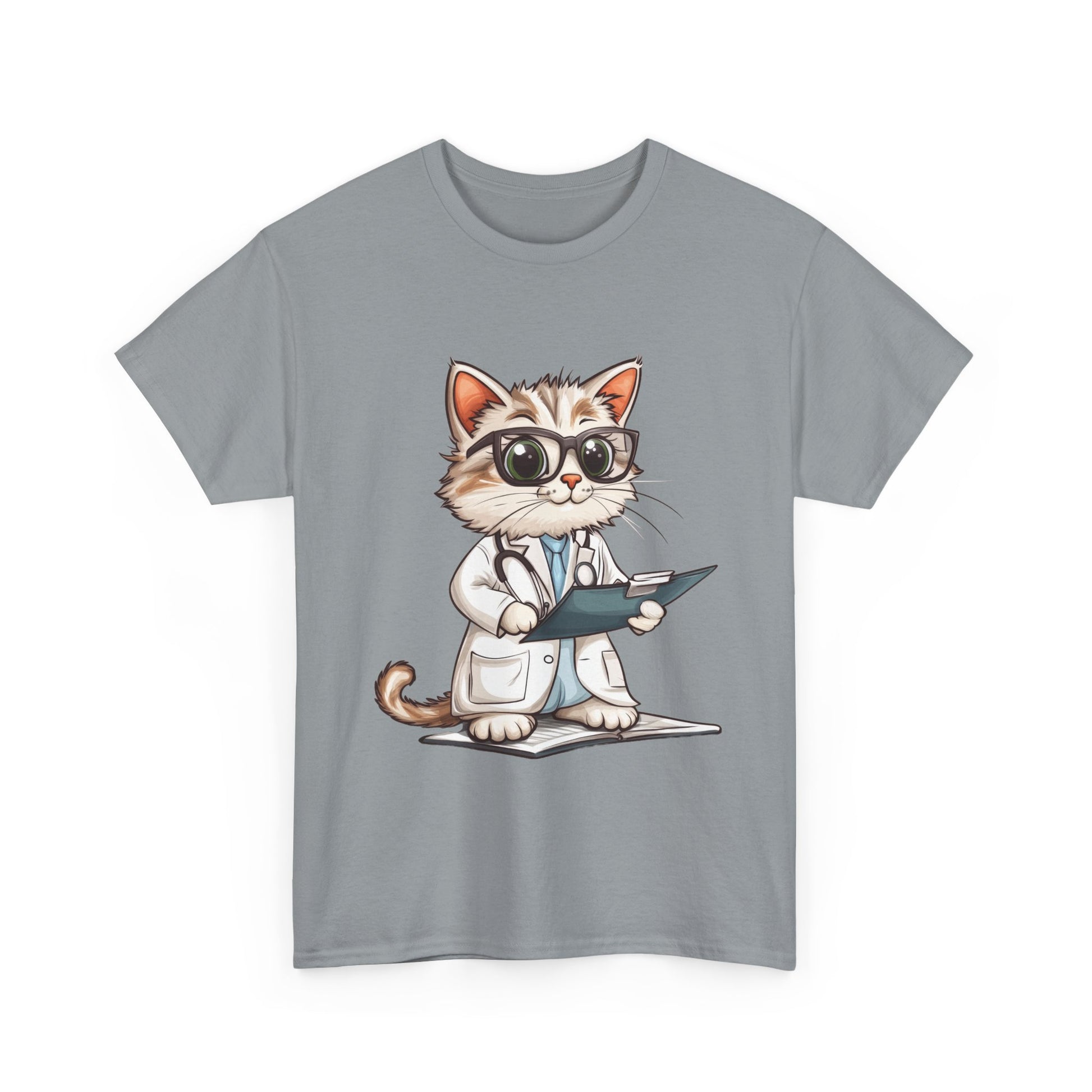 Introducing our Unisex Heavy Cotton Tee, a delightful addition to your casual wardrobe. Featuring a charming cat doctor design, this tee embodies a playful spirit perfect for animal lovers, cat parents, and healthcare professionals. Its soft fabric offers all-day comfort, making it ideal for relaxed weekends or casual outings with friends. This original tee is not only a great choice for everyday wear but also makes for a thoughtful gift during holidays like World Cat Day or as a fun birthday surprise. Whether you're lounging at home or meeting up with friends, this tee brings a lighthearted vibe that effortlessly fits into any occasion. Product features - Shoulder tape for enhanced durability and fit - Seamless design reduces waste and improves aesthetics - Elastic ribbed collar retains shape for lasting wear - Made from a strong, smooth fabric perfect for vibrant prints - Ethically produced with 100% US cotton for sustainability Care instructions - Non-chlorine: bleach as needed - Do not iron - Do not dryclean - Machine wash: cold (max 30C or 90F) - Tumble dry: low heat
