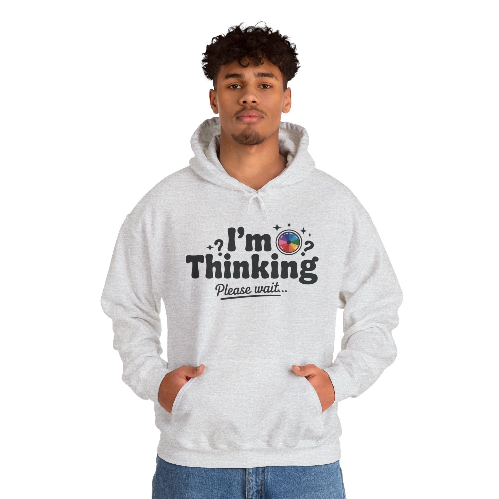 Stay cozy and stylish with this unisex heavy blend hoodie that's perfect for everyday wear! The playful phrase 'I'm Thinking, Please wait...' adds a touch of humor to your outfit, making it a great conversation starter. Ideal for a relaxed day at home, running errands, or casual outings, this hoodie blends comfort with personality. It's perfect for anyone who appreciates a laid-back vibe and wants to express themselves. Great for gifting during the holidays, birthdays, or just to show someone you're thinking of them! Product features - Spacious kangaroo pouch pocket keeps hands warm. - Adjustable drawstring hood for a perfect fit. - Seamless design for a smooth look and reduced waste. - Durable 50% cotton, 50% polyester fabric ensures comfort. - Available with customizable embroidery options for a personal touch. Care instructions - Tumble dry: medium - Iron, steam or dry: low heat - Do not dryclean - Machine wash: cold (max 30C or 90F) - Non-chlorine: bleach as needed