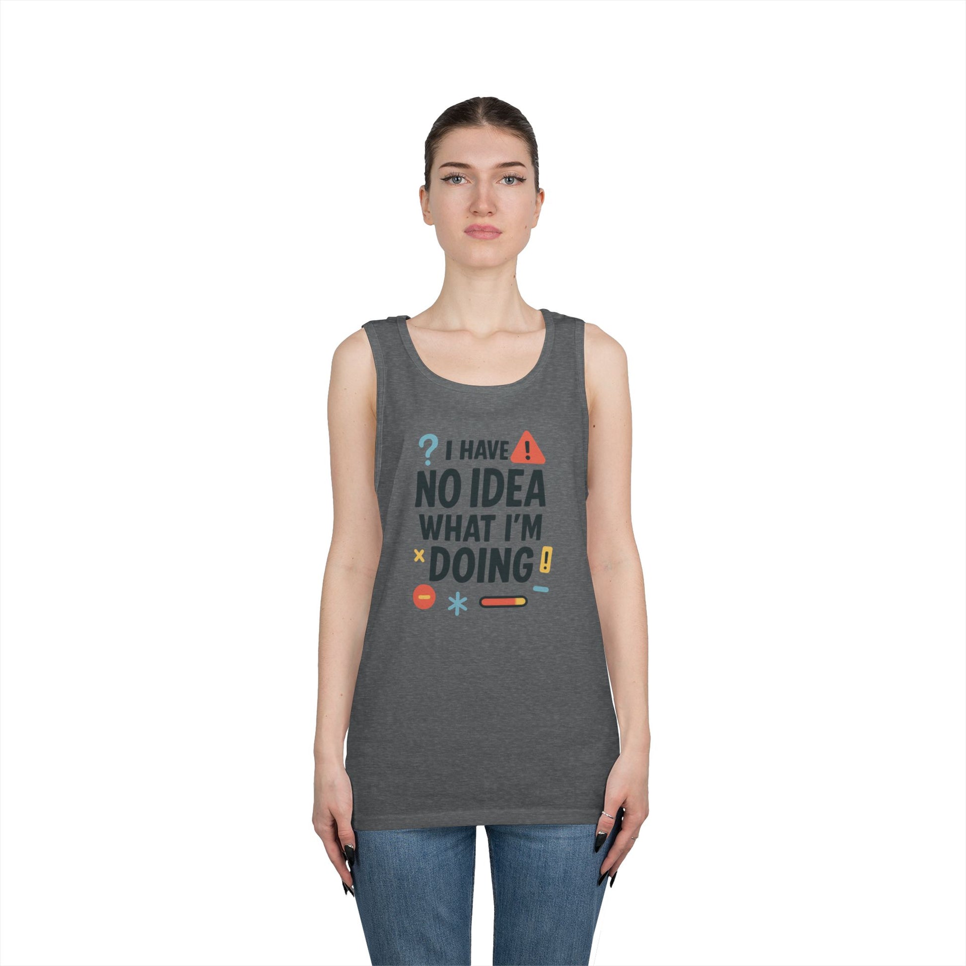 Introducing a delightful and humorous Unisex Heavy Cotton Tank Top, perfect for those carefree days when you want to embrace your spontaneity. This comfortable tank top is adorned with a playful design that reads, "I HAVE NO IDEA WHAT I'M DOING!" making it a light-hearted addition to anyone's wardrobe. Ideal for summertime outings, casual gatherings with friends, or as a fun loungewear piece, this tank top is versatile for any laid-back occasion. Perfect for comedic souls, students, or anyone who enjoys a laugh, it also serves as a great gift for birthdays, housewarming, or just to brighten someone's day. Celebrate humor and individuality with this tank top during casual holidays, beach days, or sunny picnics! Product features - Durable double needle bottom hem for lasting wear - Stretchable 1x1 ribbed collar that maintains its shape - Varied fiber composition: 100% cotton (varies by color) - Medium fabric weight of 5.3 oz/yd² (180 g/m²) - Classic fit with a tear away label for comfort Care instructions - Machine wash: cold (max 30C or 90F) - Do not bleach - Do not tumble dry - Iron, steam or dry: low heat - Do not dryclean