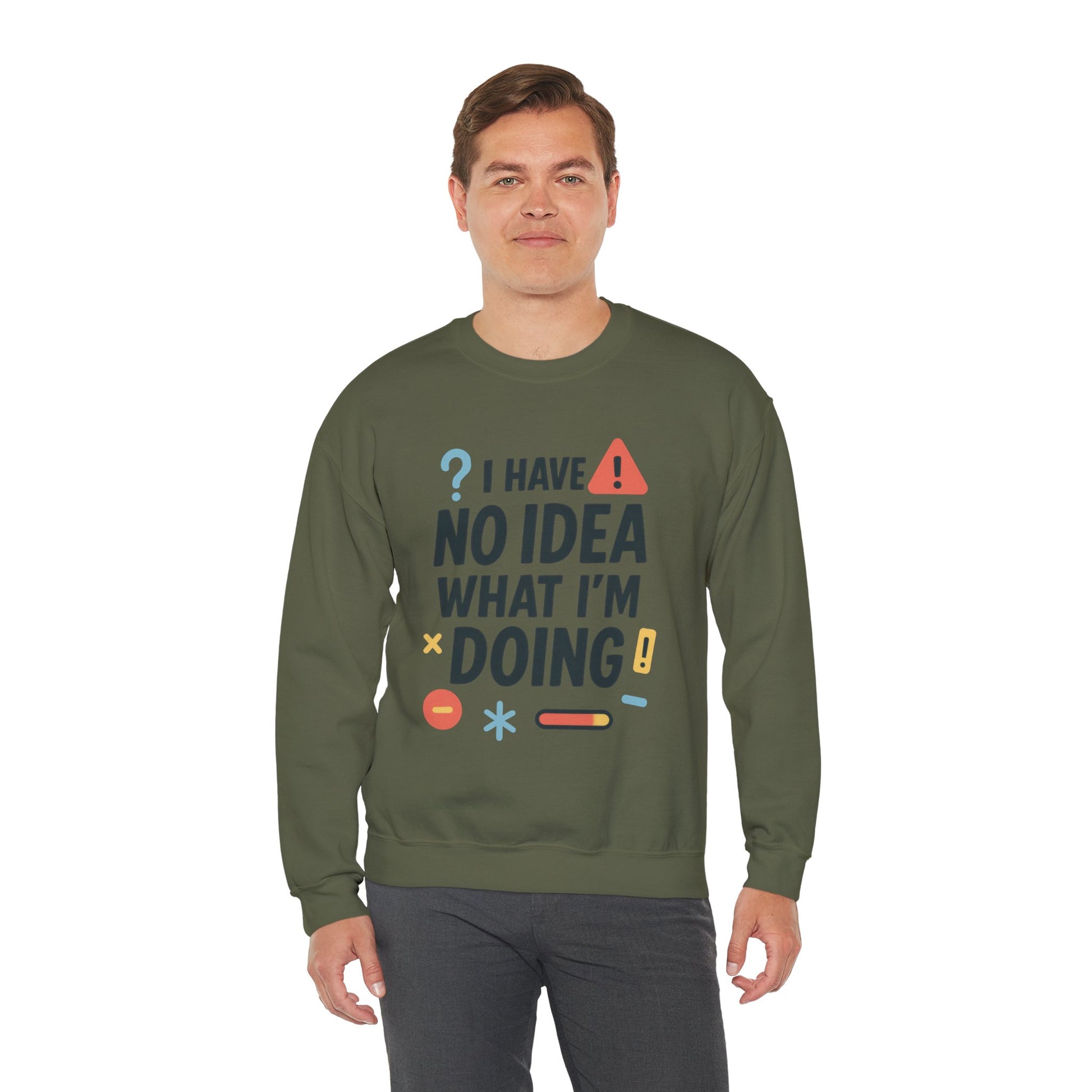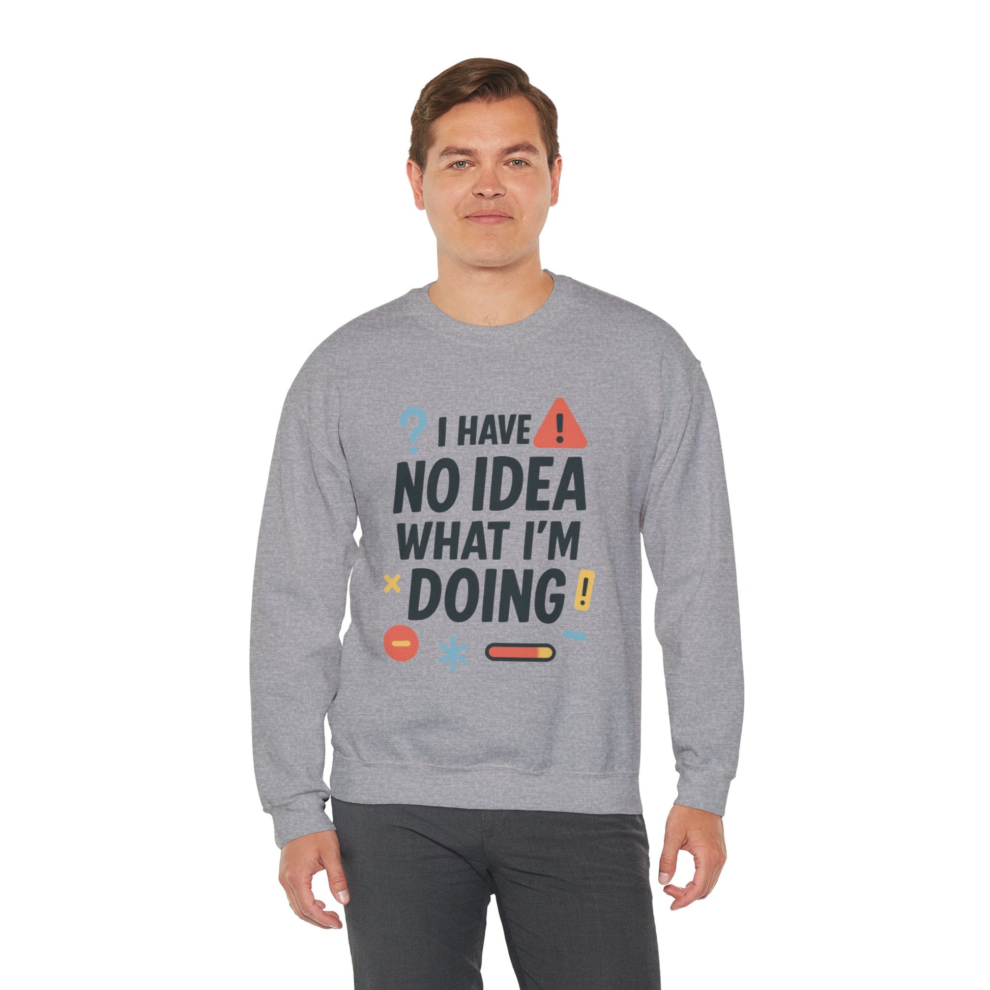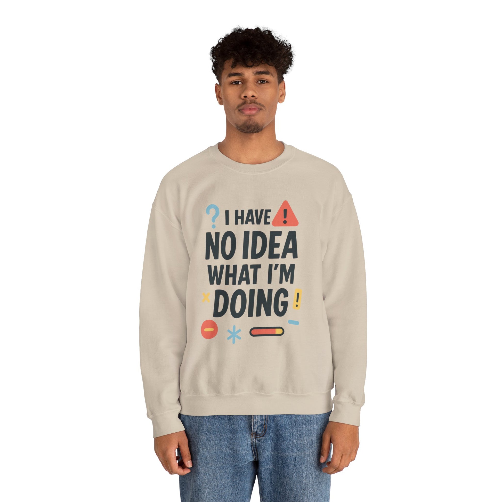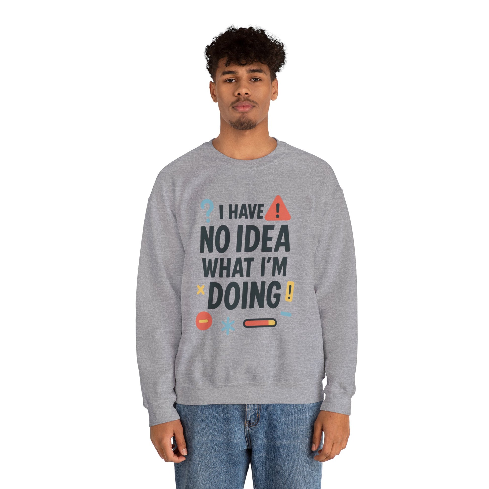 Stay cozy and stylish with this Unisex Heavy Blend™ Crewneck Sweatshirt, perfect for those who appreciate comfort and a touch of humor in their wardrobe. Featuring a playful design that says, ‘I HAVE NO IDEA WHAT I’M DOING,’ this sweatshirt brings a light-hearted vibe to your outfit, making it an ideal choice for relaxed weekends, casual outings, or simply lounging at home. The classic fit and soft fabric blend ensure a comfortable wear, whether you're attending a family gathering, celebrating a friend’s birthday, or just enjoying a cozy movie night. This sweatshirt is a great gift for friends, family, or anyone with a funny side, making it suitable for holidays like Christmas, birthdays, or just to brighten someone's day! Product features - Knit in one piece to reduce fabric waste, enhancing aesthetic appeal - Elastic ribbed collar to maintain its shape - Custom embroidery option available for personalization - Durable double-needle stitching for enhanced longevity - Ethically produced with 100% US-grown cotton Care instructions - Machine wash: cold (max 30C or 90F) - Non-chlorine: bleach as needed - Tumble dry: low heat - Do not iron - Do not dryclean