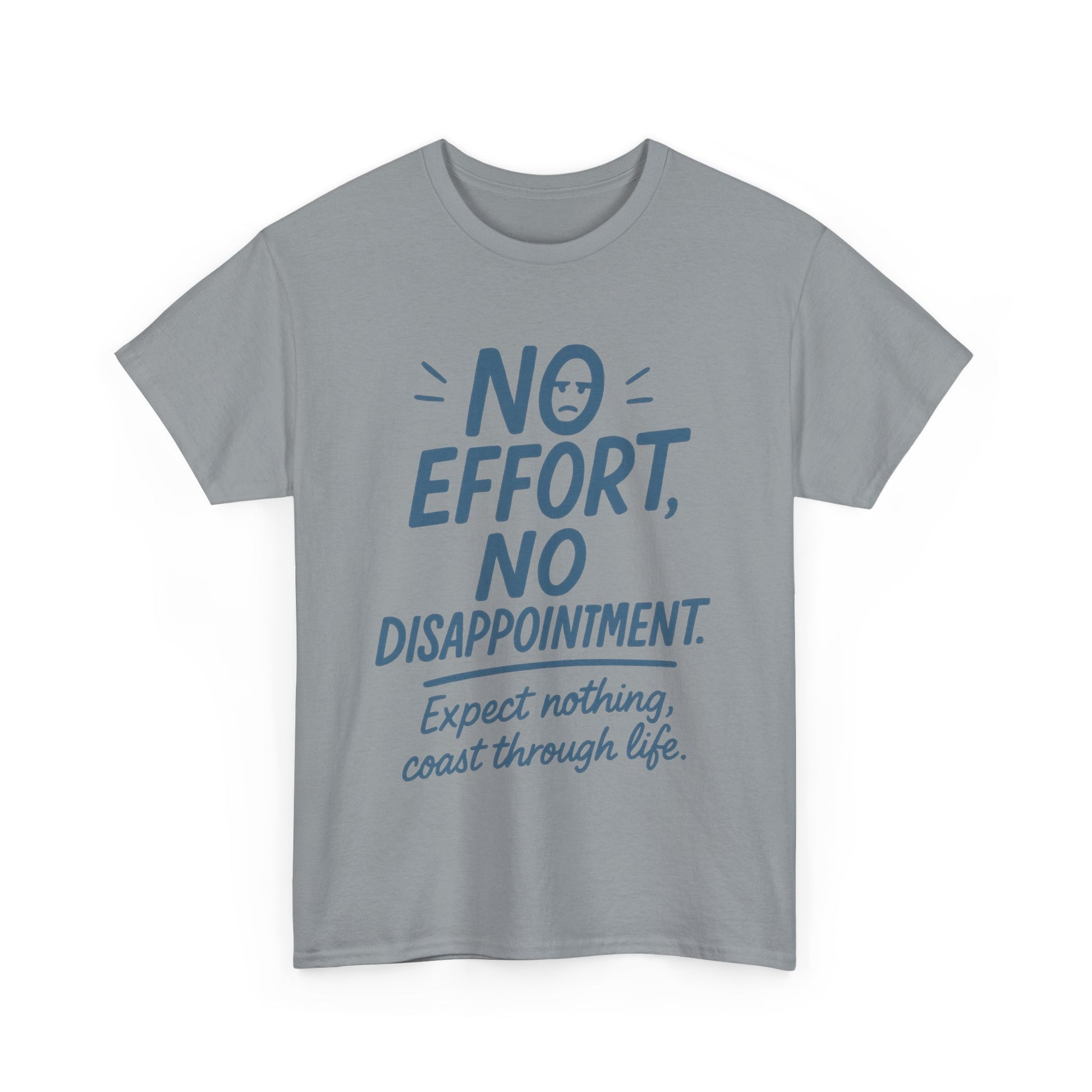 Introducing this Unisex Heavy Cotton Tee—a perfect blend of comfort and creativity. This tee features a delightful slogan that encapsulates a laid-back lifestyle: 'No Effort, No Disappointment.' It's designed for those who embrace humor and an easy-going attitude in life. Ideal for casual outings, lounging at home, or adding a funny twist to your wardrobe. This shirt perfectly suits friends, family, or anyone looking to make a light-hearted statement. Celebrate occasions like birthdays, holidays, or just enjoying everyday moments with a dose of fun! Product features - Shoulder tape stabilizes the back and prevents stretching. - Tubular knit design reduces fabric waste and enhances appearance. - Ribbed collar retains shape and adds elasticity. - Made with specially spun fibers for a smooth, durable fabric. - Dual printing techniques ensure high-quality, detailed designs. Care instructions - Non-chlorine: bleach as needed - Do not iron - Do not dryclean - Machine wash: cold (max 30C or 90F) - Tumble dry: low heat