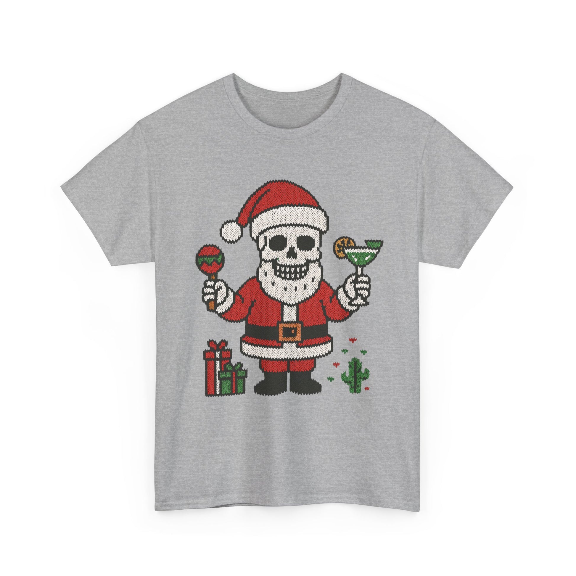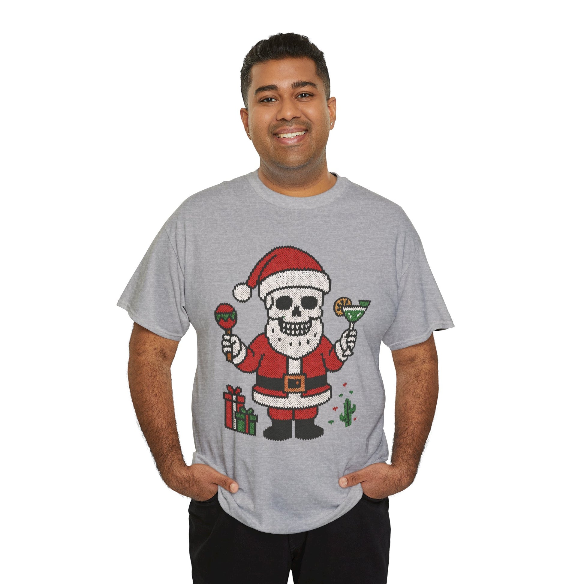 Add humor to the holidays with this Santa Skull Christmas T-shirt! A festive blend of dark humor and cheer — perfect for parties, cocktails, and unique gift ideas. The Gildan 5000 heavy cotton tee is a dependable classic made for everyday wear and custom printing. Its 100% cotton fabric is tightly knit to give designs sharper detail and long-lasting color. The seamless body eliminates side seams for a smoother fit, while reinforced shoulders keep the shirt in shape through repeated washes. Durable, comfortable, and print-friendly, the Gildan 5000 is a trusted staple for personalized apparel. Disclaimer: - Due to the fabric properties, the White color variant may appear off-white rather than bright white. .: The Gildan 5000 is made with medium fabric (5.3 oz/yd² / 180 g/m²) consisting of 100% cotton, offering year-round comfort with lasting durability. .: The classic fit of this shirt ensures a comfy, relaxed wear while the crew neckline adds that neat, timeless look that can blend into any occasion, casual or semi-formal. .: The tear-away label means a scratch-free experience with no irritation or discomfort whatsoever. .: Made using 100% US cotton that is ethically grown and harvested. Gildan is also a proud member of the US Cotton Trust Protocol ensuring ethical and sustainable means of production. This blank tee is certified by Oeko-Tex for safety and quality assurance.