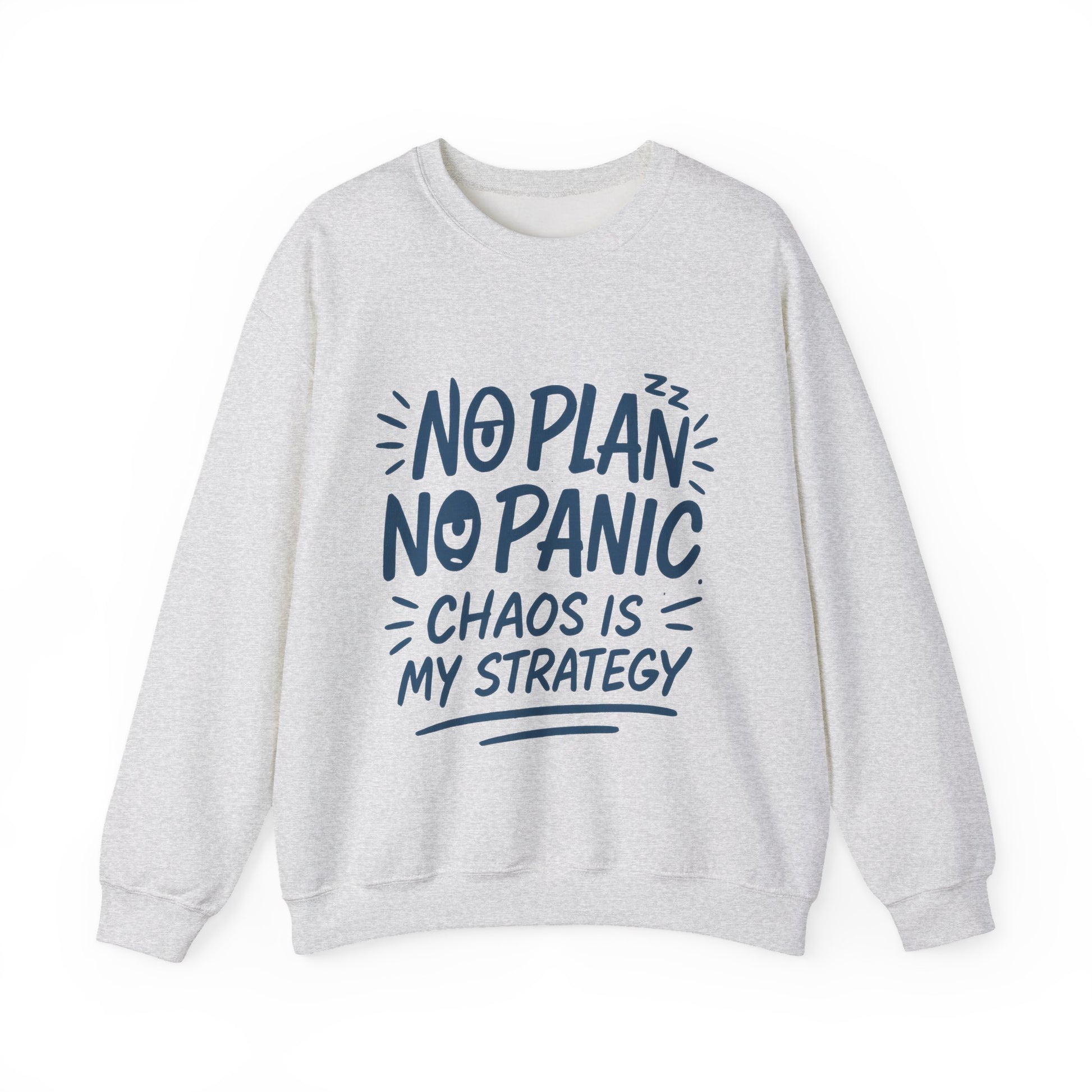 Embrace comfort and style with this Unisex Heavy Blend™ Crewneck Sweatshirt. Featuring a playful design that reads "No Plan No Panic, Chaos is My Strategy," this sweatshirt emanates a relaxed and carefree vibe, perfect for those who appreciate humor in their daily life. Whether you're lounging at home, heading out with friends, or running errands, this sweatshirt fits seamlessly into your wardrobe. It's ideal for busy individuals who face chaotic schedules but want to stay cozy and stylish. Perfect for casual gatherings, lazy weekends, or as a unique gift for birthdays or holidays like Christmas and Hanukkah. Product features - Made from a cozy medium-heavy blend of 50% cotton and 50% polyester, making it perfect for colder months. - Ribbed knit collar retains its shape for a polished look. - Ethically produced with 100% US-grown cotton and compliant with environmental standards. - Durable double-needle stitching at seams ensures longevity. - Available for custom embroidery, allowing personalization on various parts of the sweatshirt. Care instructions - Machine wash: cold (max 30C or 90F) - Non-chlorine: bleach as needed - Tumble dry: low heat - Do not iron - Do not dryclean