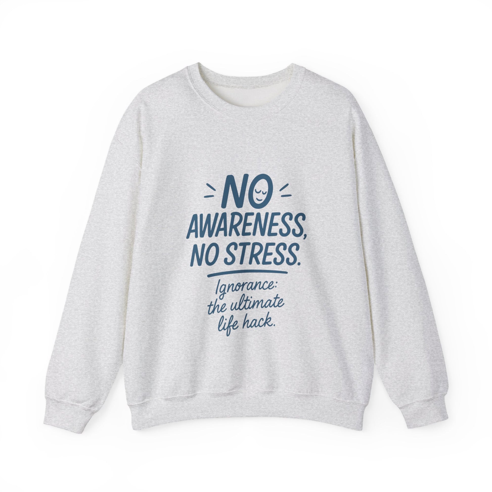 Funny Womens Crewneck Sweatshirt, No Awareness No Stress Quote, Ignorance the Ultimate Life Hack, Cozy Relaxed Fit Pullover, Self-Care Gift