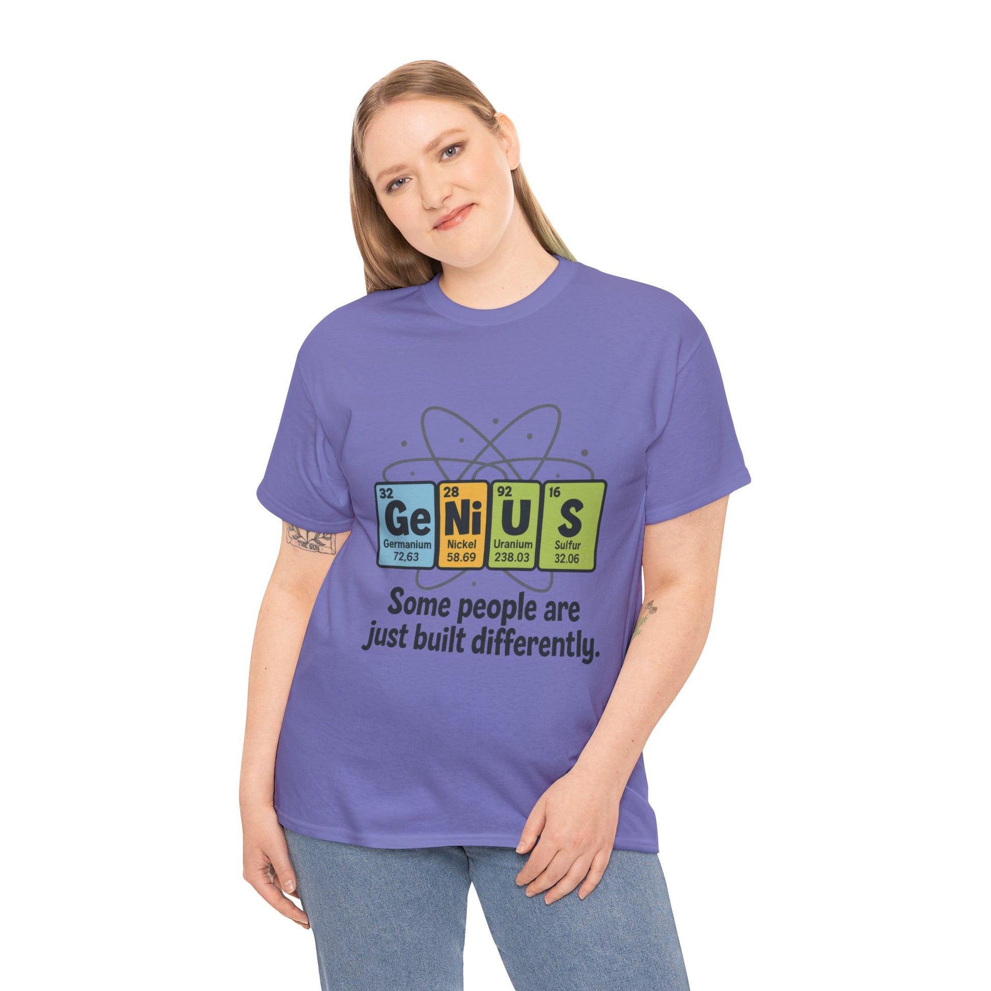 Introducing the Unisex Heavy Cotton Tee, a perfect blend of comfort and style that speaks to those who embrace their unique brilliance! This tee exudes a lighthearted vibe, beautifully illustrated with playful designs that celebrate individuality. It's an ideal addition to your casual wardrobe, seamlessly transitioning from cozy weekends to gatherings with friends. Whether you're gifting it for birthdays, graduations, or just because, it's a charming choice for the geniuses in your life. Suitable for any occasion, this shirt is perfect for science lovers, educators, or anyone who appreciates a touch of wit in their attire. Celebrate creativity and intellect with a shirt that’s as distinctive as the wearer! Product features - Shoulder tape for stability and durability. - Seamless design reduces waste and enhances fit. - Elastic ribbed knit collar retains its shape. - High-quality fabric ideal for vibrant printing. - Classic fit for a comfortable, relaxed wear. Care instructions - Non-chlorine: bleach as needed - Do not iron - Do not dryclean - Machine wash: cold (max 30C or 90F) - Tumble dry: low heat