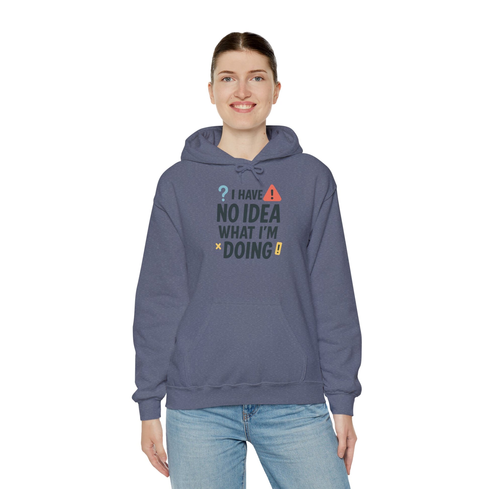 Embrace a cozy yet playful atmosphere with this Unisex Heavy Blend™ Hooded Sweatshirt. Perfect for lounging at home or layering for a casual outing, this hoodie effortlessly combines comfort with a humorous statement. You'll feel relaxed and stylish while sporting the cheeky design that says, 'I HAVE NO IDEA WHAT I’M DOING!' Ideal for anyone looking to add a touch of fun to their wardrobe, this sweatshirt makes for a great gift for friends, siblings, or anyone navigating life's uncertainties. It’s perfect for holidays like birthdays, as well as casual get-togethers and laid-back celebrations! Product features - Spacious kangaroo pouch pocket for warmth and convenience. - Adjustable drawstring hood for a personalized fit. - Knitted without side seams, enhancing appearance and reducing waste. - Made from a resilient 50% cotton and 50% polyester blend for durability. - The classic fit and double-lined hood add both comfort and style. Care instructions - Tumble dry: medium - Iron, steam or dry: low heat - Do not dryclean - Machine wash: cold (max 30C or 90F) - Non-chlorine: bleach as needed