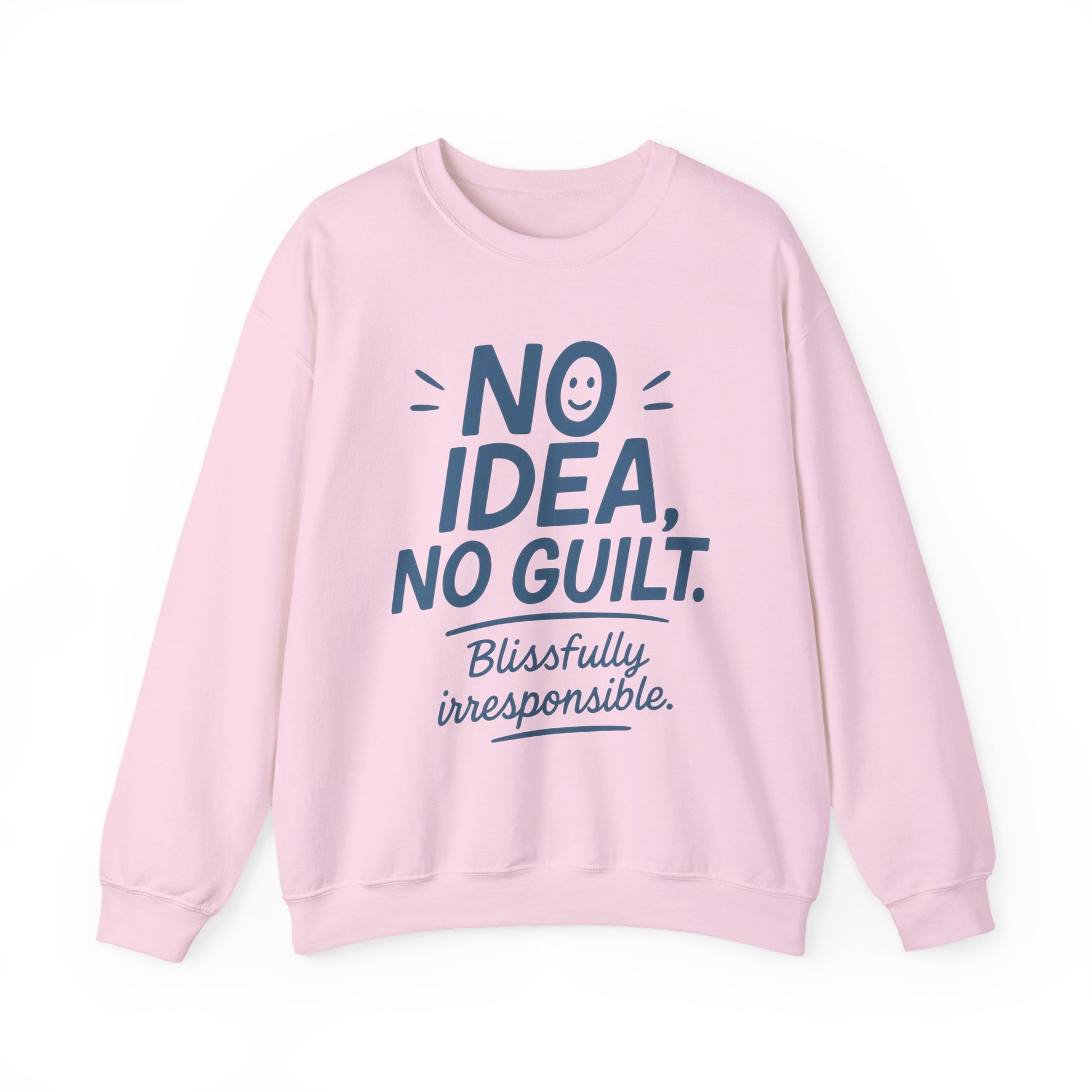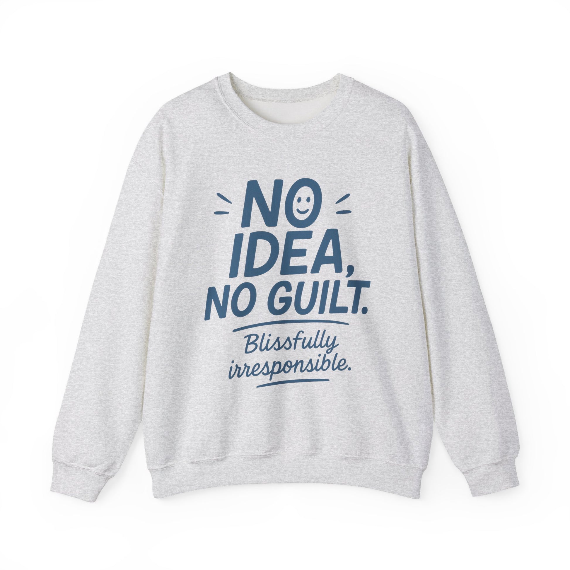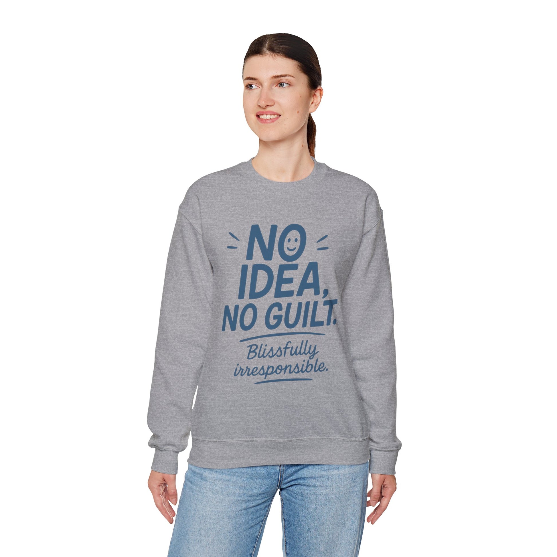 Cozy up with this Unisex Heavy Blend™ Crewneck Sweatshirt, designed to bring a touch of lightheartedness to your everyday wear. The playful phrase 'No Idea, No Guilt. Blissfully irresponsible.' encapsulates a carefree vibe that sparks smiles and laughter, making it perfect for casual outings, lounging at home, or coffee dates with friends. This sweatshirt is an ideal gift for anyone who appreciates humor and seeks comfort, from young adults to those looking for a little fun in their wardrobe. Comfy and warm, it’s great for cooler days and works wonderfully as a layering piece. Celebrate holidays like Friendsgiving or casual gatherings, or simply indulge yourself or a loved one on a cozy night in. Whether you're strolling through a farmer's market or enjoying a laid-back evening, this sweatshirt will keep you stylish and comfy, no matter the occasion! Product features - Seamless design reduces fabric waste for a cleaner aesthetic. - Elastic ribbed collar retains shape while adding comfort. - Built for adults, ensuring a perfect fit for a mature audience. - Sustainable production standards meet strict safety guidelines. - Made with a blend of 50% cotton and 50% polyester for cozy warmth. Care instructions - Machine wash: cold (max 30C or 90F) - Non-chlorine: bleach as needed - Tumble dry: low heat - Do not iron - Do not dryclean
