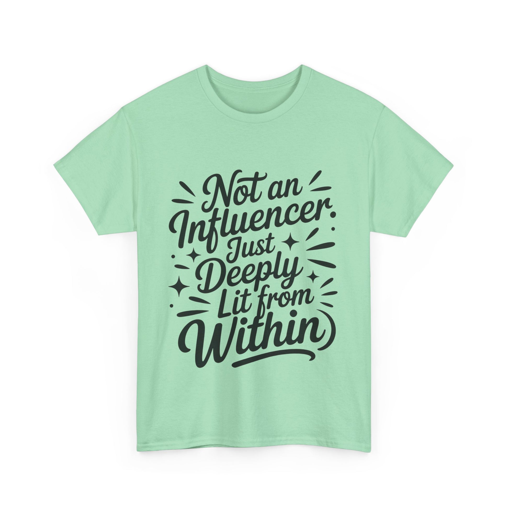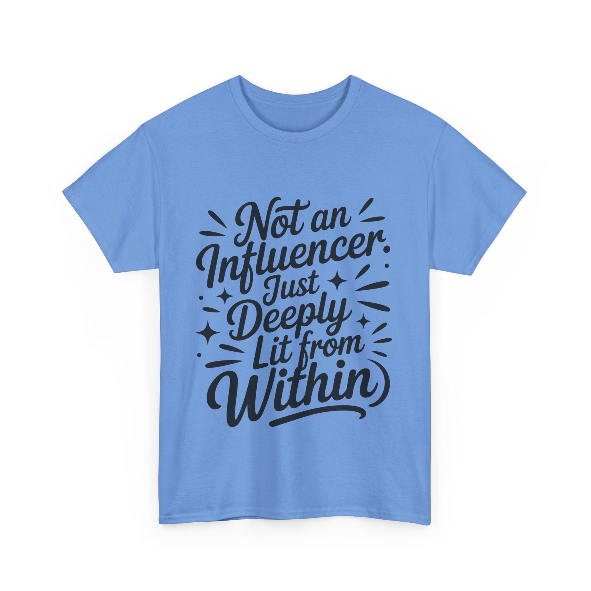 This Unisex Heavy Cotton Tee is the perfect addition to your wardrobe, exuding a relaxed yet stylish vibe. The eye-catching design features the phrase "Not an Influencer, Just Deeply Lit from Within," making it a great conversation starter. Wear this tee for casual outings, or dress it up for semi-formal events. It's ideal for anyone who values authenticity and self-expression, making it a thoughtful gift for birthdays, holidays, or just because! Whether you're lounging at home or enjoying a day out, this tee ensures comfort while showcasing your unique personality. Product features - Shoulder tape for added stability and durability. - Seamless design reduces fabric waste and enhances aesthetics. - Ribbed collar maintains shape and offers comfort. - Made from strong, smooth fabric ideal for printing. - Ethically produced with a focus on sustainability. Care instructions - Non-chlorine: bleach as needed - Do not iron - Do not dryclean - Machine wash: cold (max 30C or 90F) - Tumble dry: low heat