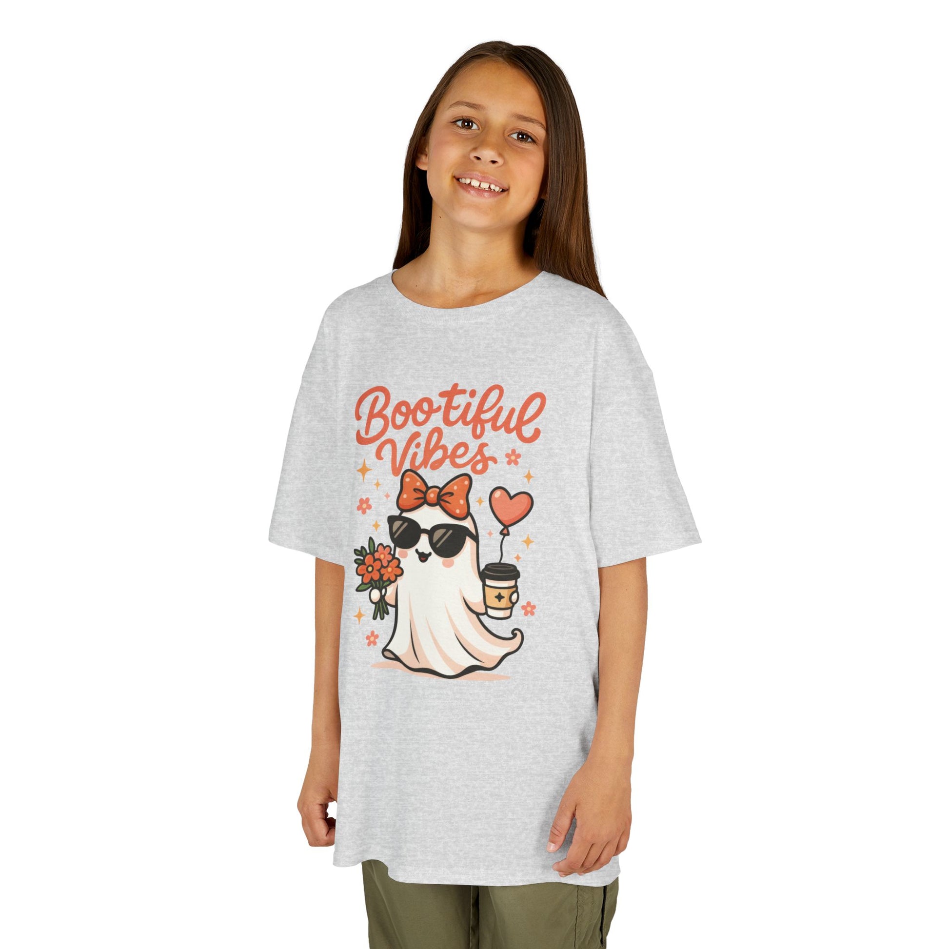 Girls Halloween Ghost T-Shirt, Cute Bootiful Vibes Tee for Kids, Fun Spooky Season Shirt, Tween Girl Outfit Gift, Kids Heavy Cotton™ Tee
