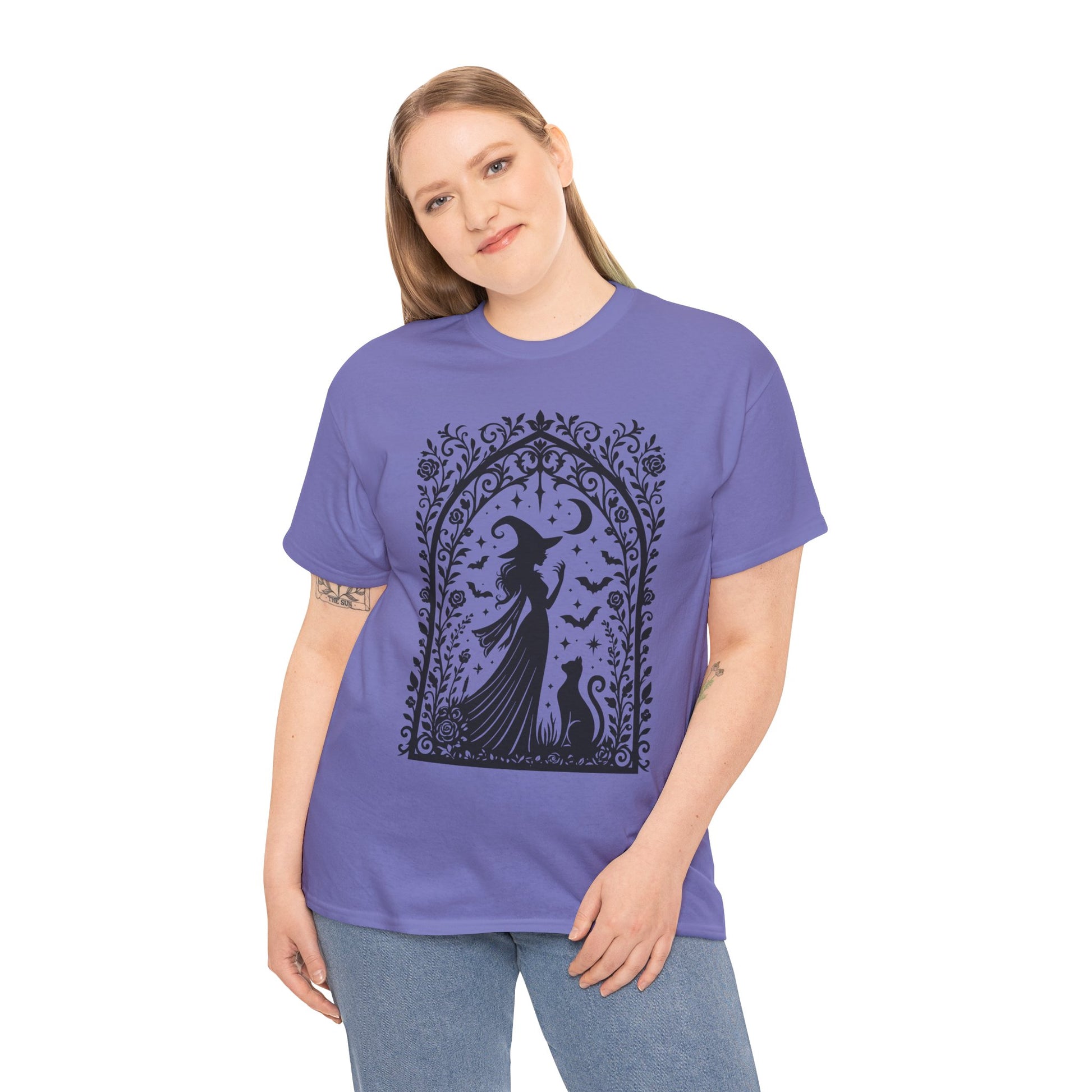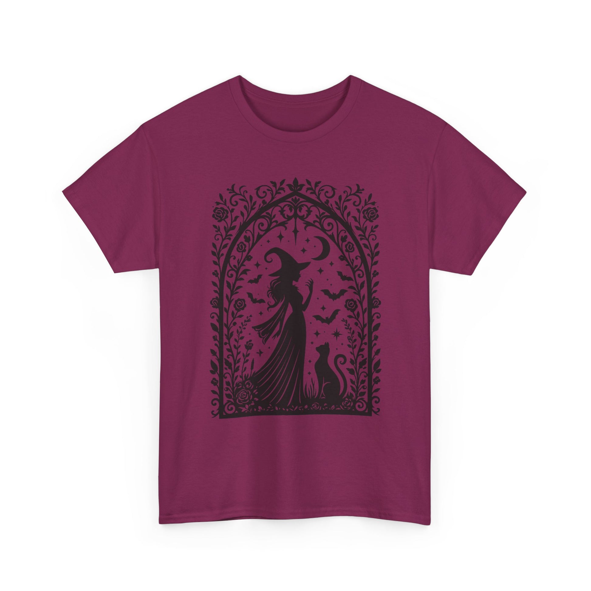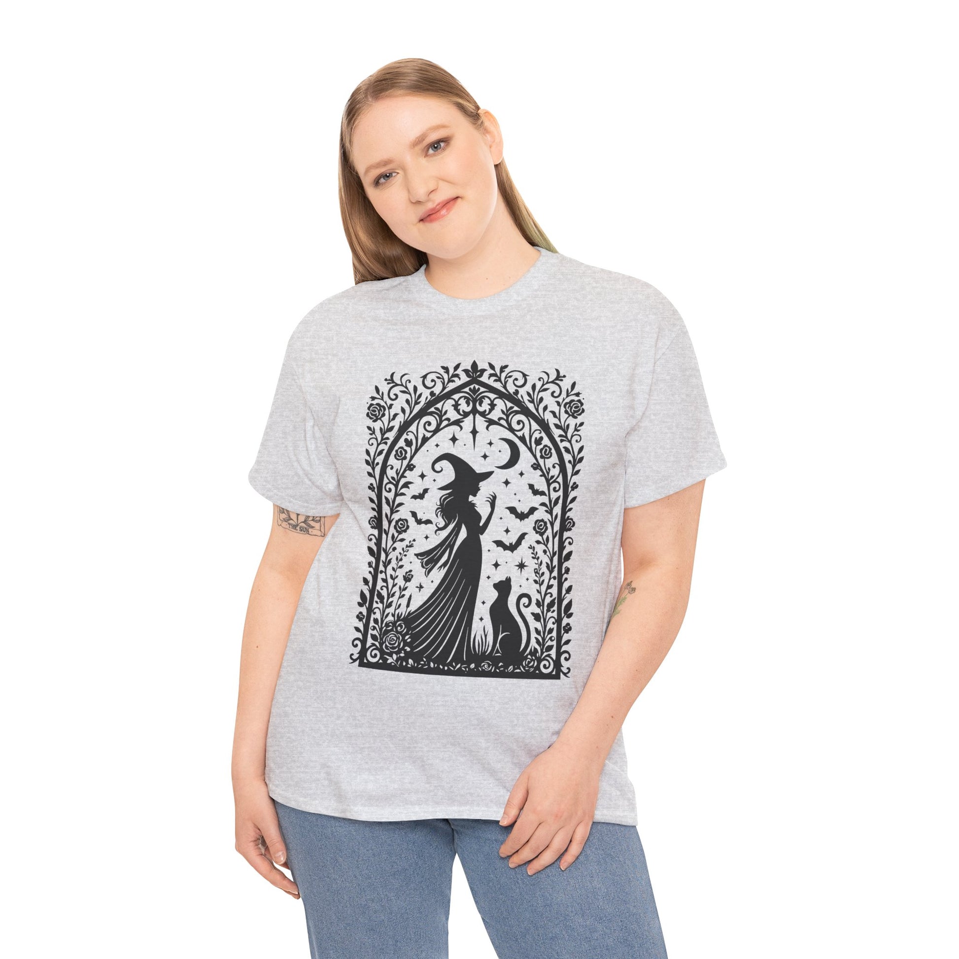 Gothic Witch & Cat Women's T-Shirt, Elegant Halloween Moon Silhouette Witchy Graphic Tee