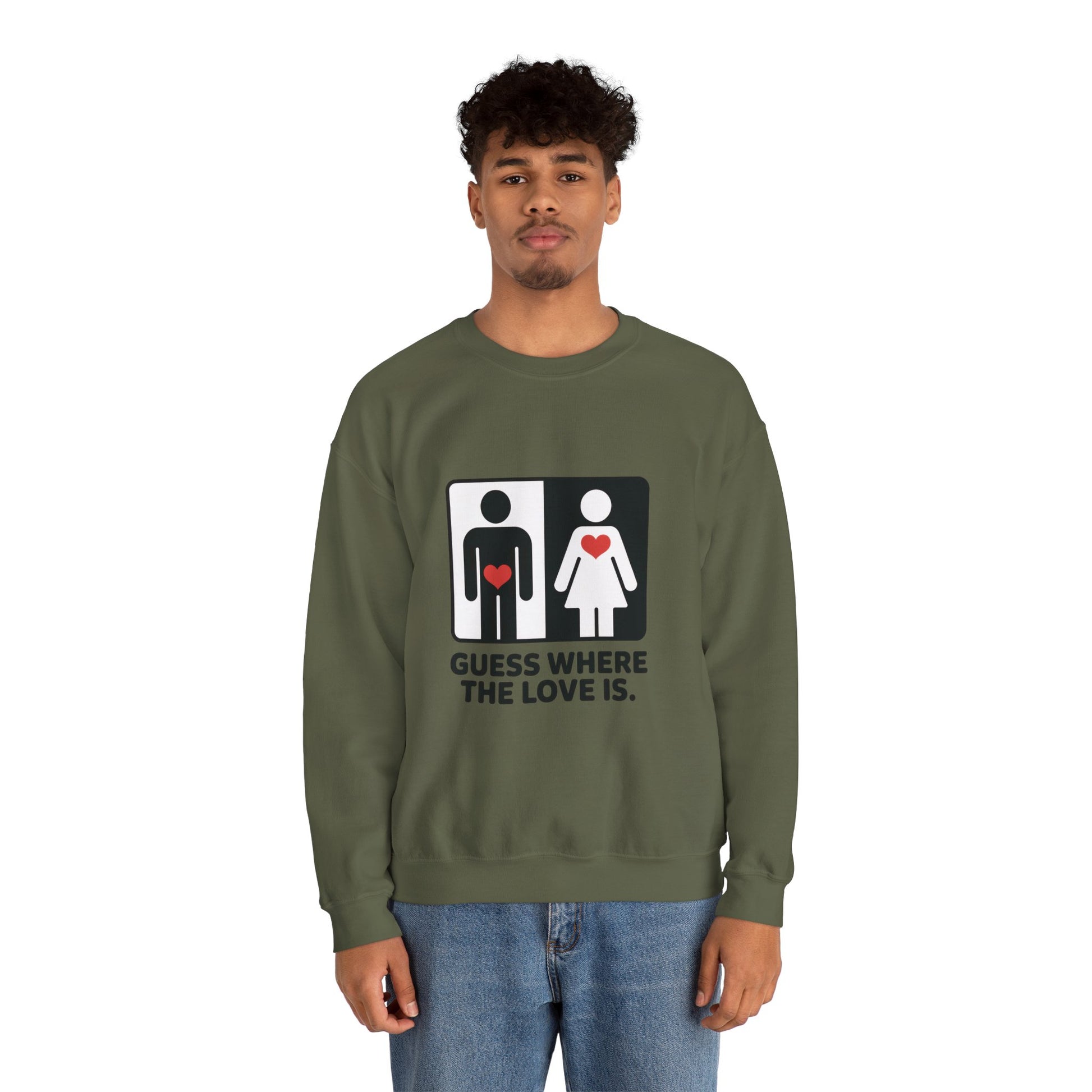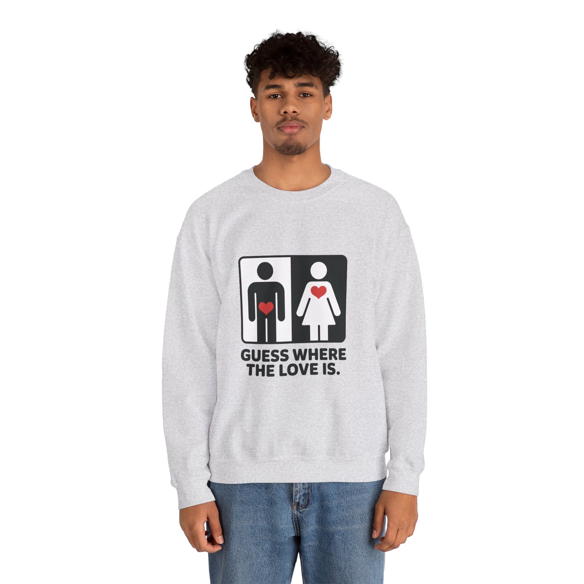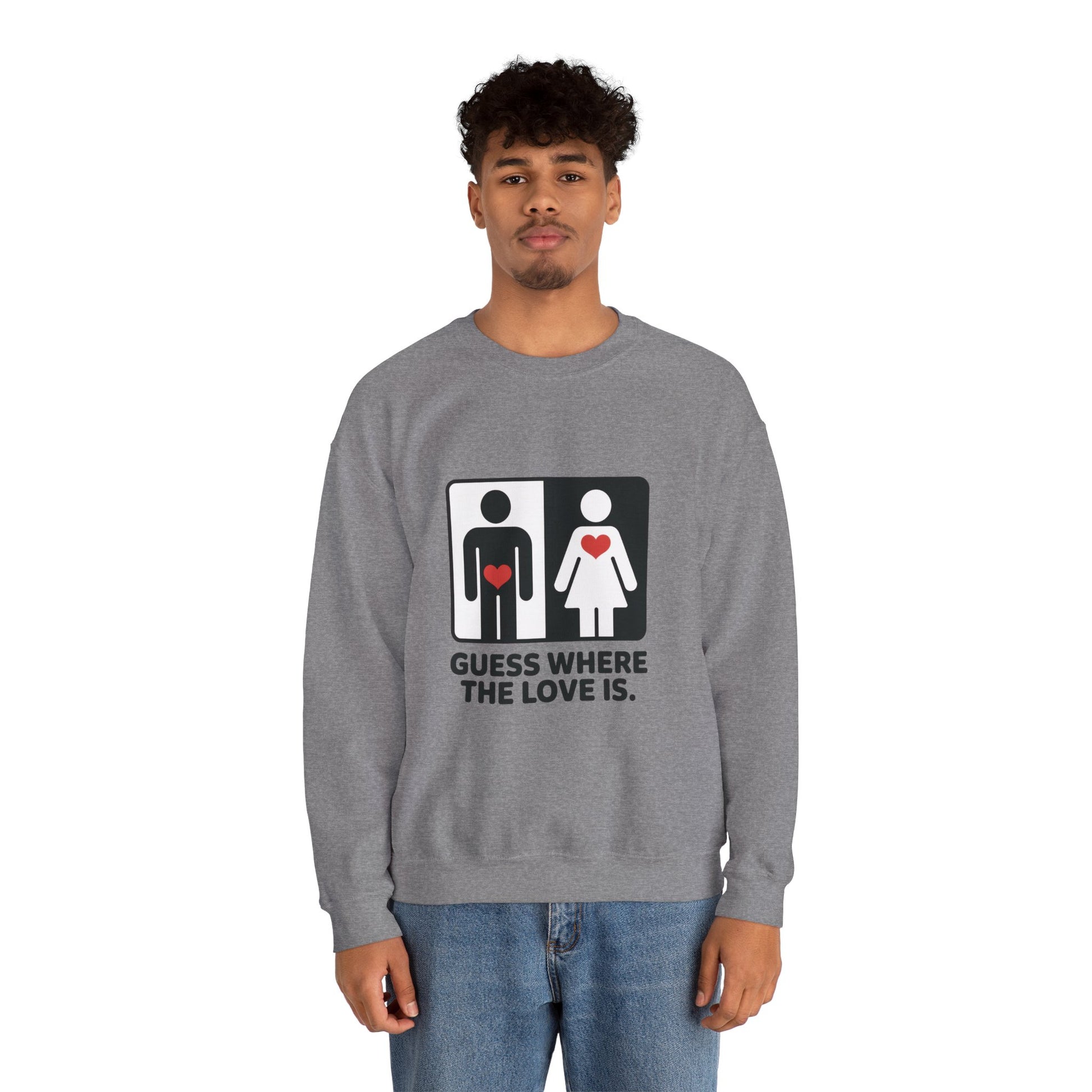 Guess Where the Love Is Mens Crewneck Sweatshirt, Cute Couples Gift, Love Themed Apparel, Valentine's Day Apparel, Relationship Sweatshirt