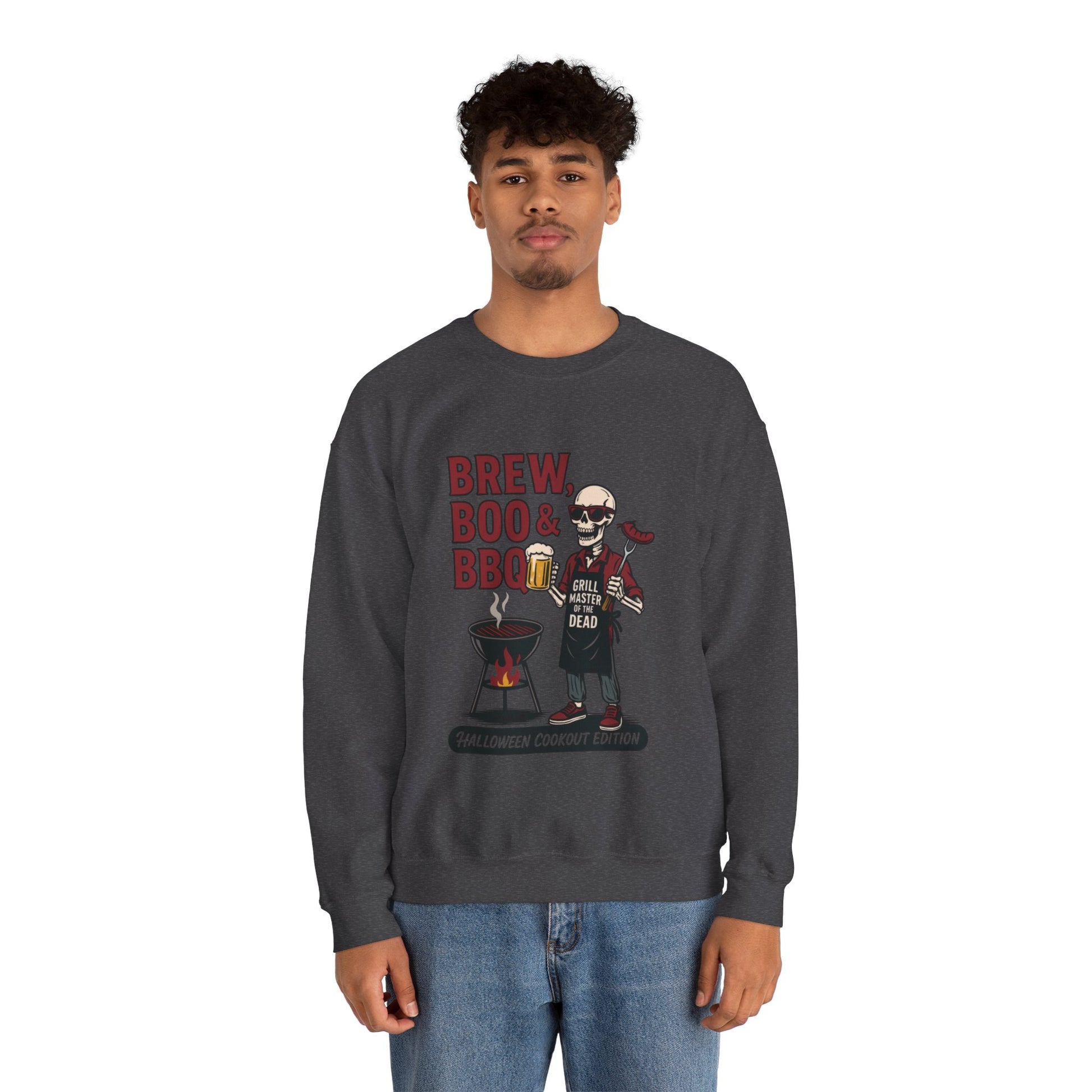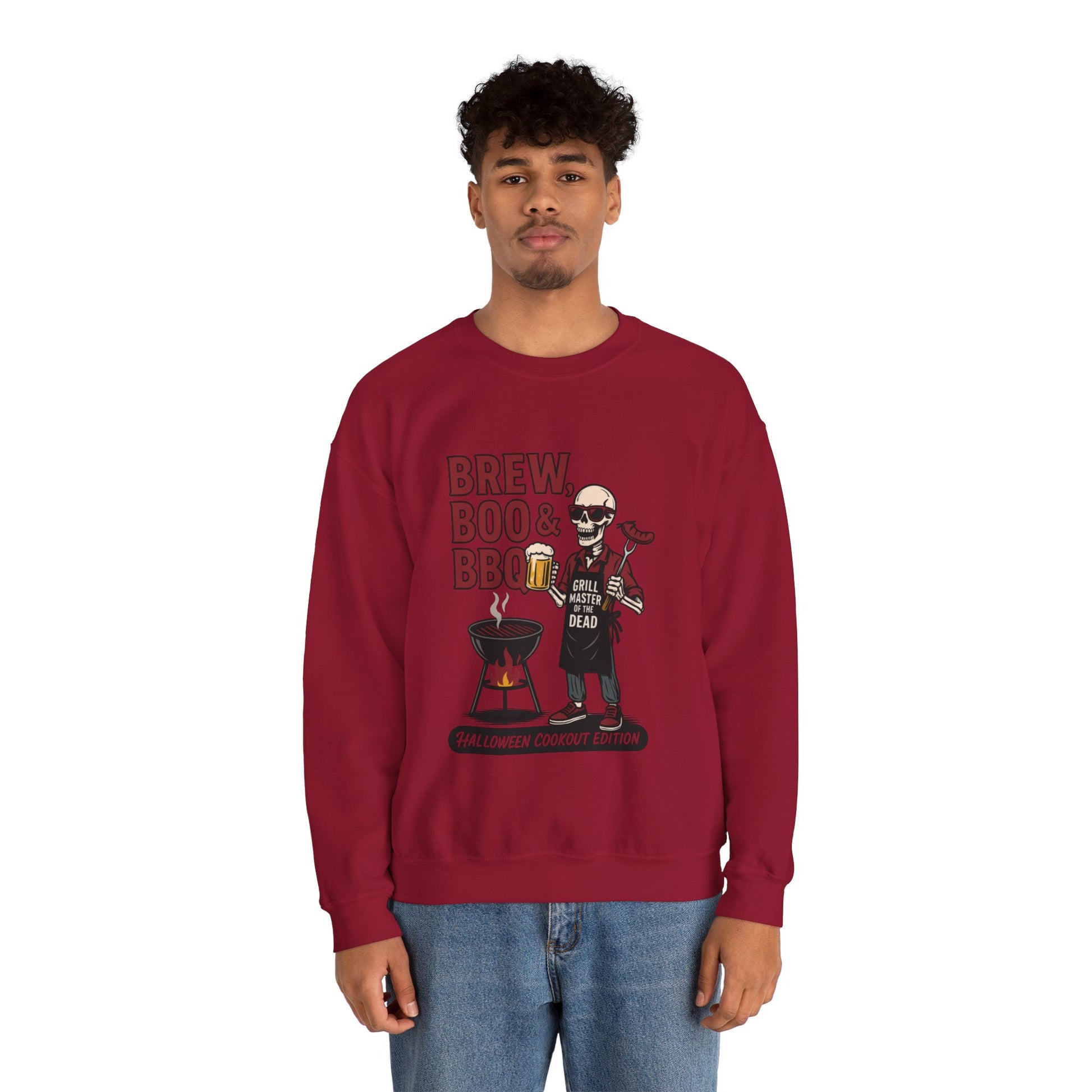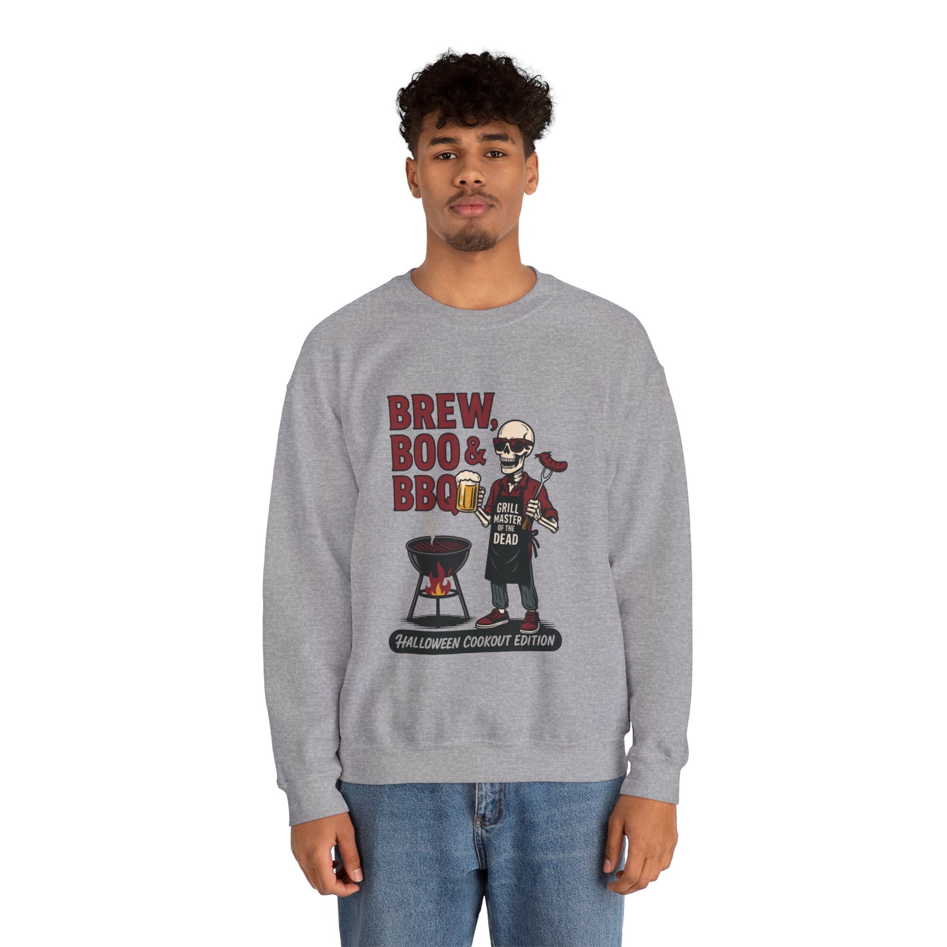 Halloween BBQ Men's Sweatshirt, Brew Boo & BBQ Skeleton Grill Master, Spooky Dad Gift, Skeleton Dad Sweat, Grill Master Crew