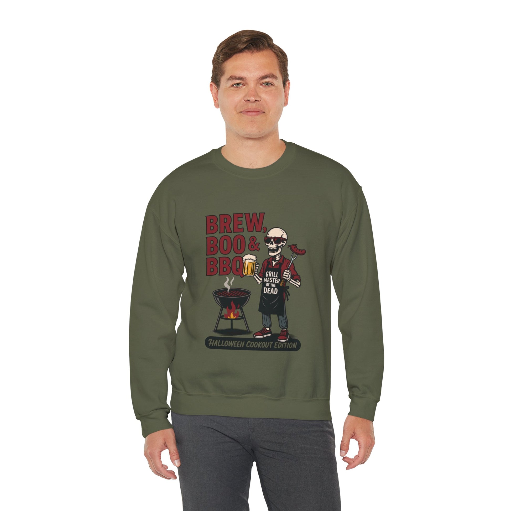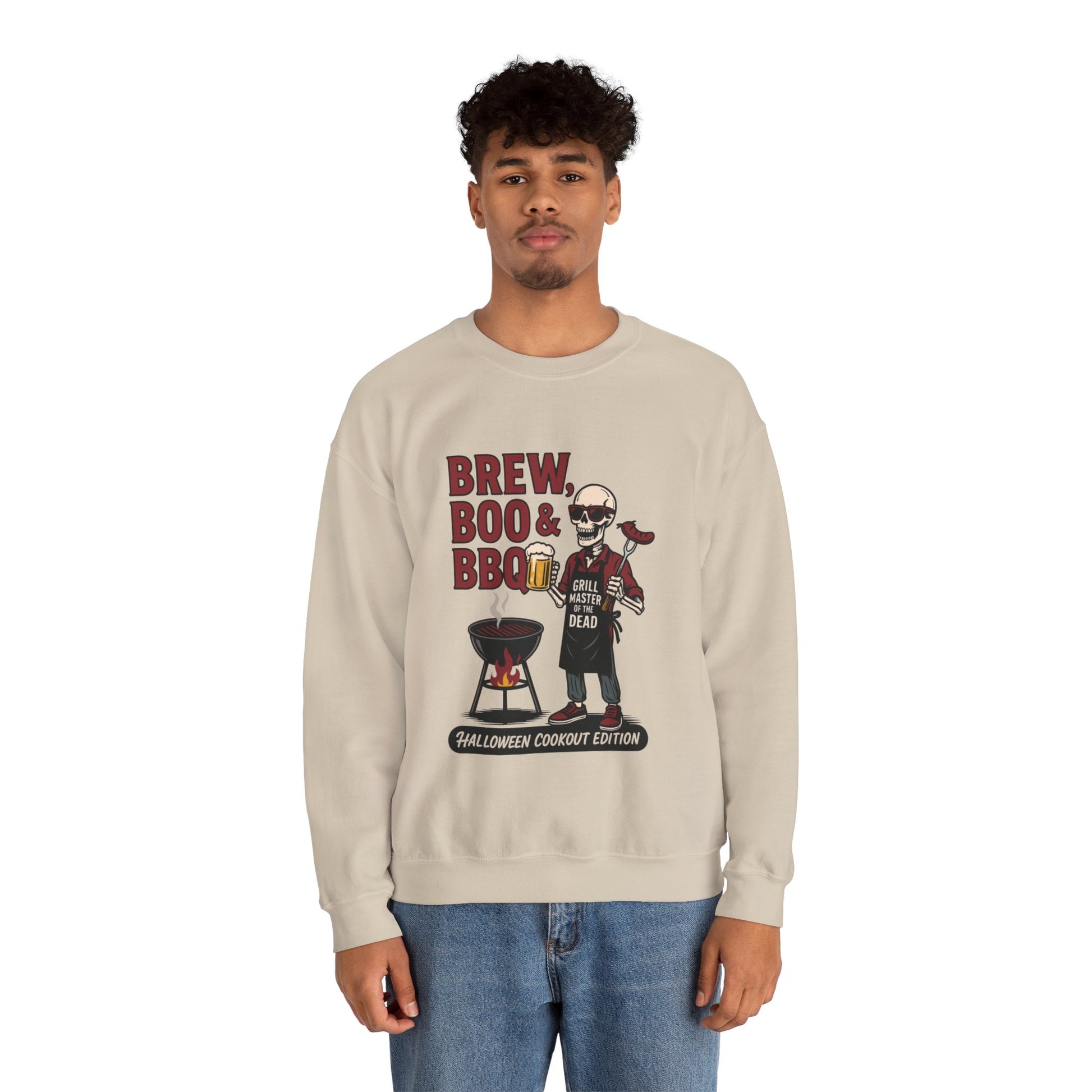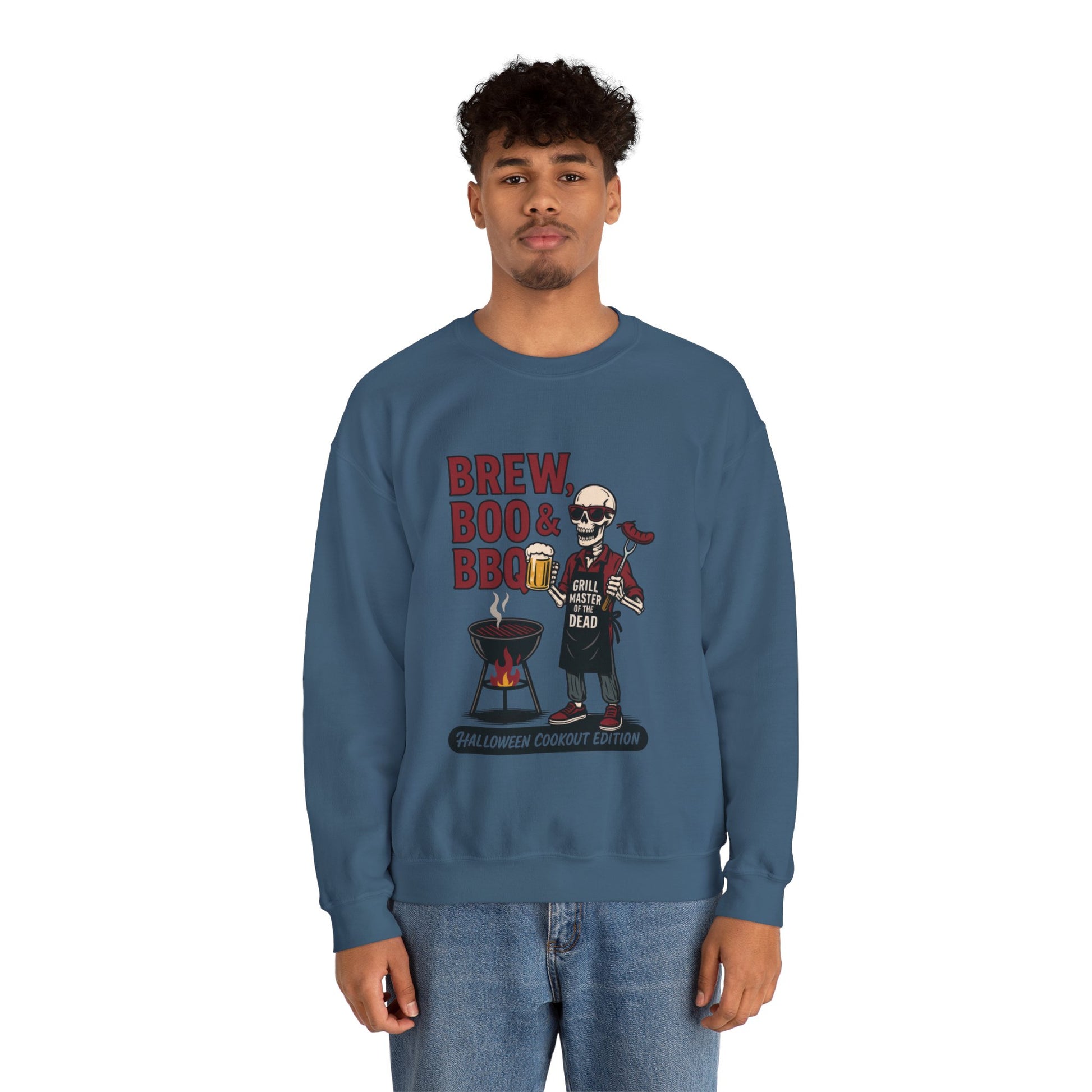 Halloween BBQ Men's Sweatshirt, Brew Boo & BBQ Skeleton Grill Master, Spooky Dad Gift, Skeleton Dad Sweat, Grill Master Crew