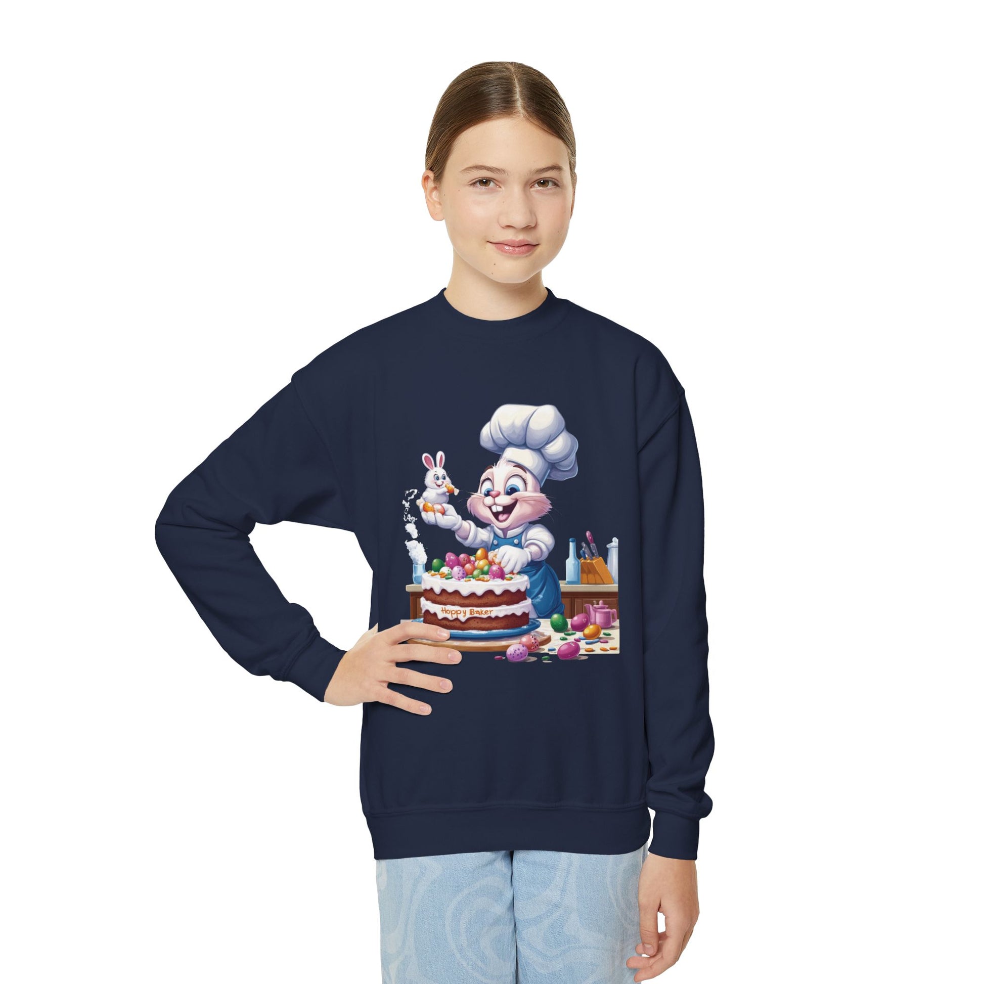 Hoppy Baker Easter Bunny Youth Sweatshirt - Cute Spring Crewneck for Kids with Chef Bunny and Cake, Fun Holiday Gift for Easter Lovers