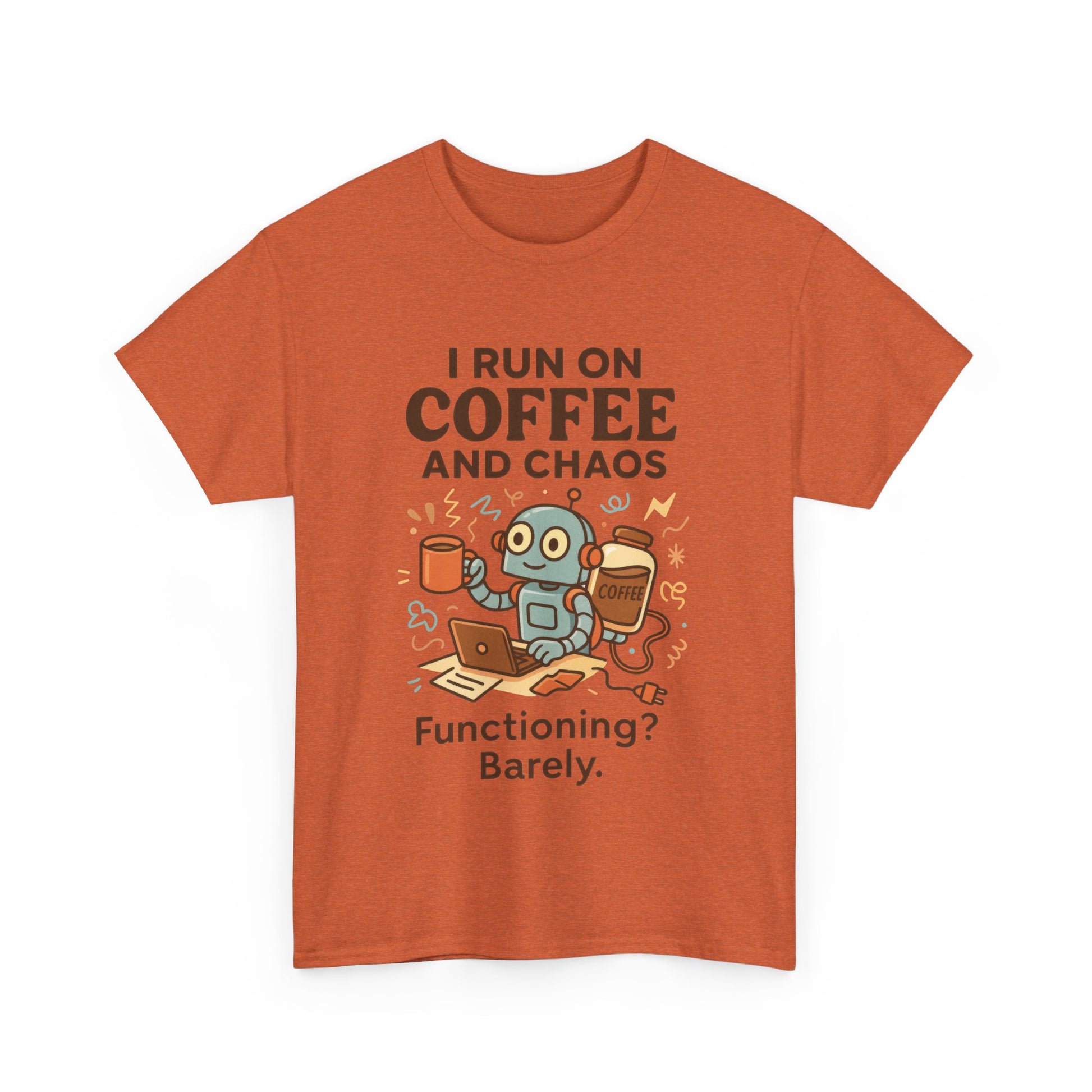 Introducing a stylish Unisex Heavy Cotton Tee that effortlessly merges comfort and personality. Made from high-quality, smooth fabric, this tee is perfect for anyone who wants to showcase their quirky side. With a playful design that exclaims 'I RUN ON COFFEE AND CHAOS,' it's an excellent conversation starter for casual hangouts or relaxed work days. The classic fit serves all body types, making it an ideal gift for coffee lovers, busy professionals, or students. This versatile tee is perfect for holidays, birthdays, or just because, bringing joy and a smile to anyone's day. Pair it with jeans for a laid-back look or dress it up with a jacket for a semi-formal vibe. Celebrate the daily grind with style! Product features - Shoulder tape for stability and durability. - Seamless design reduces fabric waste and enhances aesthetics. - Ribbed knit collar maintains shape with high elasticity. - Durable fabric perfect for printing, ethically sourced. - Tear-away label for maximum comfort and no irritation. Care instructions - Non-chlorine: bleach as needed - Do not iron - Do not dryclean - Machine wash: cold (max 30C or 90F) - Tumble dry: low heat