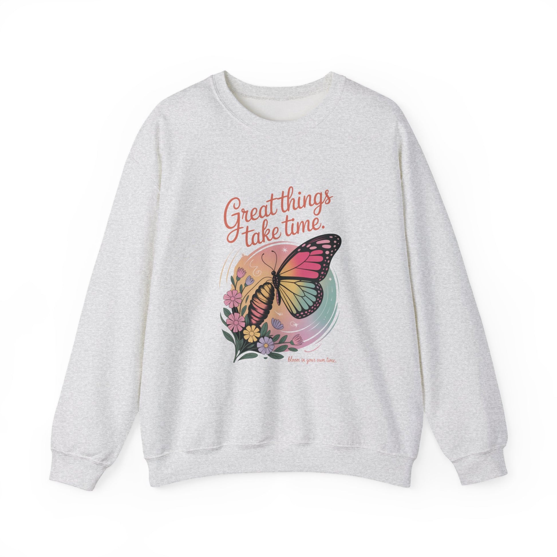 Embrace comfort and a positive mindset with this cozy Unisex Heavy Blend™ Crewneck Sweatshirt. Adorned with a vibrant butterfly design and an uplifting message, "Great things take time," this sweatshirt radiates a warm, encouraging vibe perfect for cooler days. Ideal for both casual outings and cozy nights in, it effortlessly fits into any wardrobe. This garment is perfect for adults who appreciate comfort along with a hint of inspiration. A great fit for various occasions such as casual hangouts, birthdays, or simply when one needs a gentle reminder to be patient. Celebrate life’s little moments and milestones with this unique piece, making it an excellent choice for gifts or personal wear during holidays like Mother's Day and Thanksgiving. Product features - Made from a medium-heavy blend of 50% cotton and 50% polyester for warmth and comfort. - Unique design features a vibrant butterfly and inspirational quote that brightens the day. - Double-needle stitching for superior durability and long-lasting wear. - Ethically produced using US-grown cotton and OEKO-TEX-certified dyes for environmental consciousness. - Ribbed collar for a superior fit that retains its shape through washes. Care instructions - Machine wash: cold (max 30C or 90F) - Non-chlorine: bleach as needed - Tumble dry: low heat - Do not iron - Do not dryclean