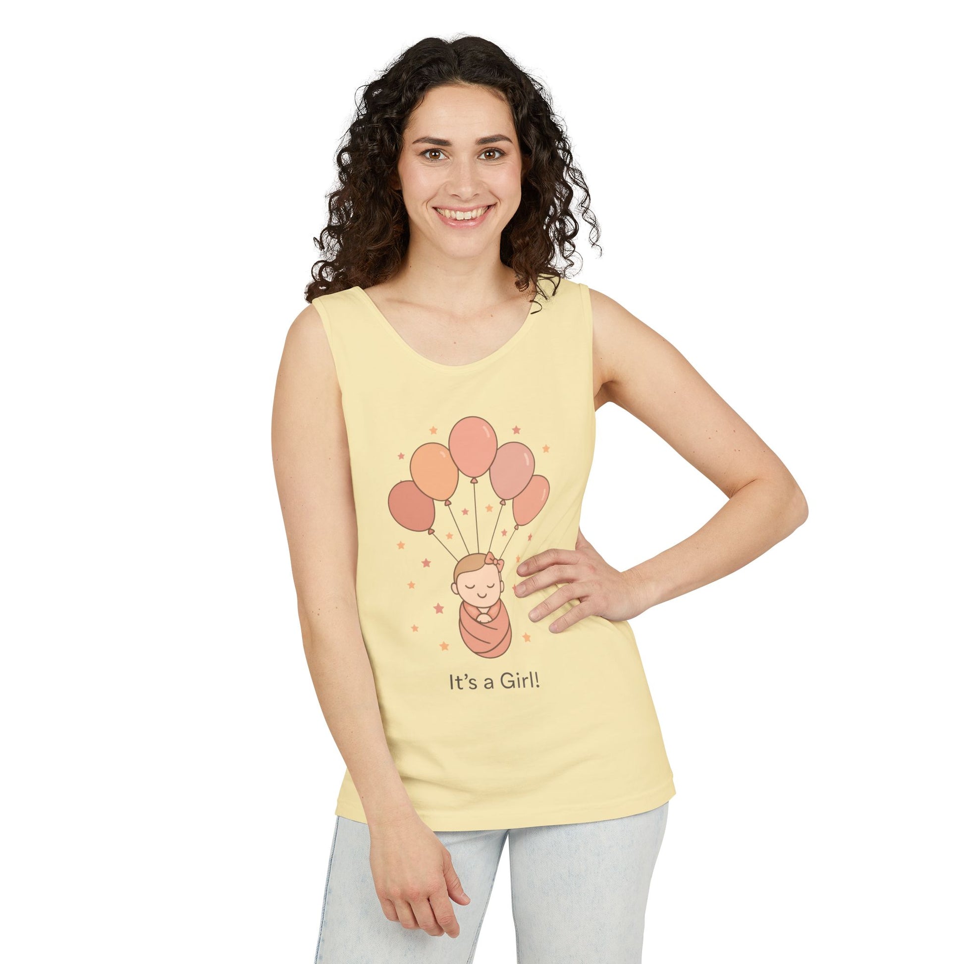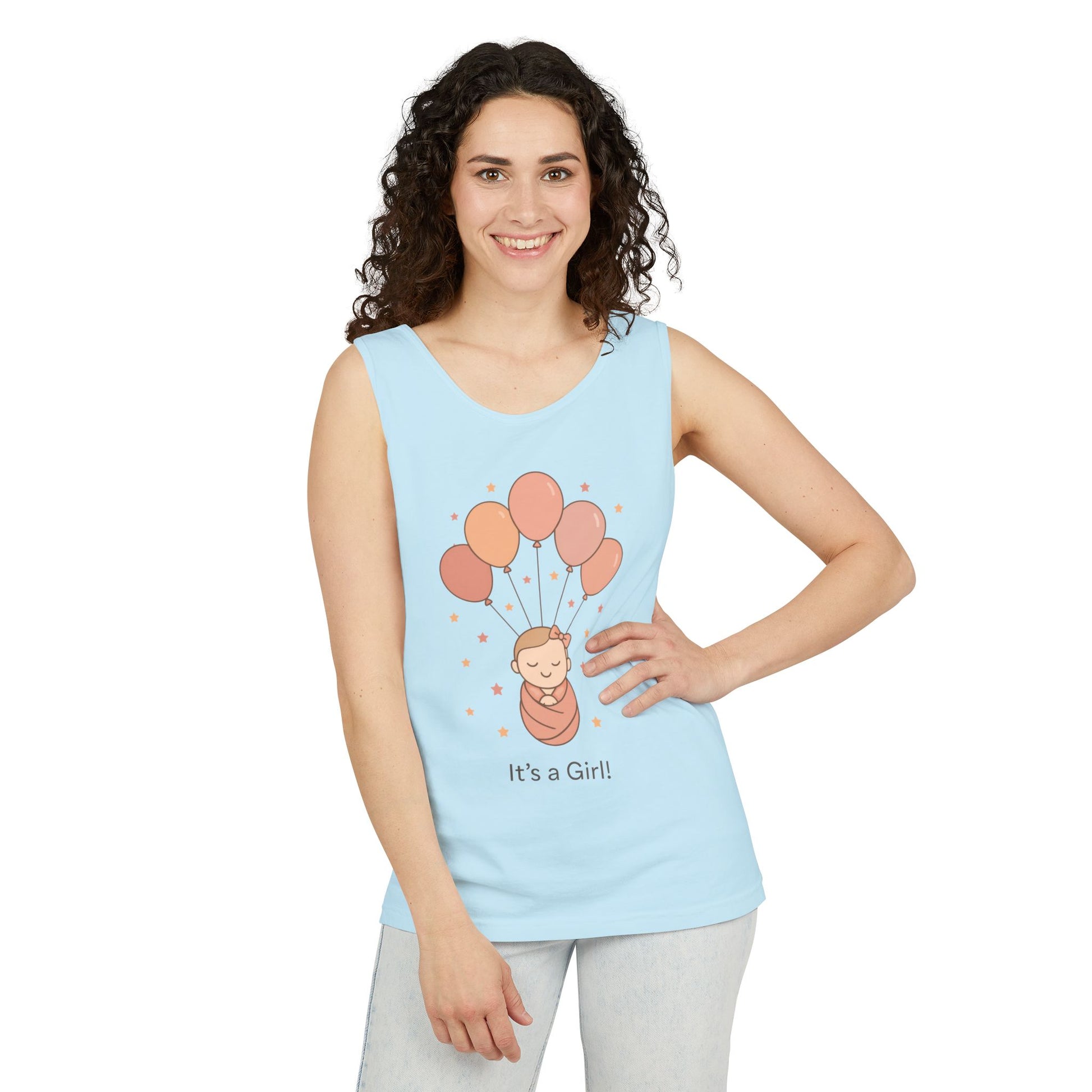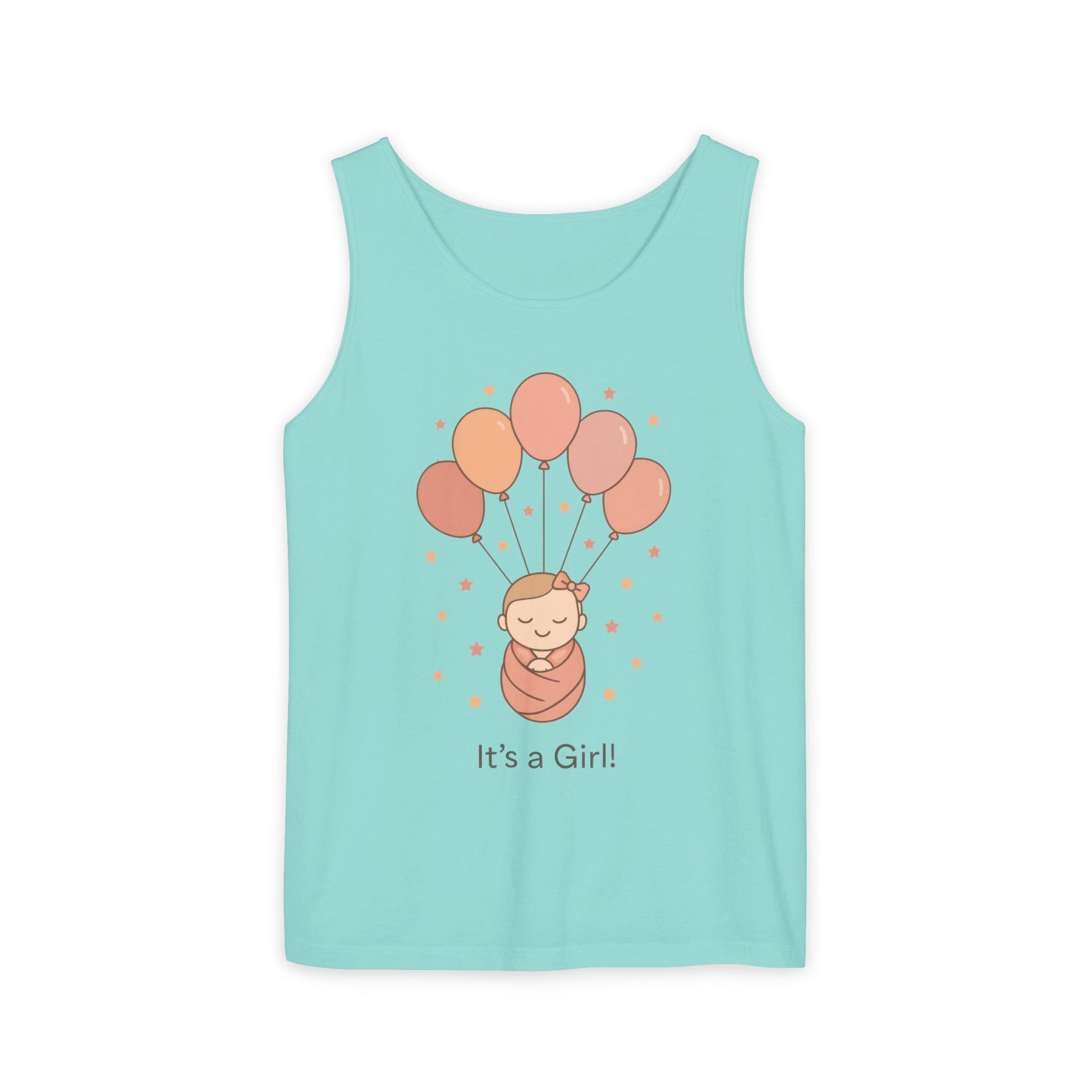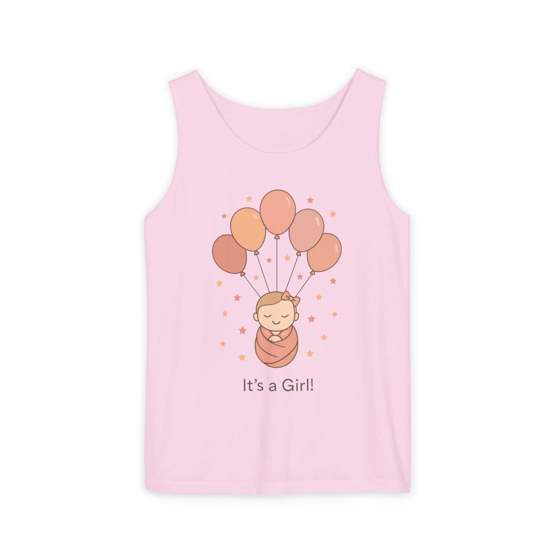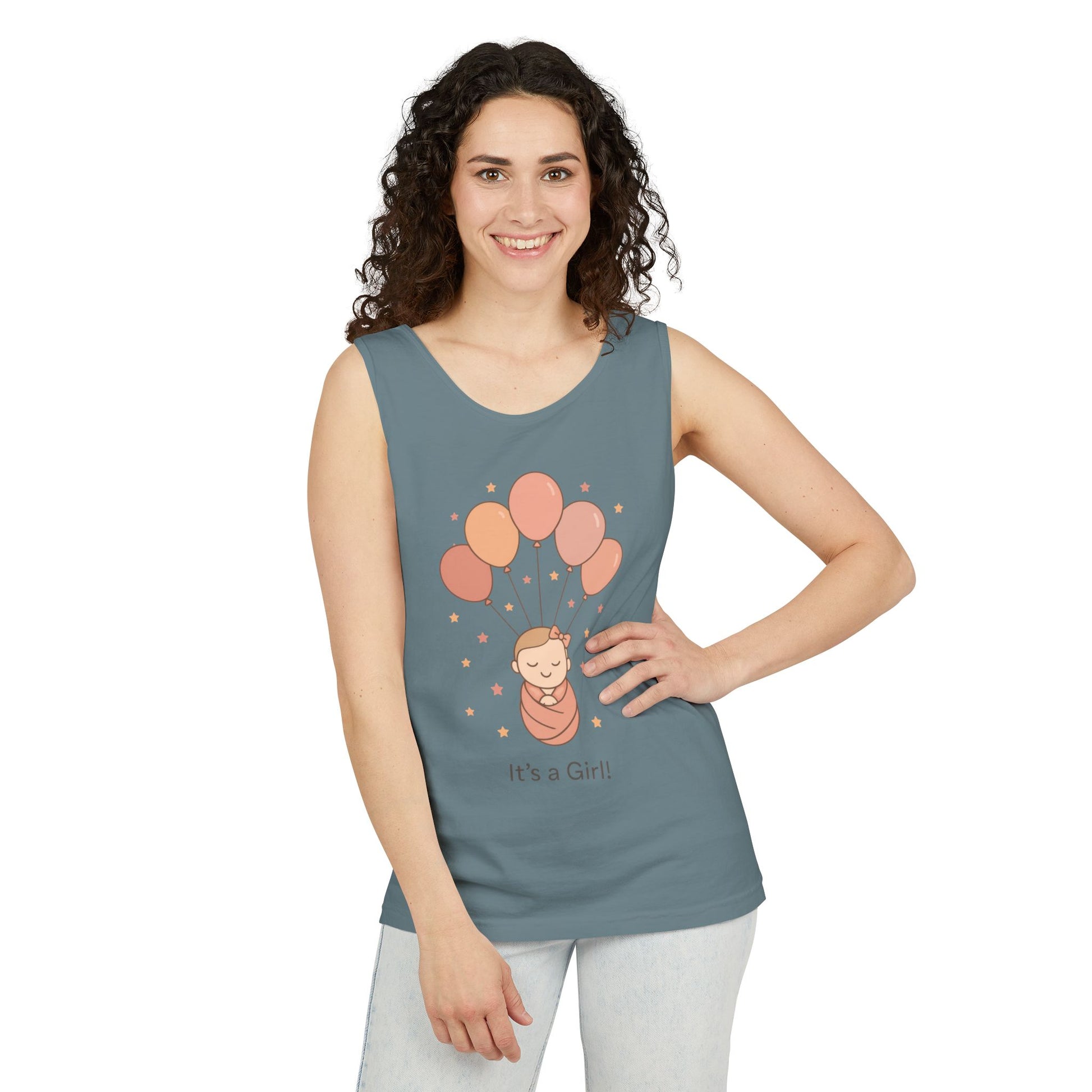 Celebrate new beginnings with this charming unisex garment-dyed tank top! Featuring a delightful design of a baby with balloons, it exudes a joyful and whimsical vibe, perfect for those special moments and celebrations in life. Ideal for baby showers or gender reveal parties, this tank top is a must-have wardrobe addition for parents and friends looking to express their excitement. Its relaxed fit makes it a comfortable choice for warm days and social gatherings, ensuring you look cheerful while feeling at ease. Gift this lovely tank to anyone welcoming a new baby into their family—it’s a great way to commemorate the occasion! Product features - 100% Ring spun cotton for a strong and smooth fabric, perfect for printing. - Self fabric binding for a streamlined and cohesive look. - Without side seams for a more attractive finish and reduced fabric waste. - Garment-dyed fabric offering a unique softness and texture. - Medium fabric weight (6.1 oz/yd²) ensures durability and comfort. Care instructions - Machine wash: cold (max 30C or 90F) - Non-chlorine: bleach as needed - Tumble dry: low heat - Iron, steam or dry: low heat - Do not dryclean