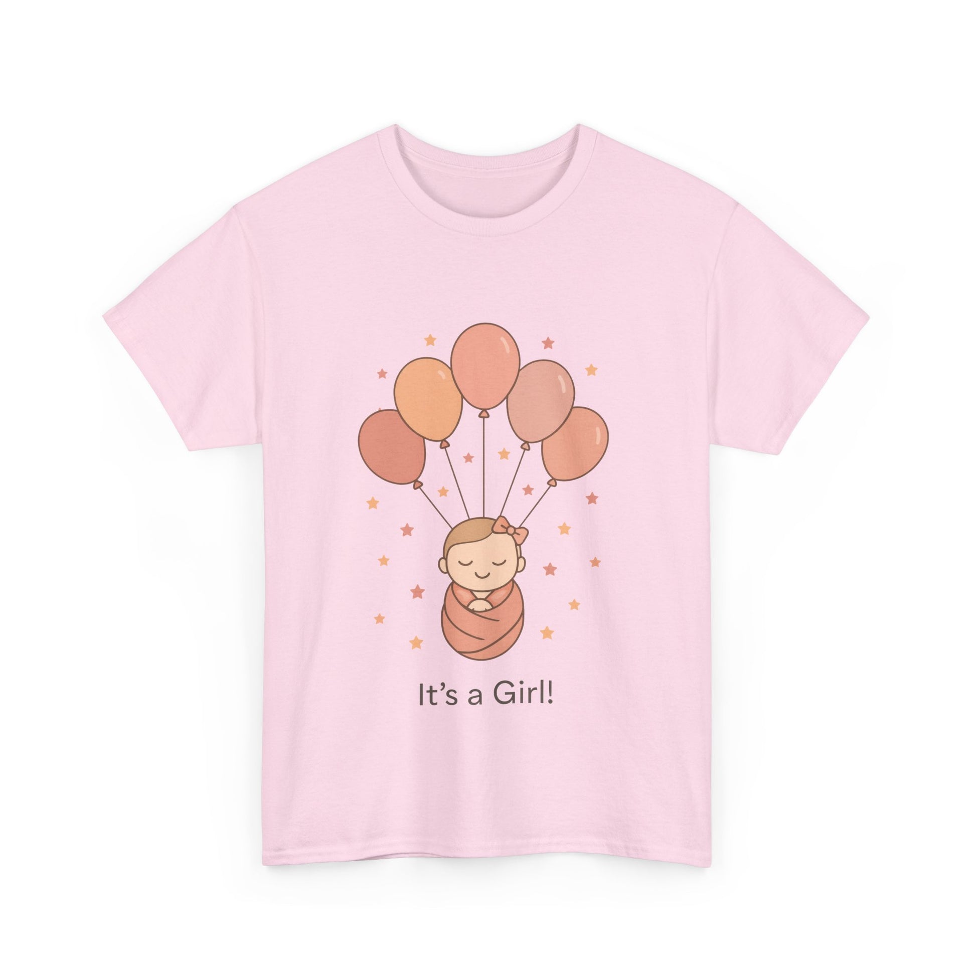 Celebrate the joy of new beginnings with this stylish Unisex Heavy Cotton Tee. Featuring a charming design that announces "It's a Girl!" with adorable balloons, this tee instantly uplifts your mood. It’s perfect for family gatherings, baby showers, and welcoming parties, making it a must-have for new parents, friends, and family members. The soft and durable fabric ensures you remain comfortable while you celebrate life’s precious moments. It’s an ideal gift for those embarking on the wonderful journey of parenthood, perfect for any occasion where love and excitement fill the air. Product features - Shoulder tape provides stability and prevents stretching. - Seamless design reduces waste and enhances appearance. - Ribbed knit collar maintains its shape beautifully. - Made from strong, smooth fabric ideal for printing. - Comfortable, classic fit perfect for every casual occasion. Care instructions - Non-chlorine: bleach as needed - Do not iron - Do not dryclean - Machine wash: cold (max 30C or 90F) - Tumble dry: low heat