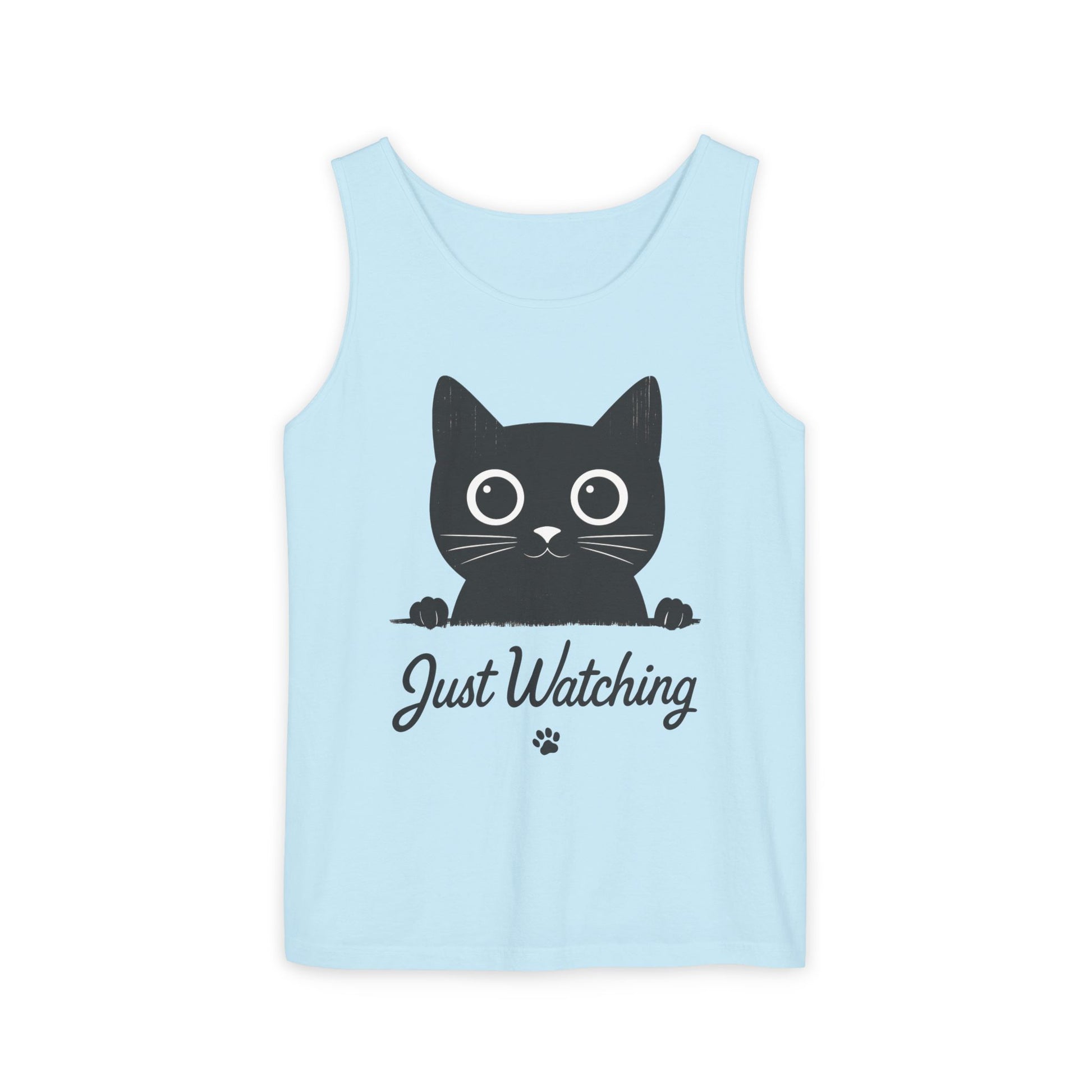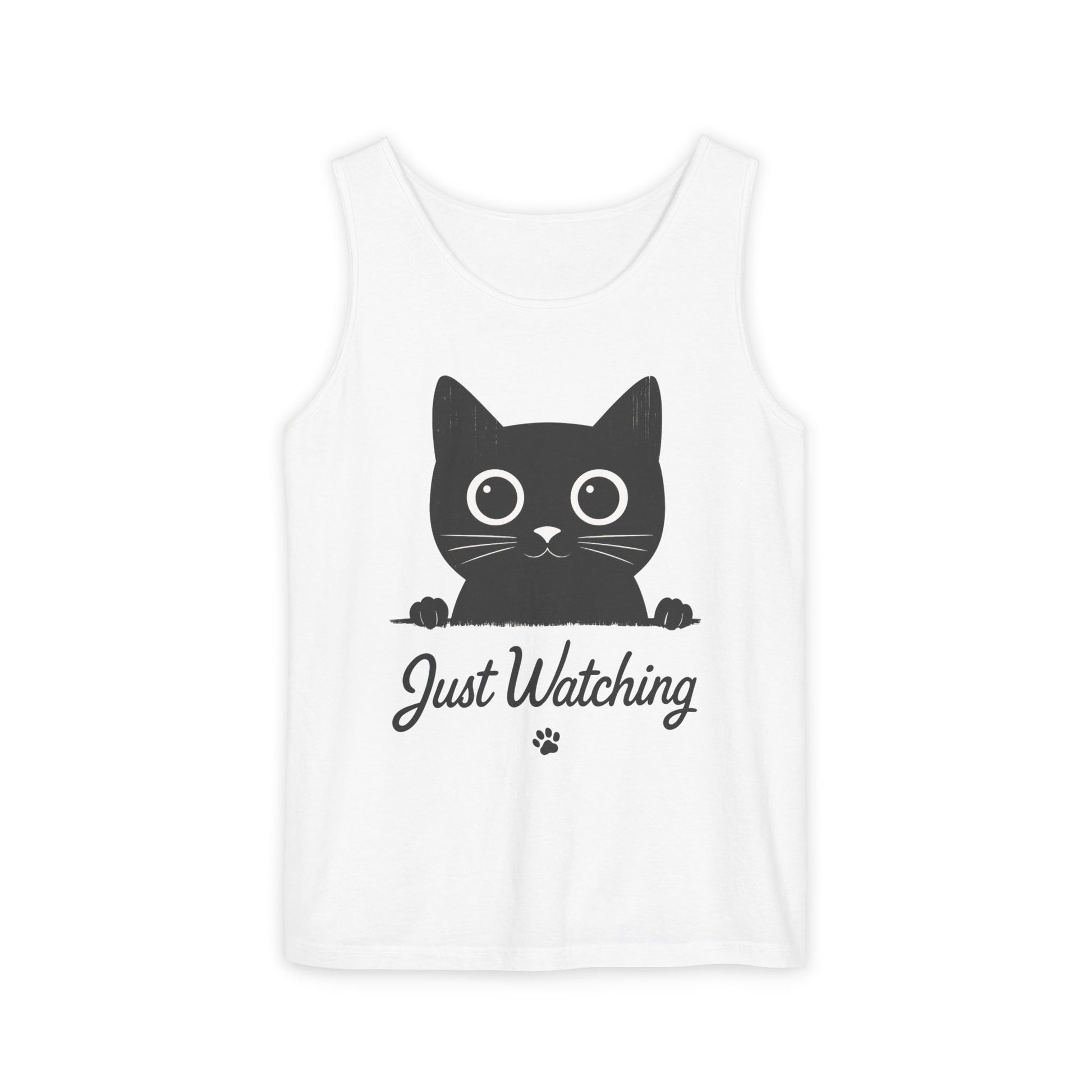This unisex garment-dyed tank top embodies a playful charm, perfect for cat lovers and casual occasions. Featuring an adorable graphic design featuring a watchful kitty, it brings a lighthearted vibe to your summer wardrobe. The relaxed fit and soft texture make it a comfortable choice for lounging at home, running errands, or enjoying outdoor gatherings. Ideal for warm weather, this tank top is great for beach trips, picnics, and casual outings. Perfect as a gift for birthdays, holidays, or just because, it resonates with anyone who appreciates whimsy and fun. Product features - 100% ring-spun cotton for a soft and strong fabric. - Self-fabric binding for a neat finish with seamless style. - Without side seams, creating a sleek and attractive look. - Garment-dyed for unique softness and vibrant color. - Relaxed fit ideal for comfort during warm days. Care instructions - Machine wash: cold (max 30C or 90F) - Non-chlorine: bleach as needed - Tumble dry: low heat - Iron, steam or dry: low heat - Do not dryclean