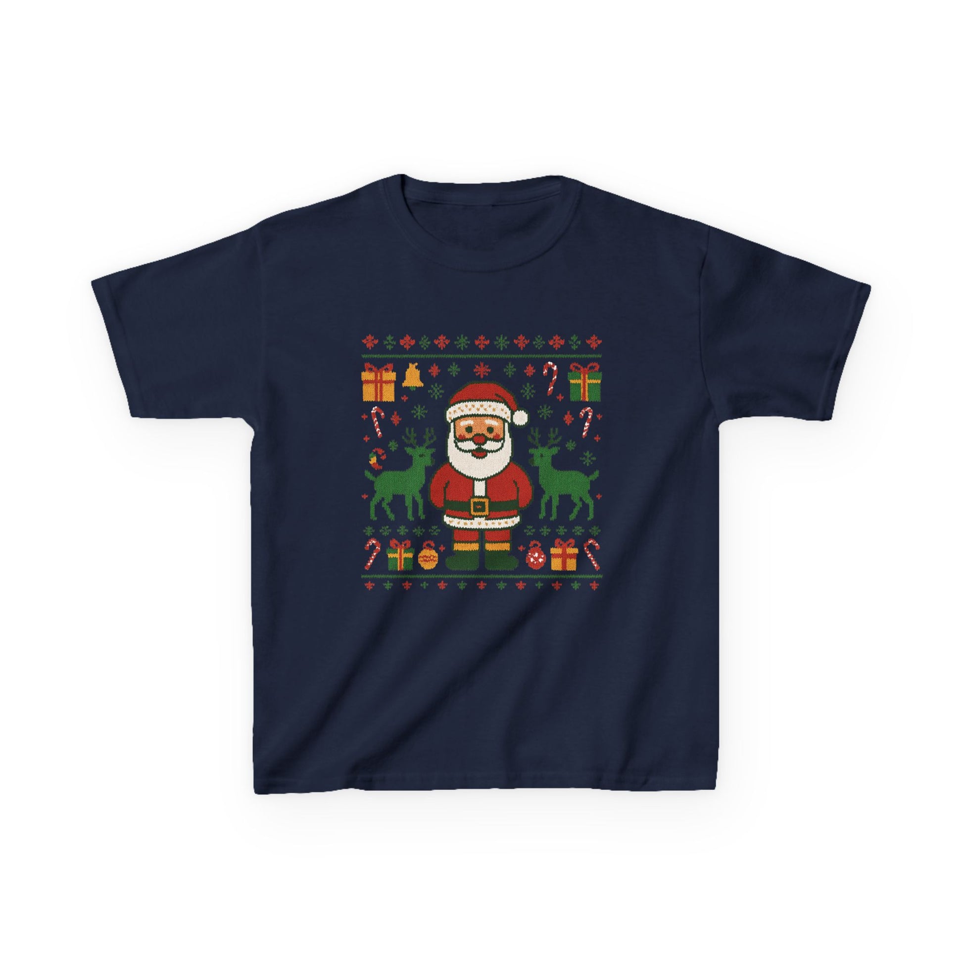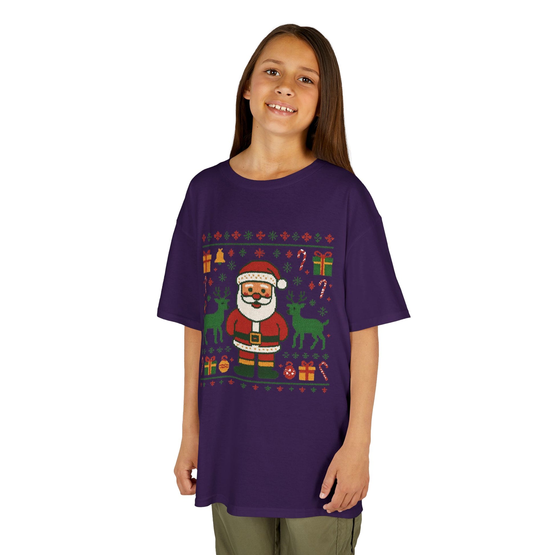 Make Christmas extra cheerful with this adorable Santa knit-style shirt! Featuring Santa, reindeer, and gifts — perfect for kids’ holiday outfits and family photos. The kids heavy cotton tee is perfect for everyday use. The fabric is 100% cotton for solid colors. Polyester is included for heather-color variants. These fabrics are prime materials for printing. The shoulders have twill tape for improved durability. The collar is curl resistant due to ribbed knitting. There are no seams along the sides. Disclaimer: - Due to the fabric properties, the White color variant may appear off-white rather than bright white. .: Made with 100%, midweight (5.3 oz/yd² (180 g/m²)), US cotton that feels soft to the touch and a great choice for any season. .: The crew neckline along with the tee's classic fit, deliver a timeless style that is perfect for daily use. .: All t-shirts come with pearlized, tear-away labels for total comfort and a scratch-free experience. .: Made using ethically grown and harvested US cotton. Gildan is also a proud member of the US Cotton Trust Protocol ensuring ethical and sustainable means of production. This blank tee is certified by Oeko-Tex for safety and quality assurance. .: Fabric blends: Heather colors - 50% cotton, 50% polyester, Sport Grey - 90% cotton, 10% polyester, Ash - 99% cotton, 1% polyester.