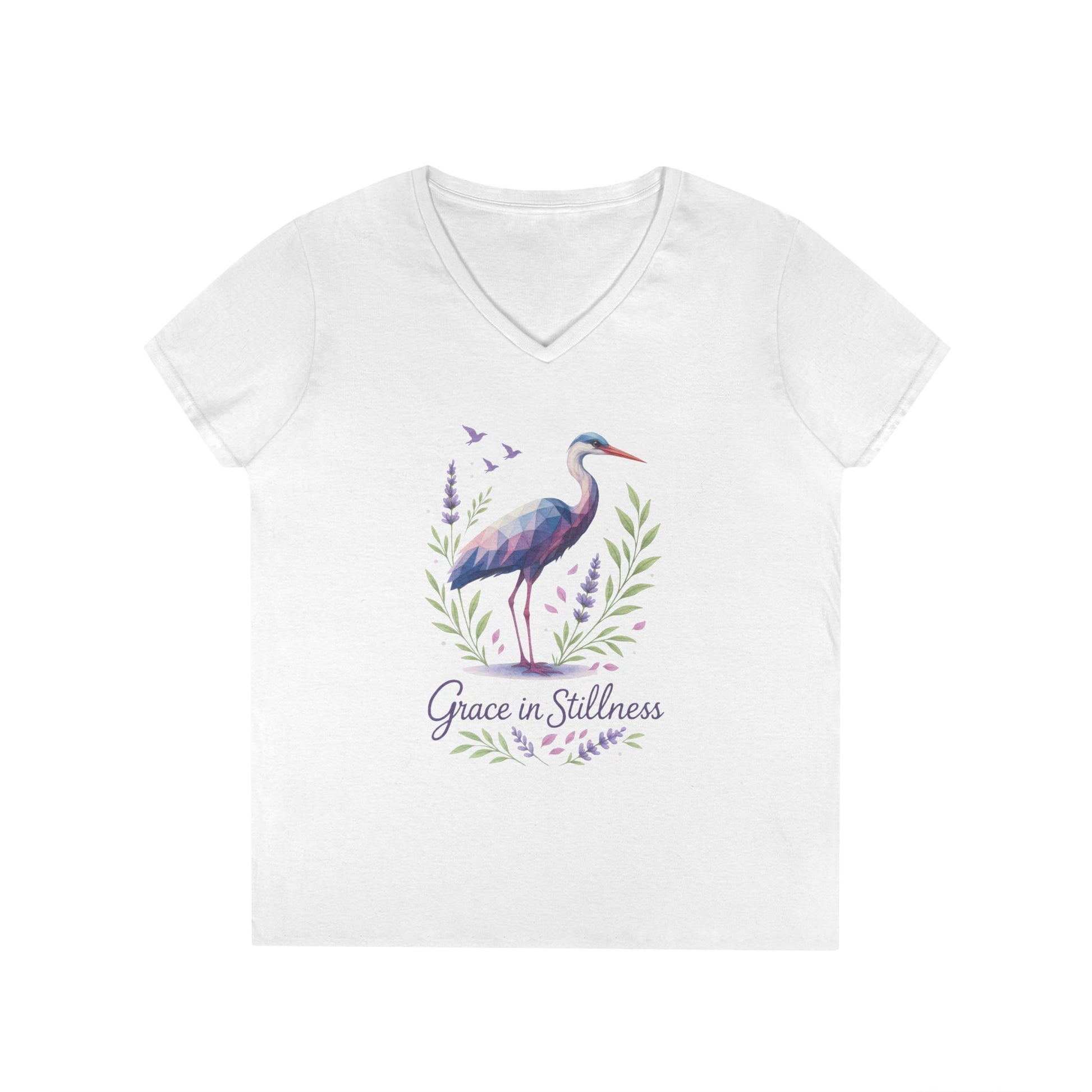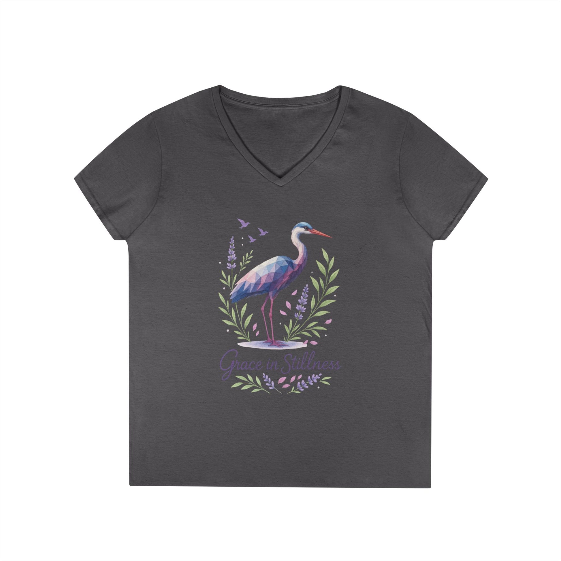 Ladies' V-Neck T-Shirt with Heron Design - Grace in Stillness, Relaxed Fit, Nature-Inspired Gift, Travel Tee, Summer Fashion