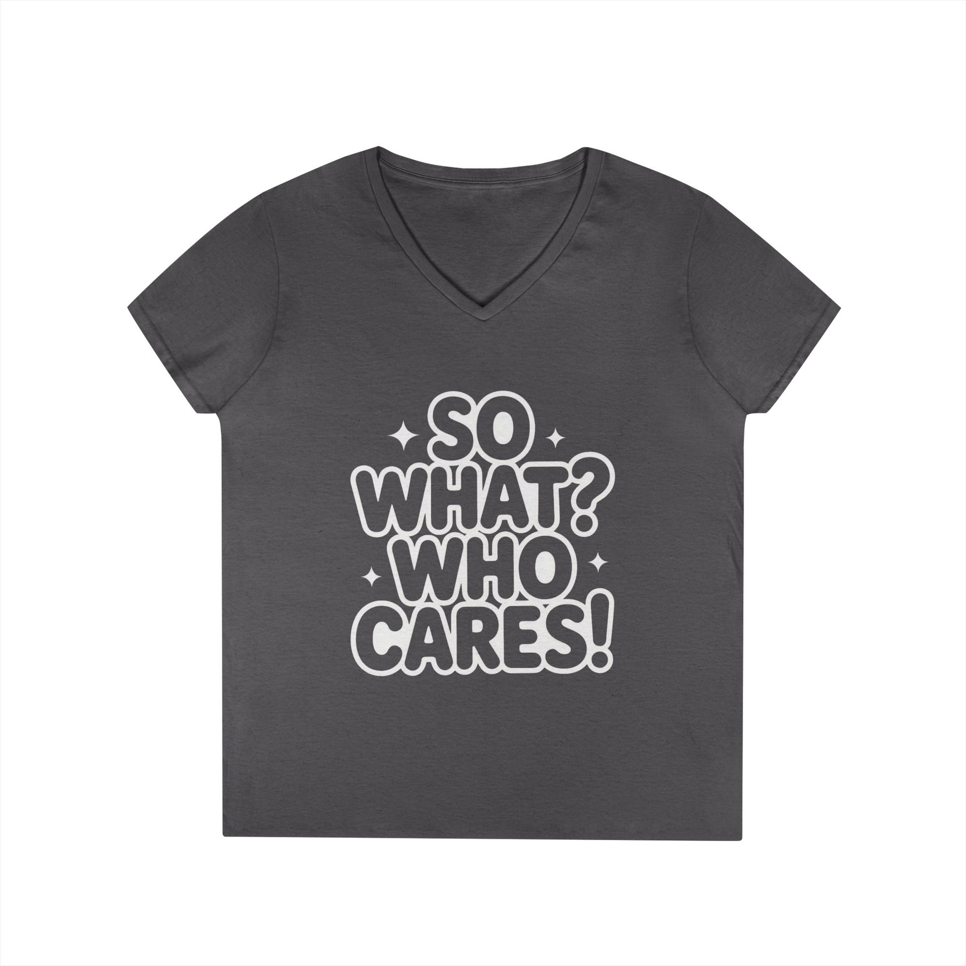 Ladies' V-Neck T-Shirt with 'So What? Who Cares!' Print, Casual Wear for Confident Souls, Funny Typography Shirt, Womens Sassy Graphic Tee