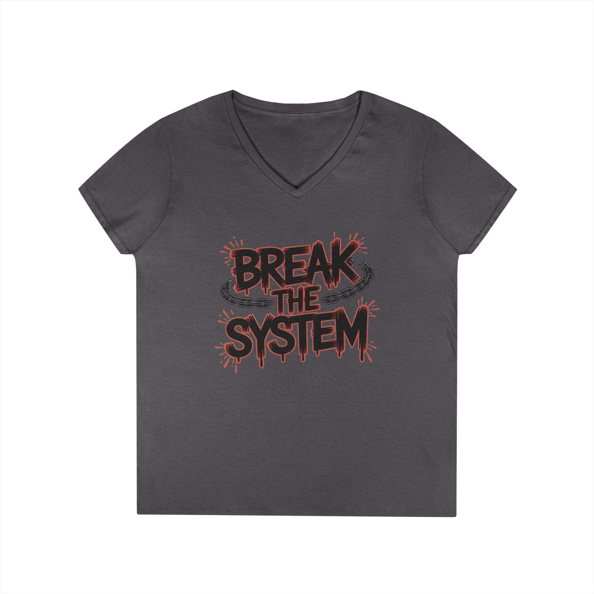 Ladies' V-Neck T-Shirt, Women's Graphic Tee, Break the System Shirt, Feminist Protest T-Shirt, Streetwear Gift for Her