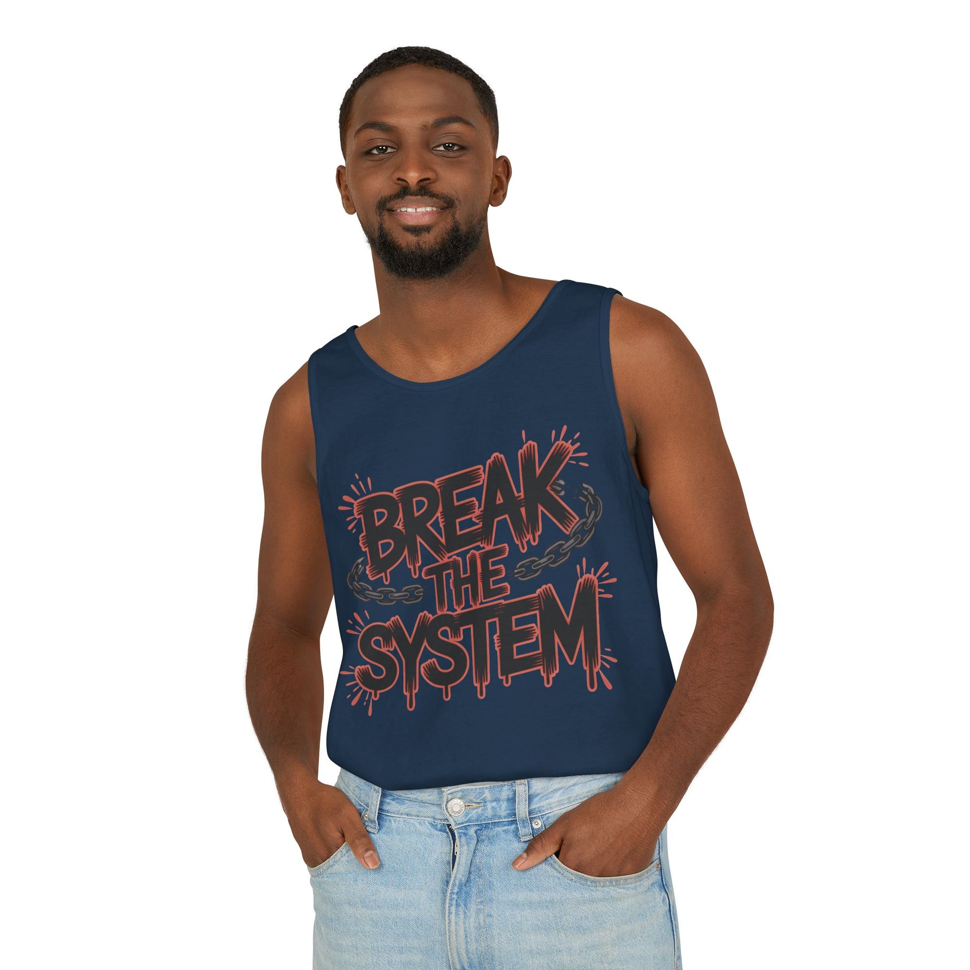 Men's Garment-Dyed Tank Top, Break the System Tank Top, Graphic Protest Muscle Tee, Streetwear Activist Summer Top