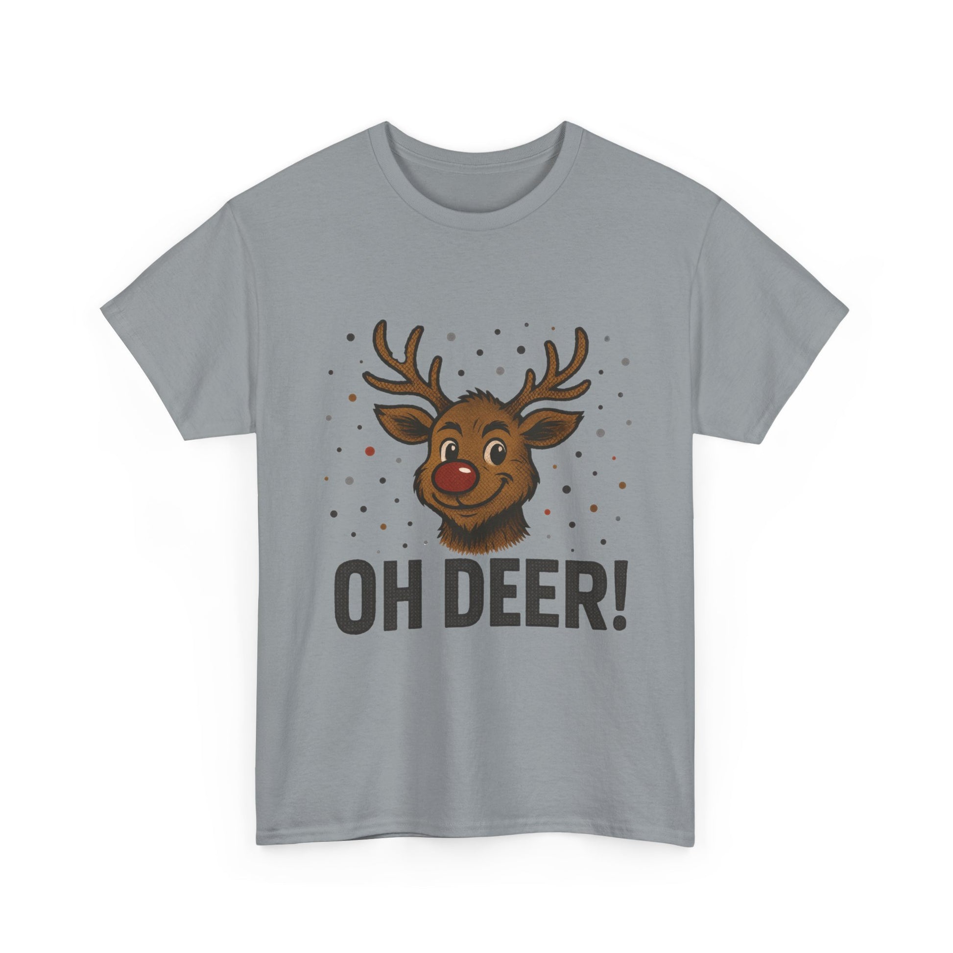 Bring humor to the holidays with this “Oh Deer!” men’s Christmas T-shirt. Featuring a cheerful reindeer graphic, it’s the perfect casual top for festive gatherings, Christmas parties, or as a fun holiday gift. Soft cotton comfort meets merry style! The Gildan 5000 heavy cotton tee is a dependable classic made for everyday wear and custom printing. Its 100% cotton fabric is tightly knit to give designs sharper detail and long-lasting color. The seamless body eliminates side seams for a smoother fit, while reinforced shoulders keep the shirt in shape through repeated washes. Durable, comfortable, and print-friendly, the Gildan 5000 is a trusted staple for personalized apparel. Disclaimer: - Due to the fabric properties, the White color variant may appear off-white rather than bright white. .: The Gildan 5000 is made with medium fabric (5.3 oz/yd² / 180 g/m²) consisting of 100% cotton, offering year-round comfort with lasting durability. .: The classic fit of this shirt ensures a comfy, relaxed wear while the crew neckline adds that neat, timeless look that can blend into any occasion, casual or semi-formal. .: The tear-away label means a scratch-free experience with no irritation or discomfort whatsoever. .: Made using 100% US cotton that is ethically grown and harvested. Gildan is also a proud member of the US Cotton Trust Protocol ensuring ethical and sustainable means of production. This blank tee is certified by Oeko-Tex for safety and quality assurance.
